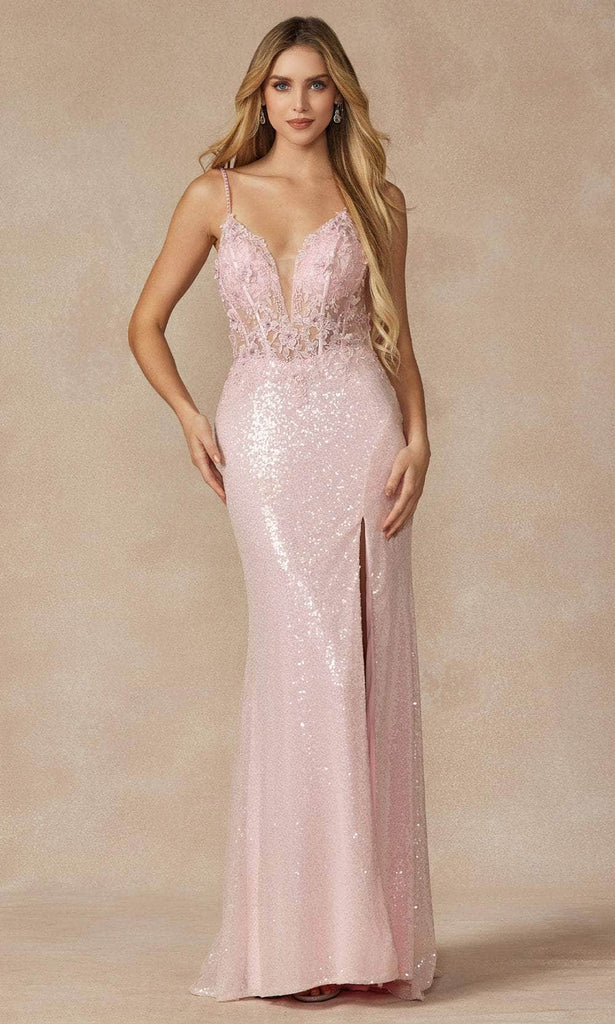 Express your unique persona classic sophistication in this Juliet Dresses 289 evening dress. This dress displays a plunging sweetheart neckline in a fitted and illusion bodice with spaghetti straps and corset boning features. The back shows a mid-open back with back zipper closure while the fully-sequin mermaid skirt highlights its leg slit and sweep train down to its full-length. Create a perfect evening wearing this Juliet Dresses 289 masterpiece. Models are wearing the Ice Pink, Red, and Sky Blue colors.