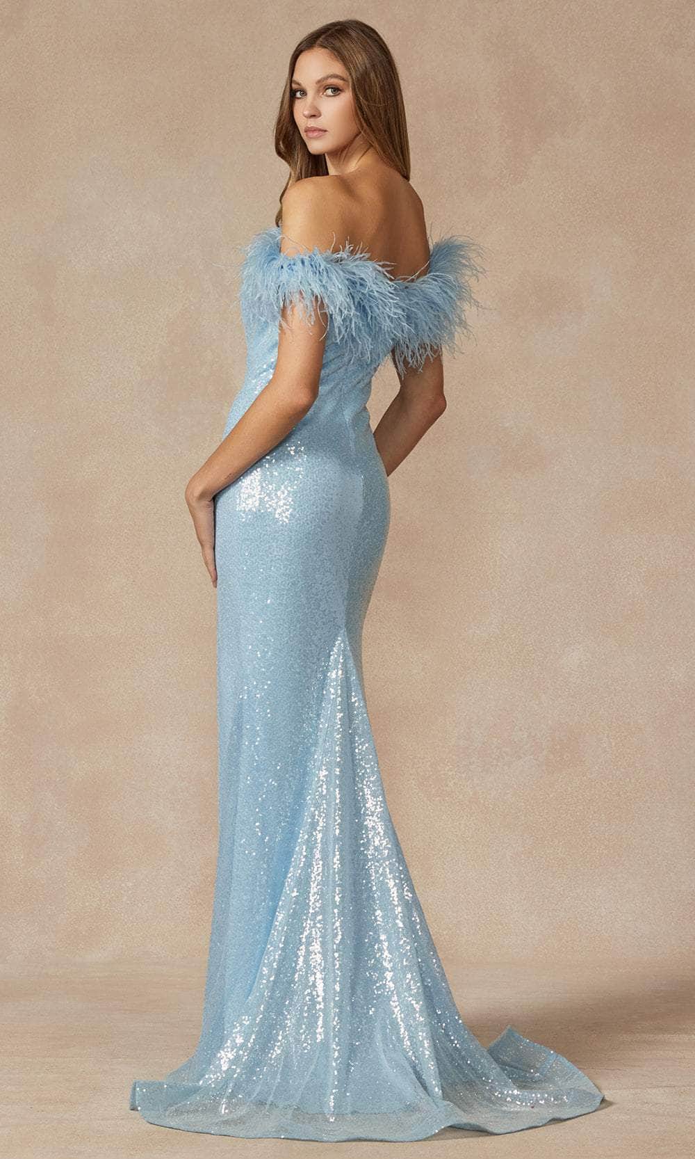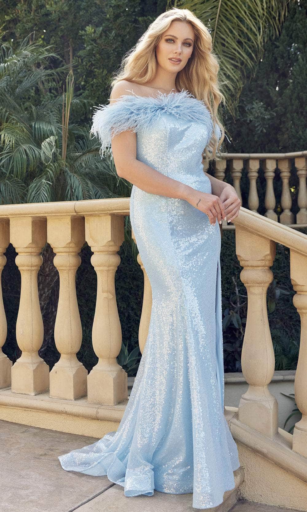 Dazzle in the Juliet Dresses 292, a masterpiece designed for unforgettable moments. This captivating fitted gown features a strapless design, and feather-trimmed in the off-shoulder neckline that exudes sophistication and drama. The shimmering sequin fabric catches the light with every movement, creating a dazzling effect that enhances the sleek sheath silhouette. The high slit offers a glimpse of leg while ensuring ease of movement. Make a bold fashion statement at your next special occasion with the 292. Models are wearing Ice Blue, Lilac, and Royal Blue colors.