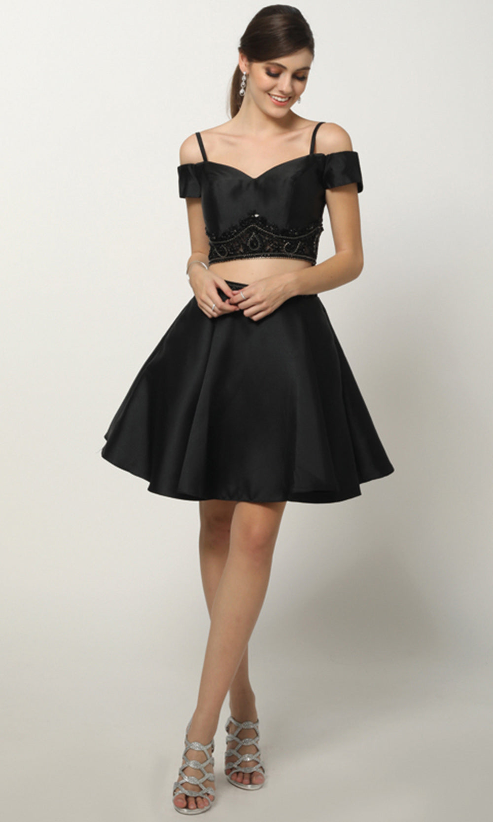 Youthful elegance takes the spotlight with Juliet Dresses 790, a short style created for festive occasions. The sweetheart neckline, thin straps and off shoulder sleeves highlights a flattering design, while beaded embellishments decorate the fitted bodice with brilliance. The natural waistline ensures a balanced shape as the skirt flares into an A-line silhouette that brings playful energy. Every element of this look combines style with comfort, making it perfect for nights of celebration. Juliet Dresses 790 delivers a blend of sophistication and charm that is easy to love. Models are wearing Black, Red, and Turquoise colors.