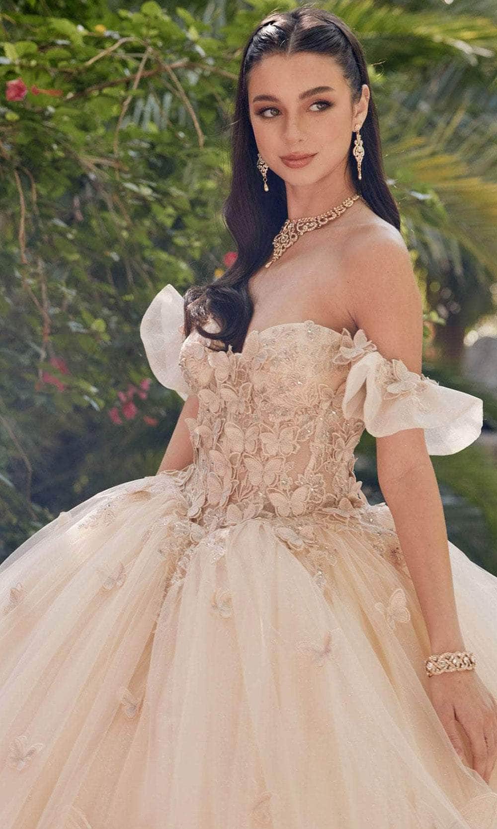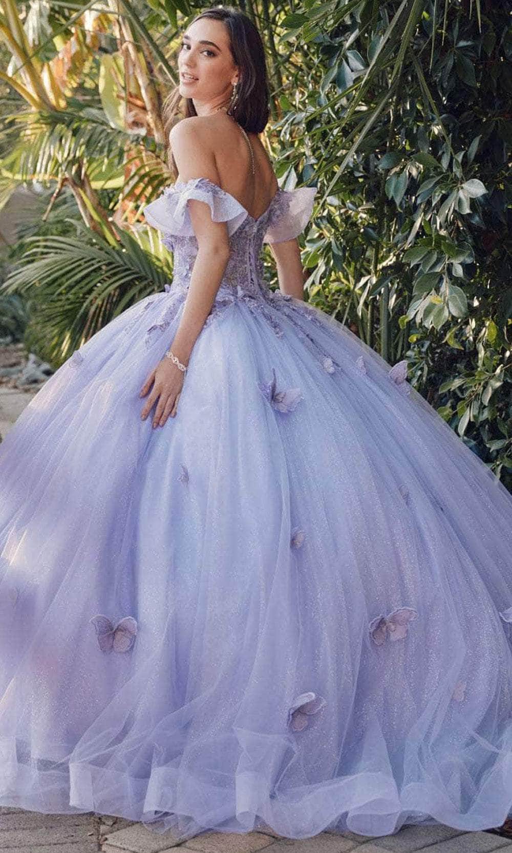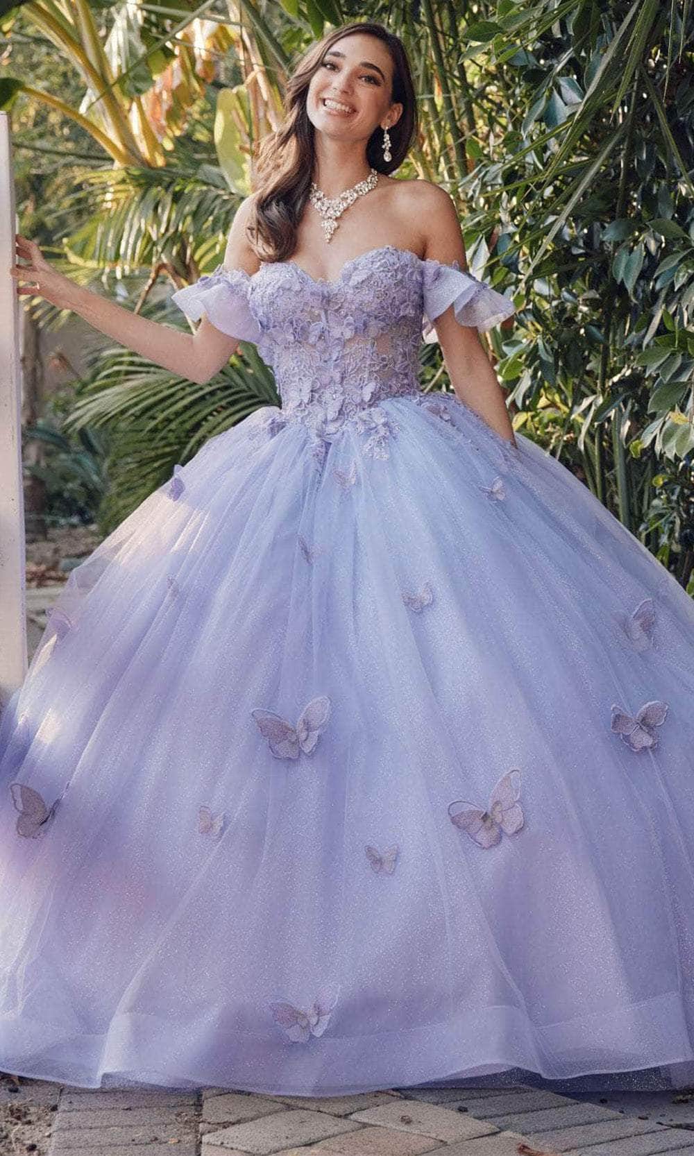 Orchestrate a beautiful entrance that screams extravagance in this Juliet Dresses JT1448J masterpiece. Every detail of this gown exudes opulence and beauty with its 3D butterfly appliques, embroidery and beadings adornment. The illusion corset boning bodice offers exceptional support, while the sweetheart neckline and off-shoulder flutter sleeve add a touch of romance. A lace-up tie closure at the open back lets you adjust the perfect fit. For a grandeur finish, the skirt bursts a voluminous ballgown silhouette and it streams beautifully to the sweeping train. Appear like a real-life princess in this Juliet Dresses JT1448J. Models are wearing Champagne, and Lilac colors.