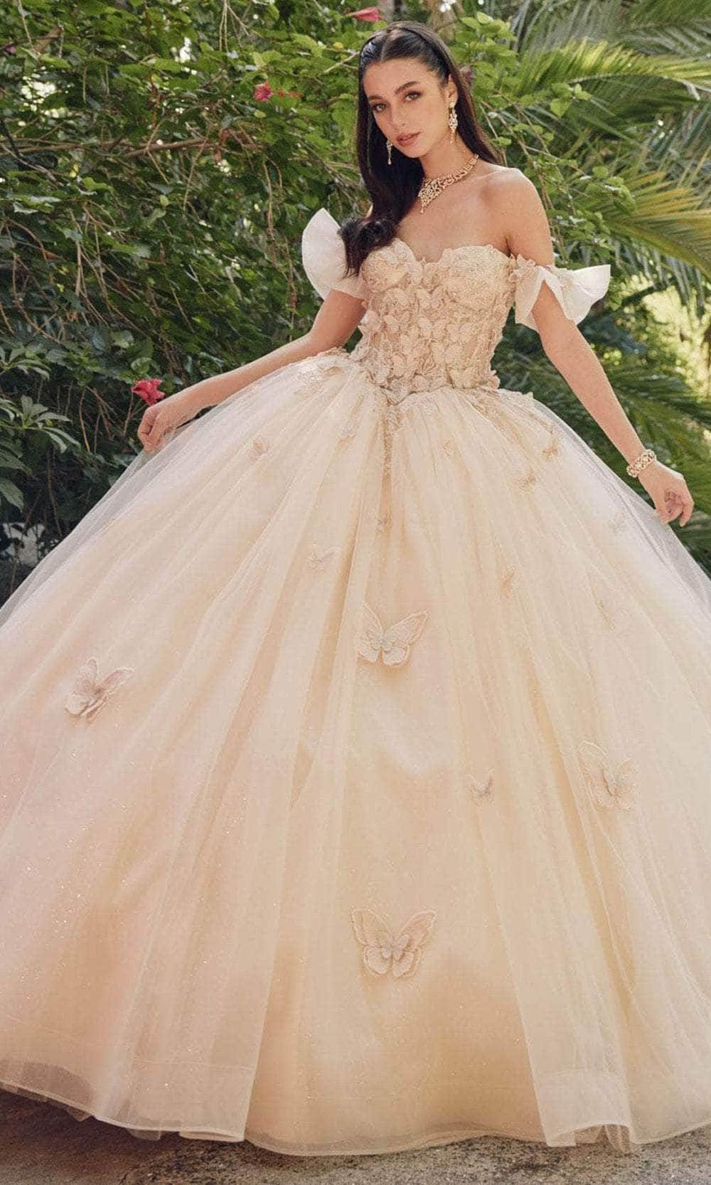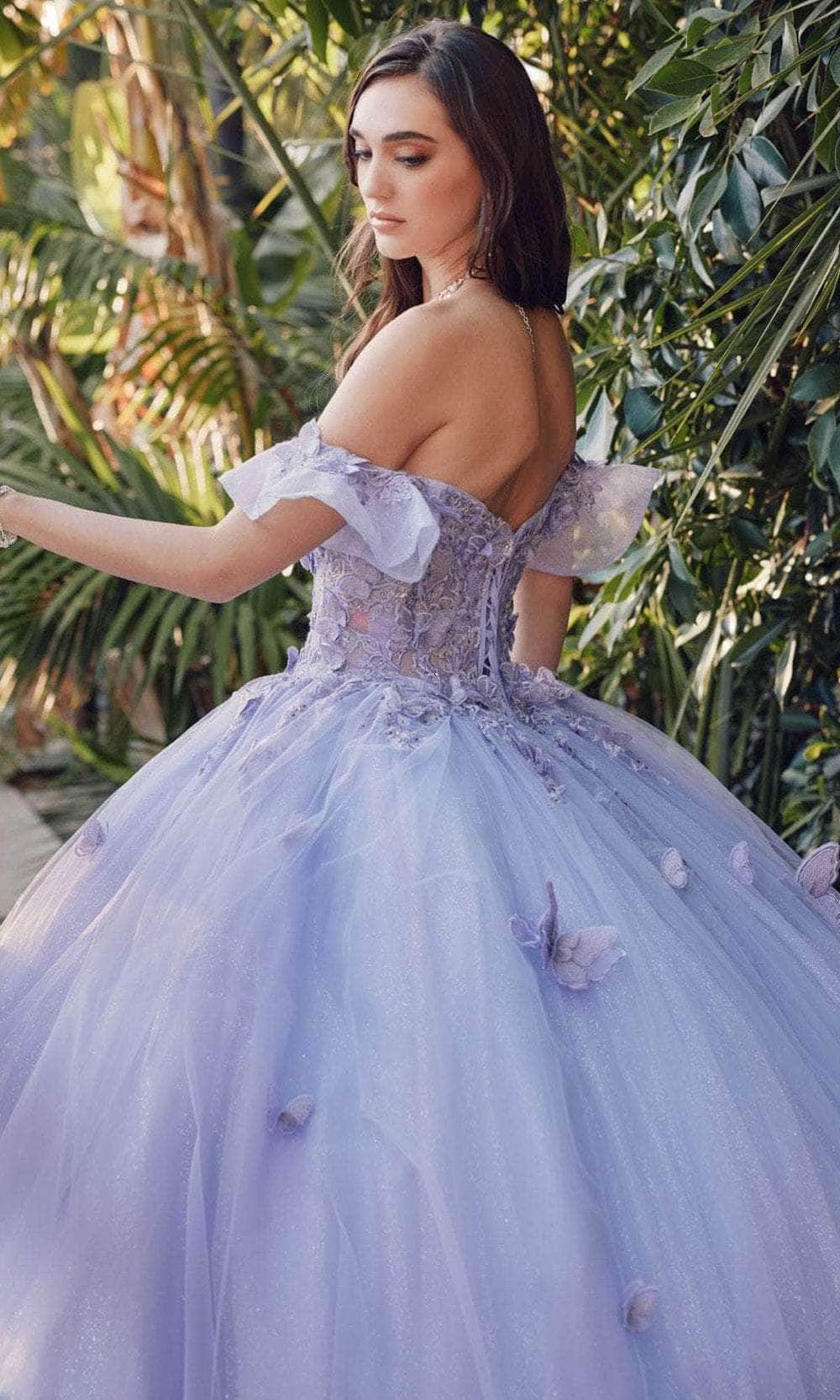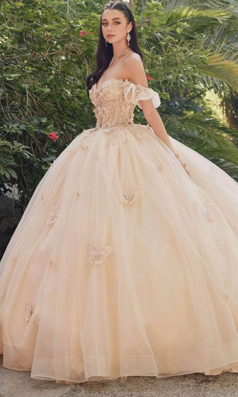 Orchestrate a beautiful entrance that screams extravagance in this Juliet Dresses JT1448J masterpiece. Every detail of this gown exudes opulence and beauty with its 3D butterfly appliques, embroidery and beadings adornment. The illusion corset boning bodice offers exceptional support, while the sweetheart neckline and off-shoulder flutter sleeve add a touch of romance. A lace-up tie closure at the open back lets you adjust the perfect fit. For a grandeur finish, the skirt bursts a voluminous ballgown silhouette and it streams beautifully to the sweeping train. Appear like a real-life princess in this Juliet Dresses JT1448J. Models are wearing Champagne, and Lilac colors.