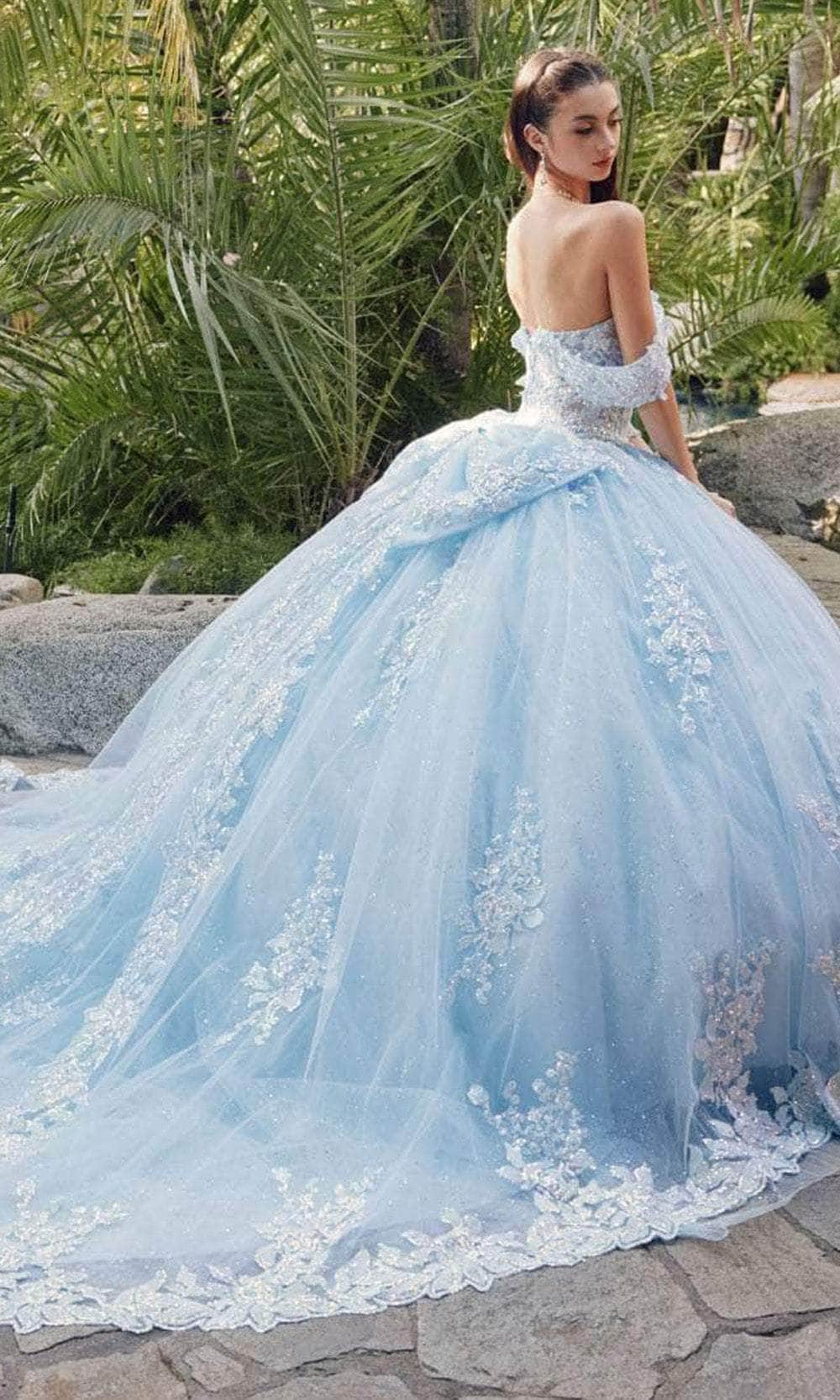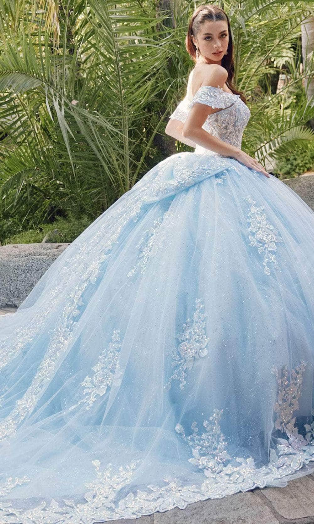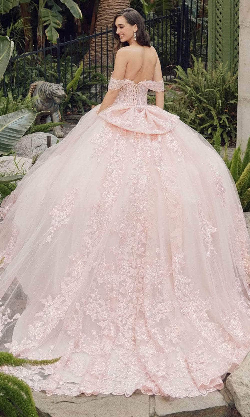 Uphold eye-catching style in this masterpiece from Juliet Dresses JT1458J. The gown has a collection of embroidery, lace appliques and sequins, making you shine bright on your quinceanera celebration. Features are the sweetheart neckline complemented by the fascinating off-shoulder sleeves. The skirt wonderfully flares a voluminous ballgown silhouette with scalloped detail and a cathedral train. A charming bow accent at the back and the lace-up tie design provide the perfect finishing touches. This Juliet Dresses JT1458J is sure to make you the star of the event! Models are wearing Bahama Blue, and Blush colors.