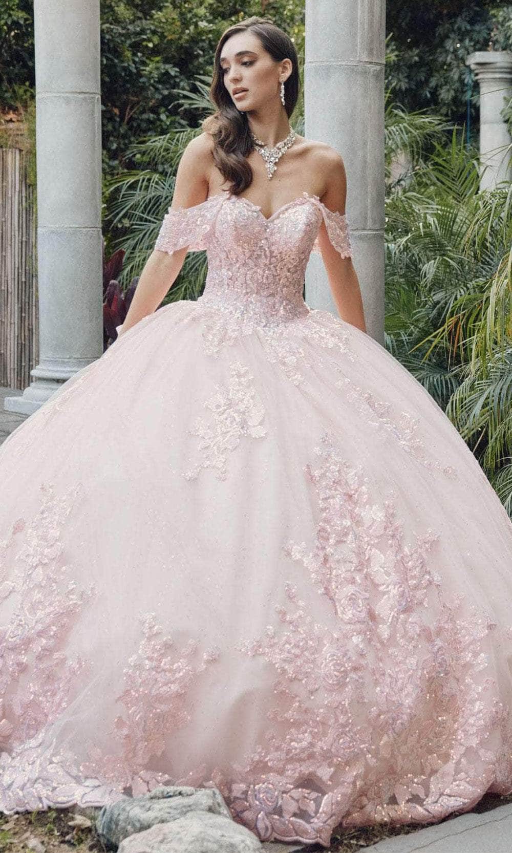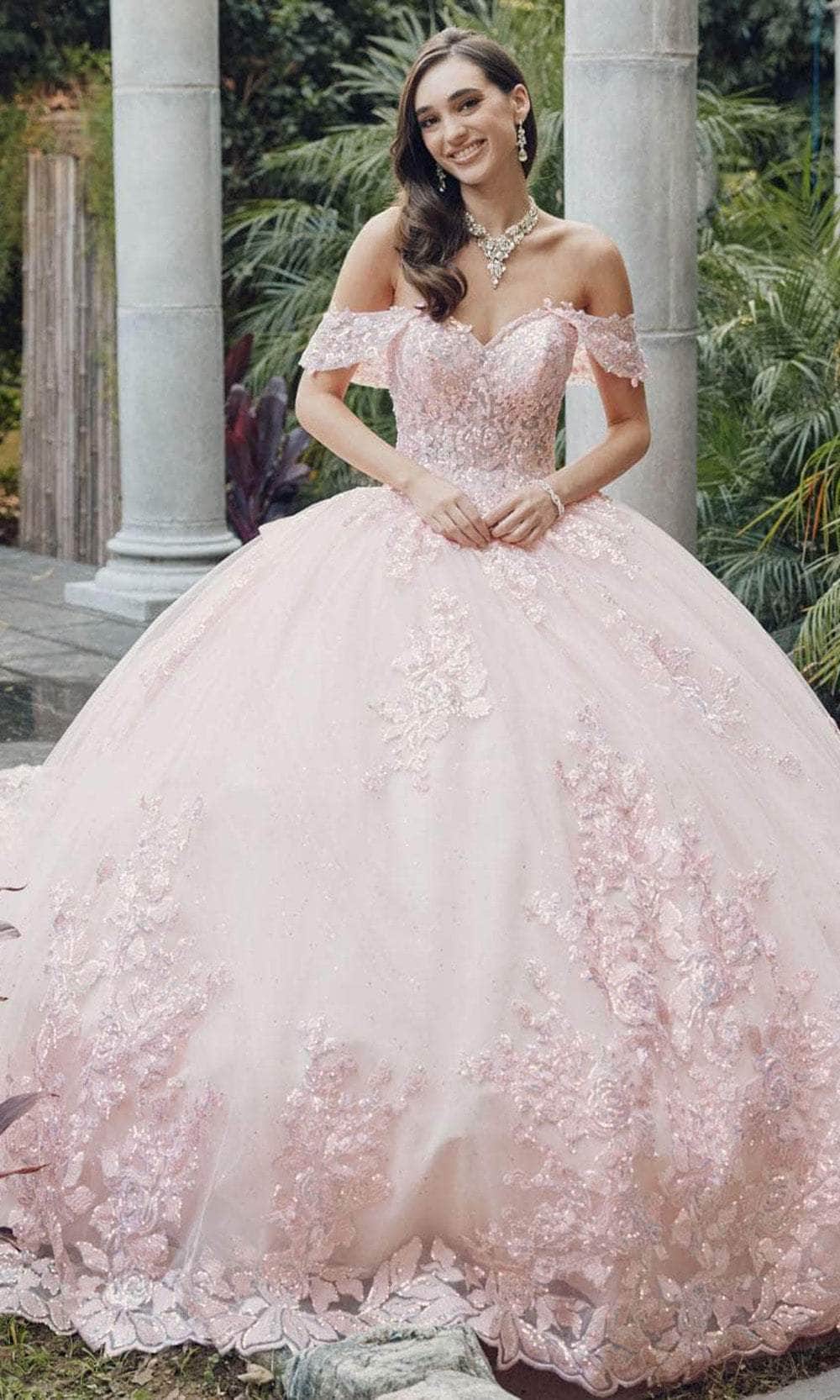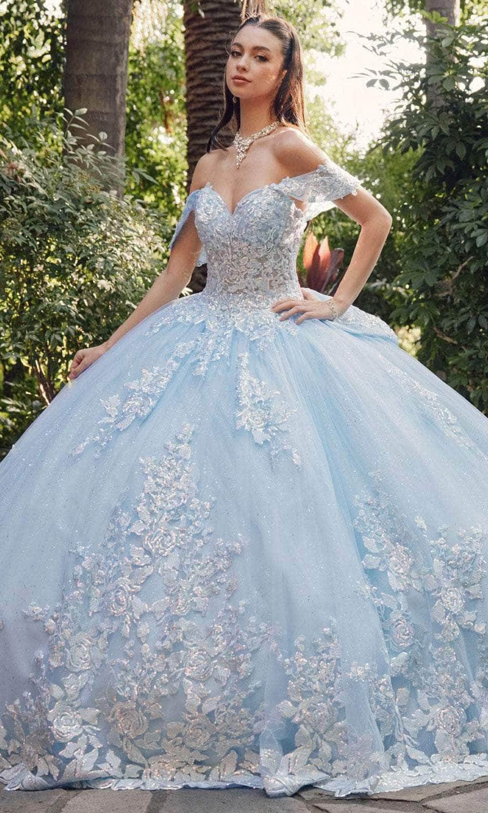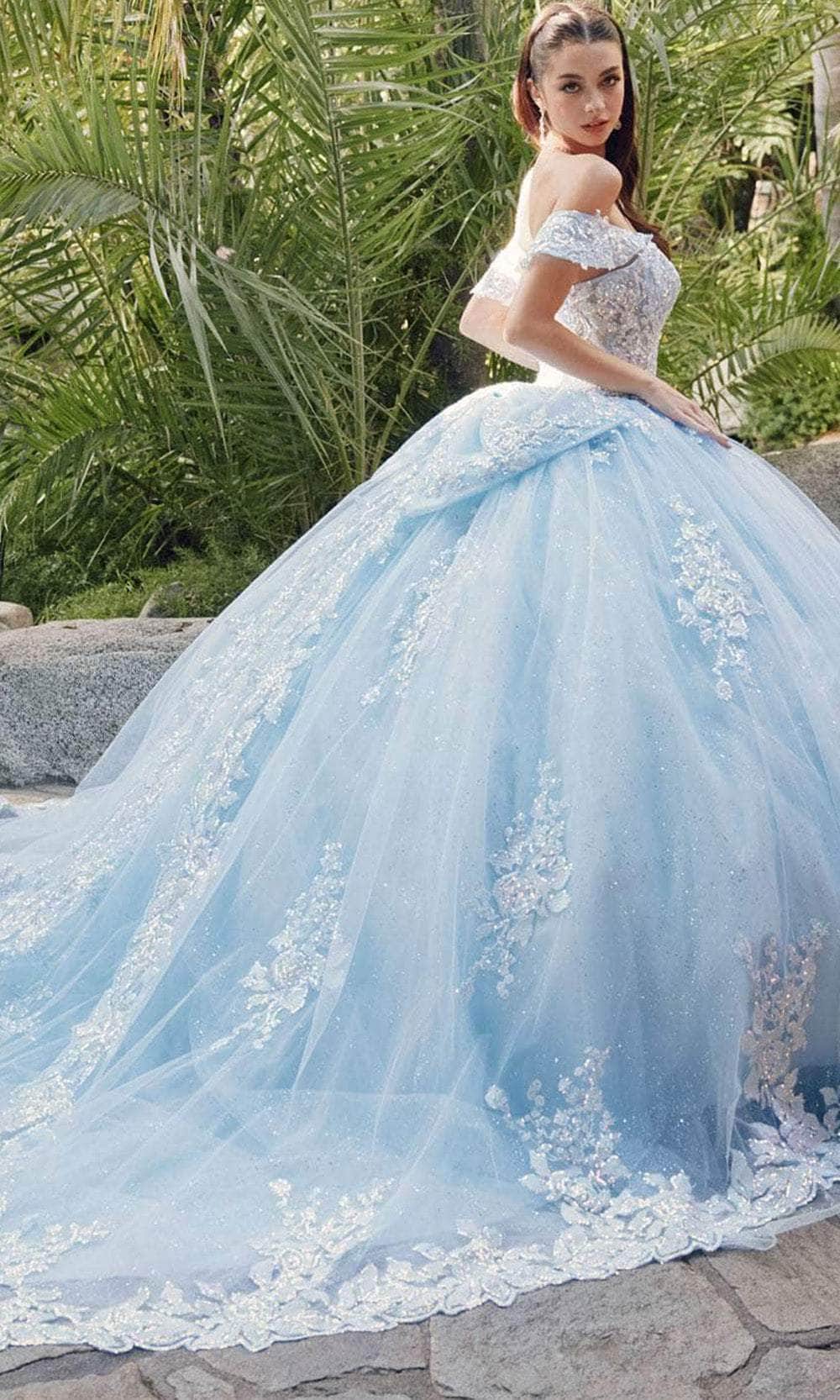 Uphold eye-catching style in this masterpiece from Juliet Dresses JT1458J. The gown has a collection of embroidery, lace appliques and sequins, making you shine bright on your quinceanera celebration. Features are the sweetheart neckline complemented by the fascinating off-shoulder sleeves. The skirt wonderfully flares a voluminous ballgown silhouette with scalloped detail and a cathedral train. A charming bow accent at the back and the lace-up tie design provide the perfect finishing touches. This Juliet Dresses JT1458J is sure to make you the star of the event! Models are wearing Bahama Blue, and Blush colors.