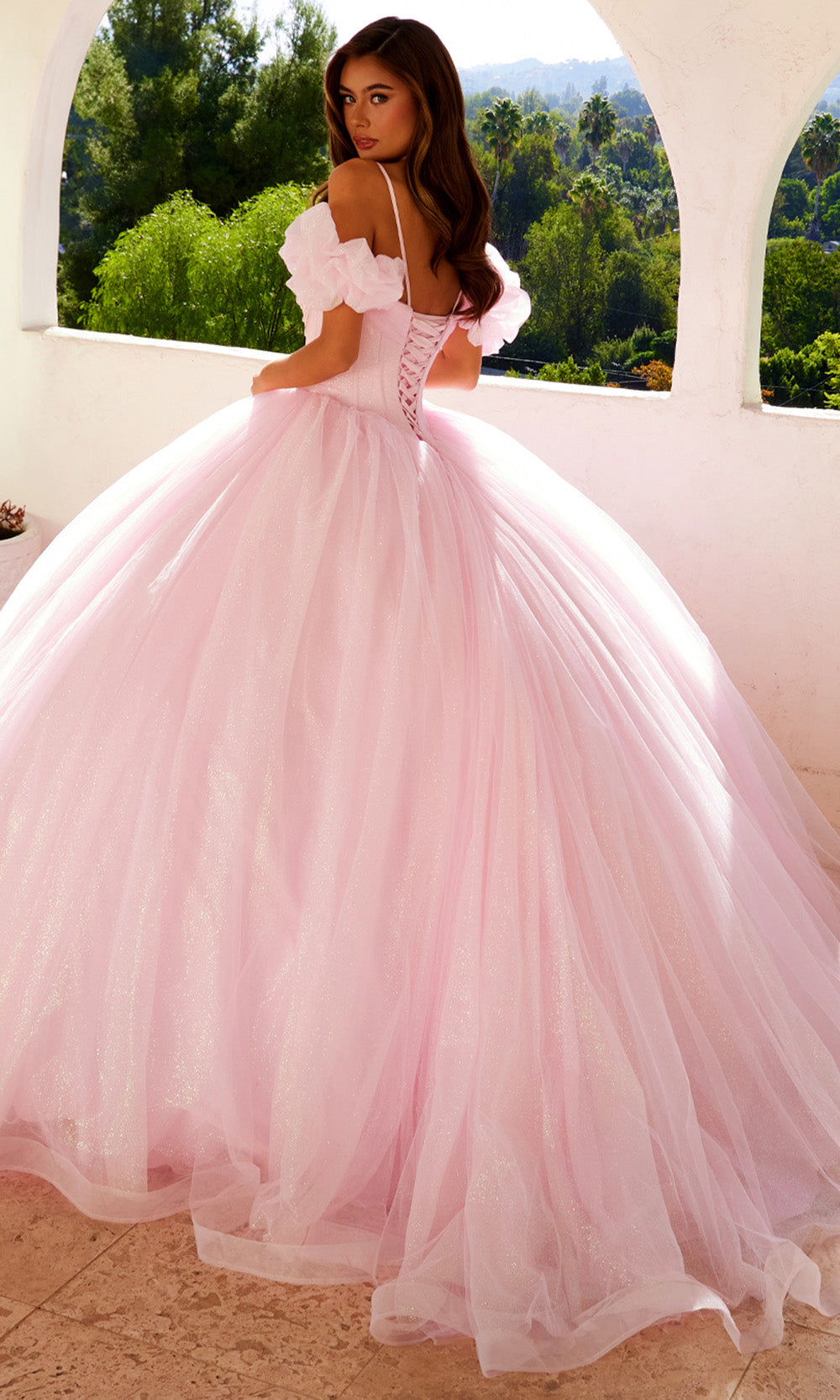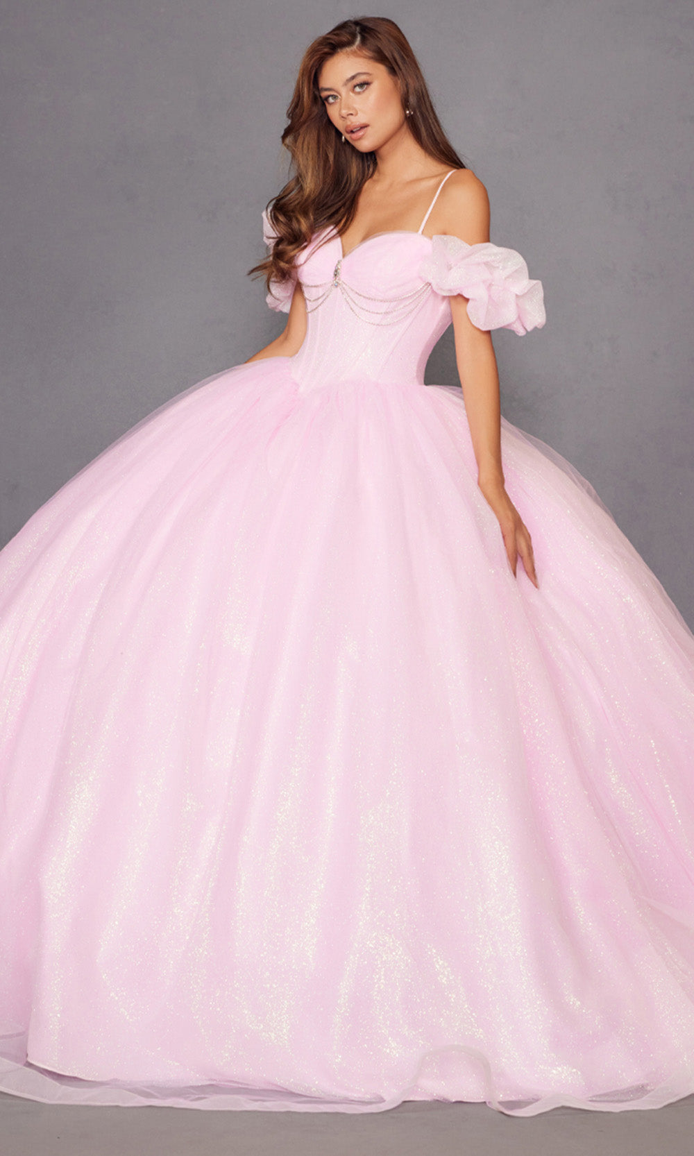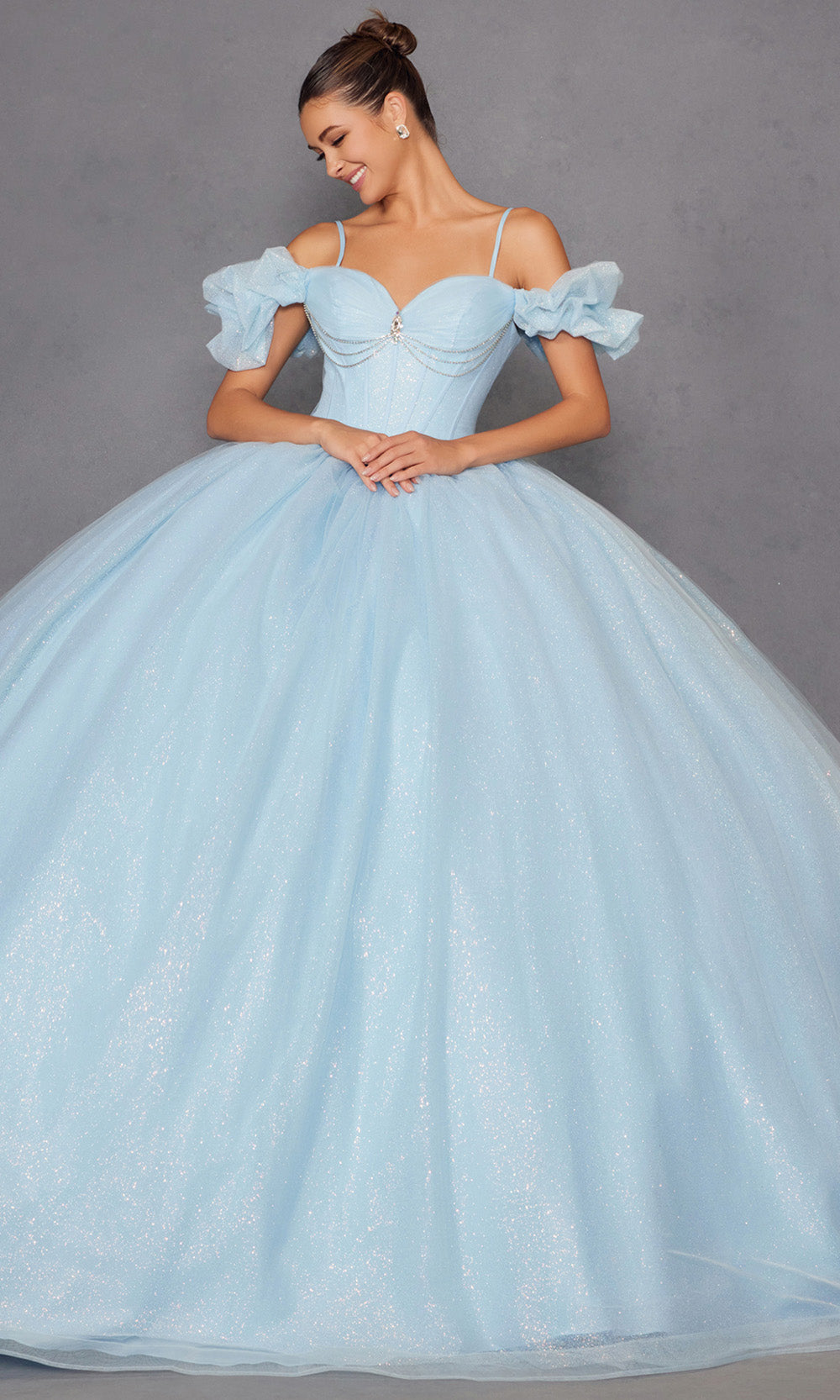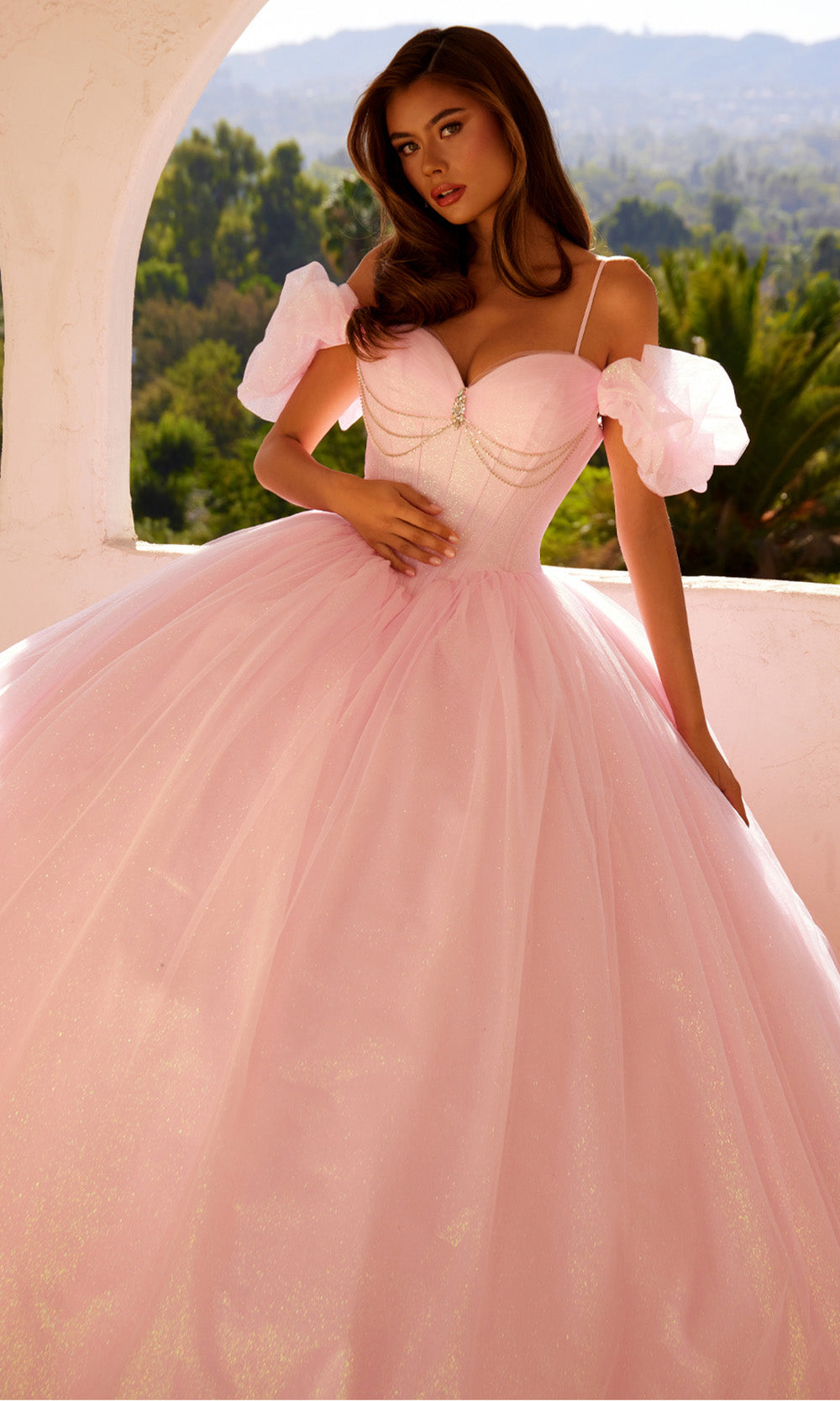 Step into an evening of grandeur with the unforgettable Juliet Dresses JT1487H. This showstopping gown features a beautifully structured corset bodice accented by off-shoulder puff sleeves and an elegant sweetheart neckline. A cascading ballgown skirt flows outward, creating regal movement from every angle. The delicate beaded waist chain adds just the right amount of shimmer to elevate its dramatic charm. Wear Juliet Dresses JT1487H to leave a lasting impression at your next formal occasion or gala. Models are wearing Baby Pink, and Bahama Blue colors.