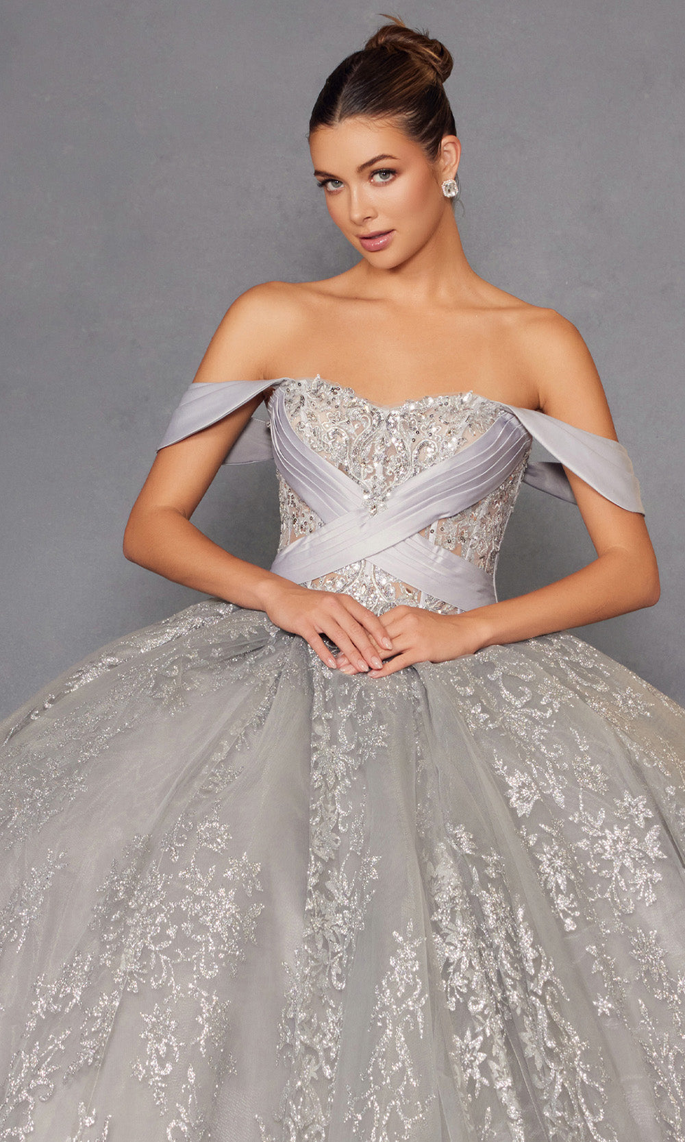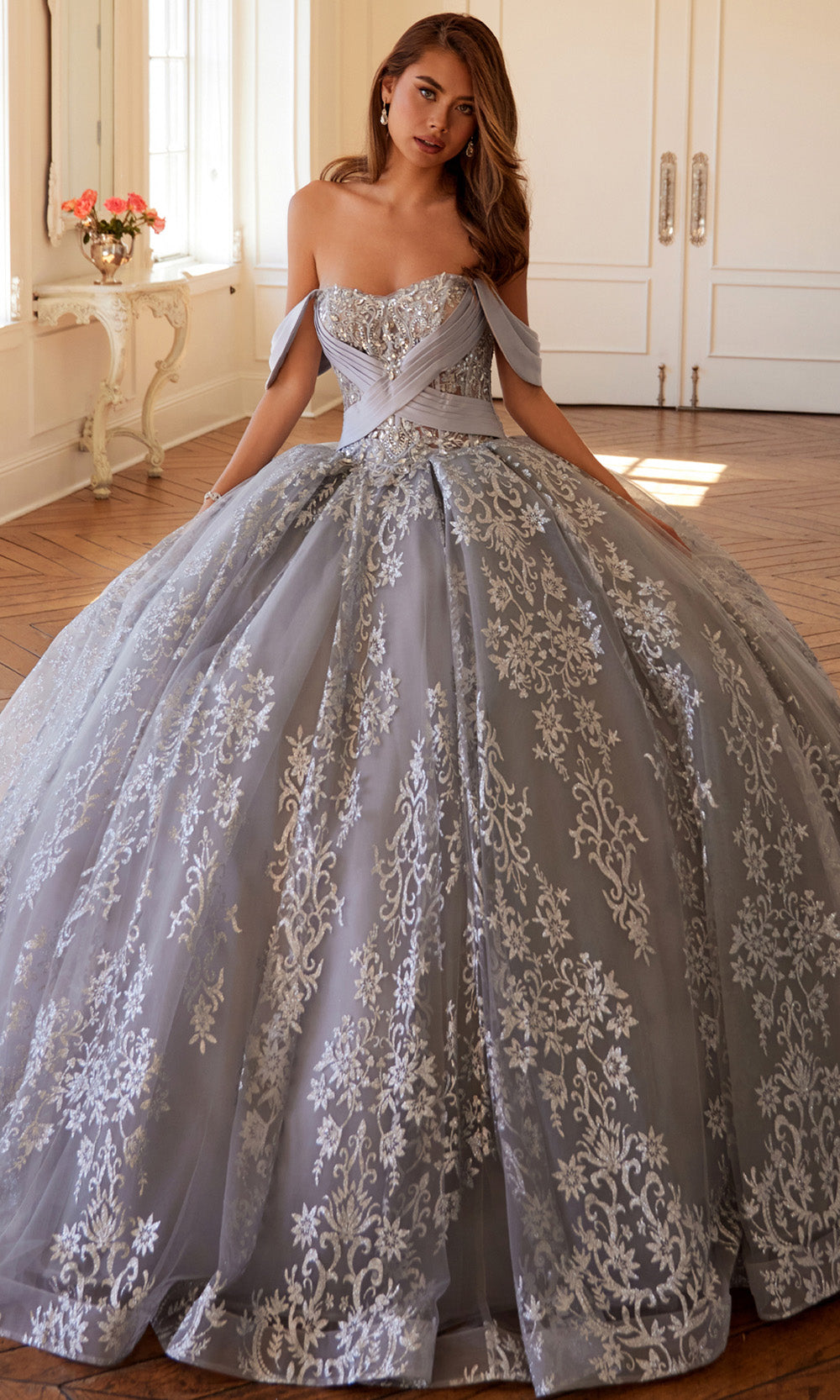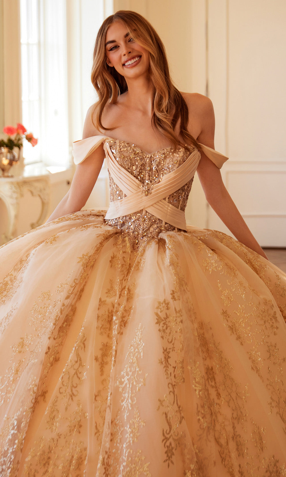 Fairy tale charm comes to life in the Juliet Dresses JT1488H ballgown, a true masterpiece for those who seek grandeur and timeless beauty. This off shoulder design features softly draped sleeves framing a structured corset bodice that flatters the silhouette. Metallic floral embroidery cascades from the bodice to the voluminous skirt, creating a majestic effect. The crisscross pleated waistband accentuates the waistline, while a sweeping train finishes the look with regal grace. Juliet Dresses JT1488H transforms any special occasion into a dreamlike moment. Models are wearing Gold, and Silver colors.
