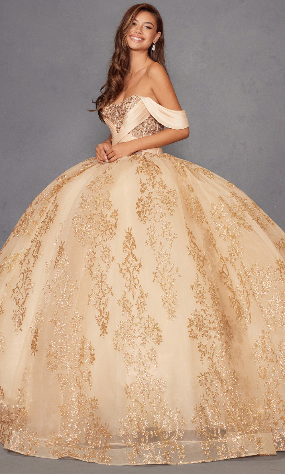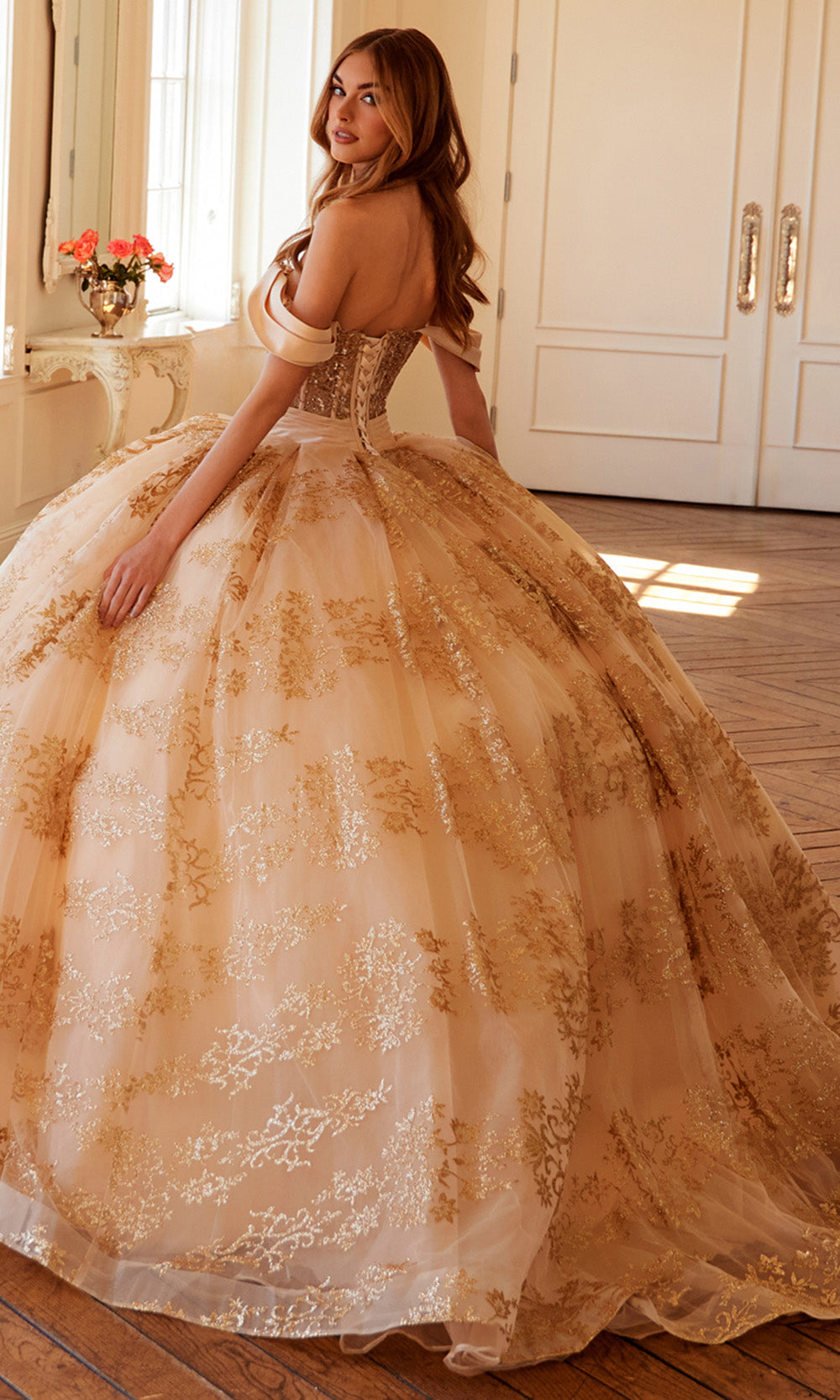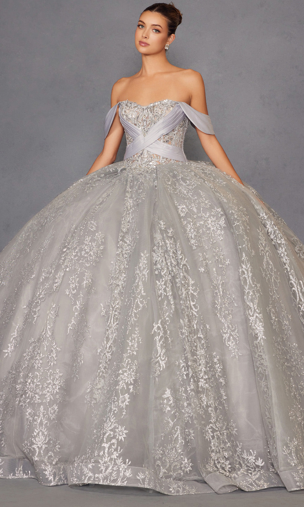 Fairy tale charm comes to life in the Juliet Dresses JT1488H ballgown, a true masterpiece for those who seek grandeur and timeless beauty. This off shoulder design features softly draped sleeves framing a structured corset bodice that flatters the silhouette. Metallic floral embroidery cascades from the bodice to the voluminous skirt, creating a majestic effect. The crisscross pleated waistband accentuates the waistline, while a sweeping train finishes the look with regal grace. Juliet Dresses JT1488H transforms any special occasion into a dreamlike moment. Models are wearing Gold, and Silver colors.
