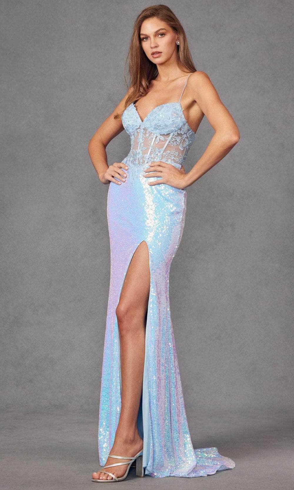 Shine in with Juliet Dresses JT2433A, a stunning prom gown adorned with leaf lace embroidery on a sheer corset top. The sleeveless bodice showcases a sweetheart neckline, accentuated by delicate spaghetti straps that elegantly crisscross at the back and tie up with a lace-up closure. With a convenient center zipper at the back, achieving the perfect fit is effortless. The sequin floor-length skirt flows gracefully in a sheath silhouette, complete with a sultry slit and a captivating train. Juliet Dresses JT2433A ensures you make a memorable statement at any event. Model is wearing Ice Blue color.