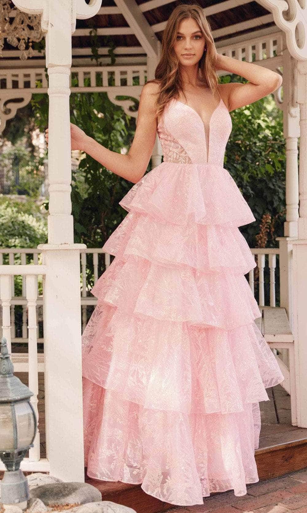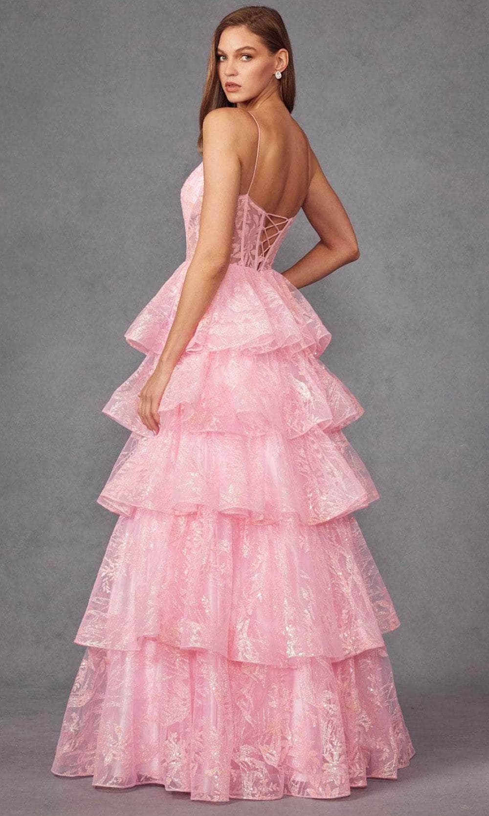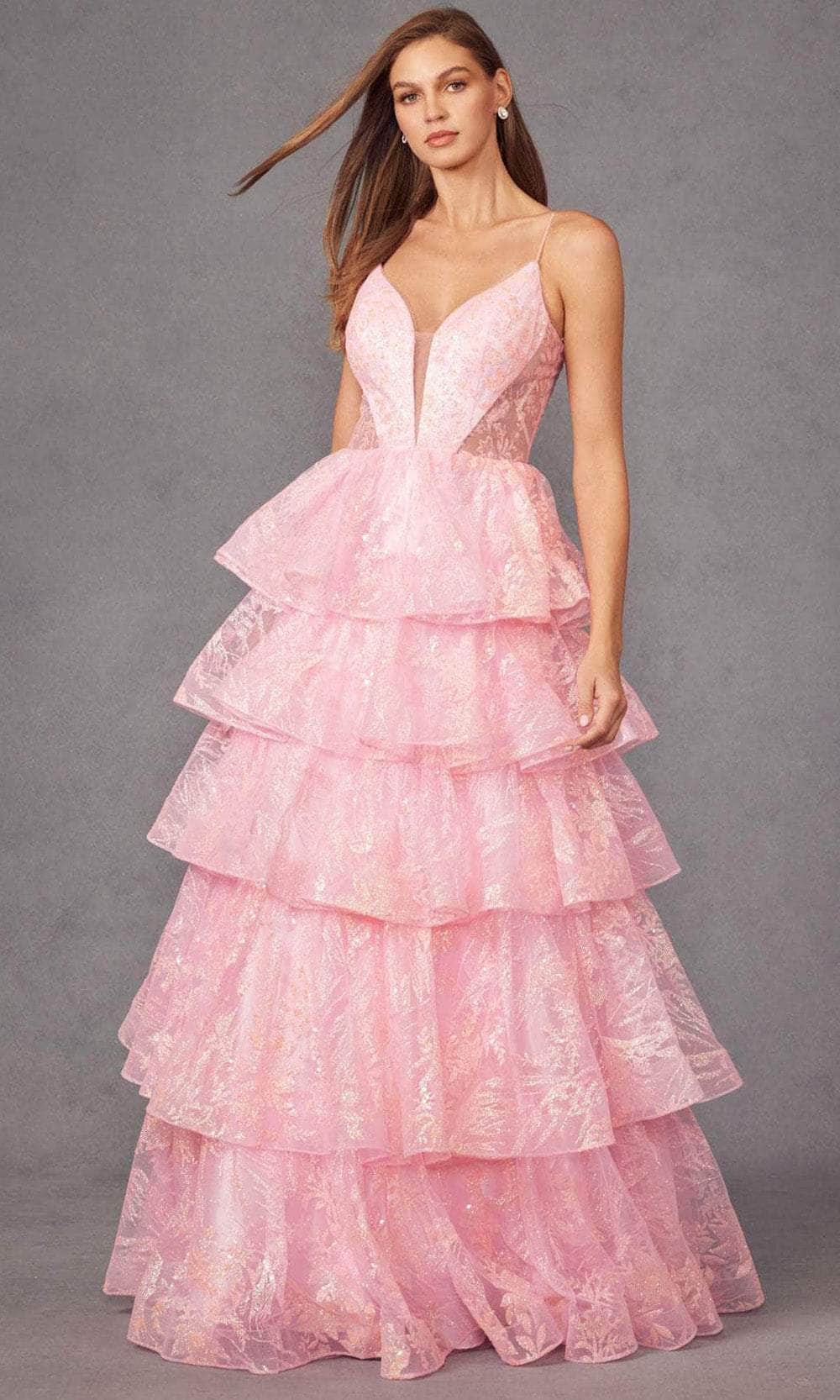 Unleash your inner princess in this sleeveless gown from Juliet Dresses JT2438K. Superb glitter applique all over the fit and flare bodice, exudes femininity and grace. The spaghetti straps frame the shoulders, while the plunging v-neckline with illusion inset at the bust and sheer panels on the side waist add entice. The mid-open detail at the back is safely secure by the lace-up tie design. Ending in a horsehair hem and floor length, the skirt makes an A-line silhouette with ruffle tier details for an extravagant finish. Be dressed up beautifully by Juliet Dresses JT2438K. Model is wearing Candy Pink color.