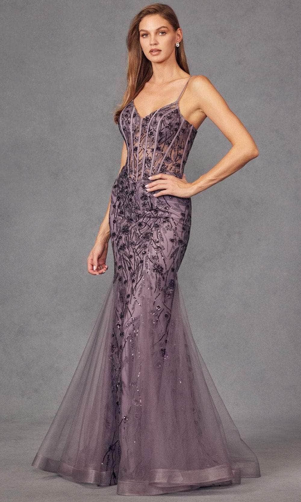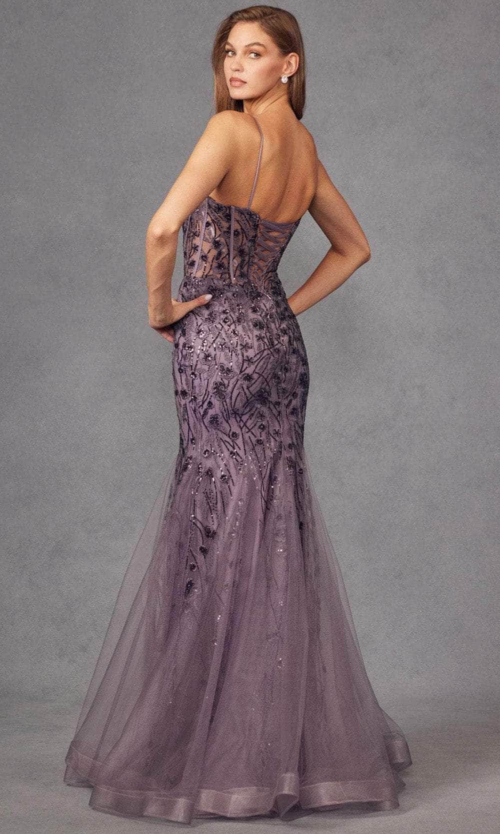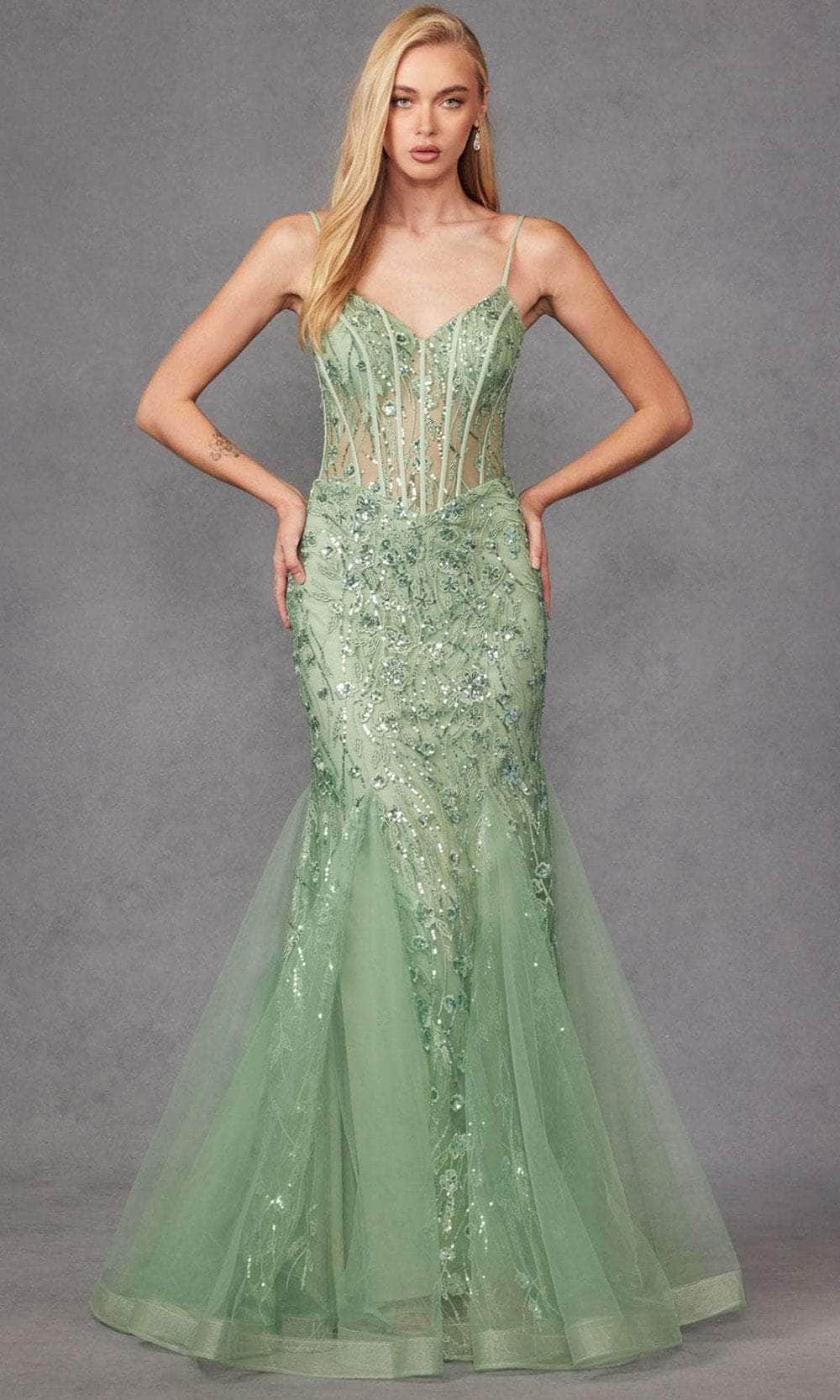 You will definitely turn heads in this Juliet Dresses JT2441S. The sleeveless design is glamorously ornamented with sequins and embroidery, giving it a beautiful sparkle all night. The see-through bodice with corset boning accentuates your curves, featuring a v-neckline and spaghetti straps that navigate to the midrise lace-up back. With a godets accent and horsehair hem to create beautiful movement, the skirt finishes in a dreamy mermaid silhouette that trickles to the floor length hemline. This Juliet Dresses JT2441S masterpiece is sure to make you feel like a star of the event. Models are wearing Grey Purple, and Sage Green colors.