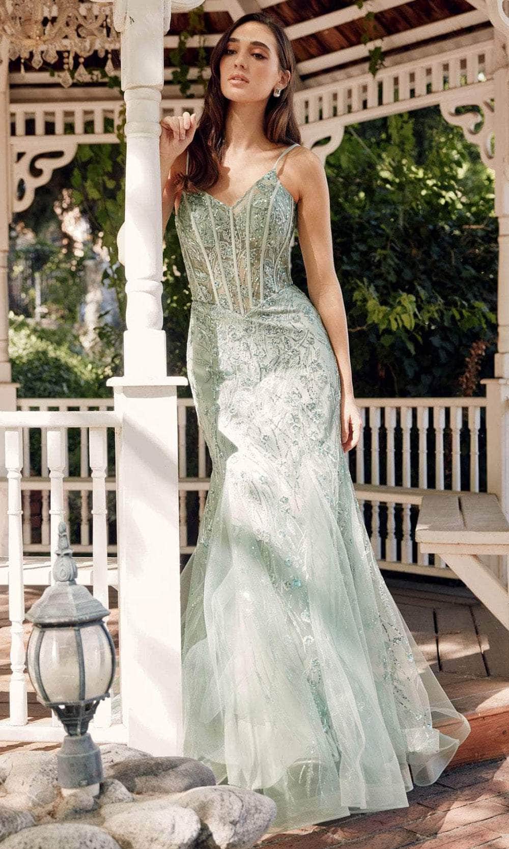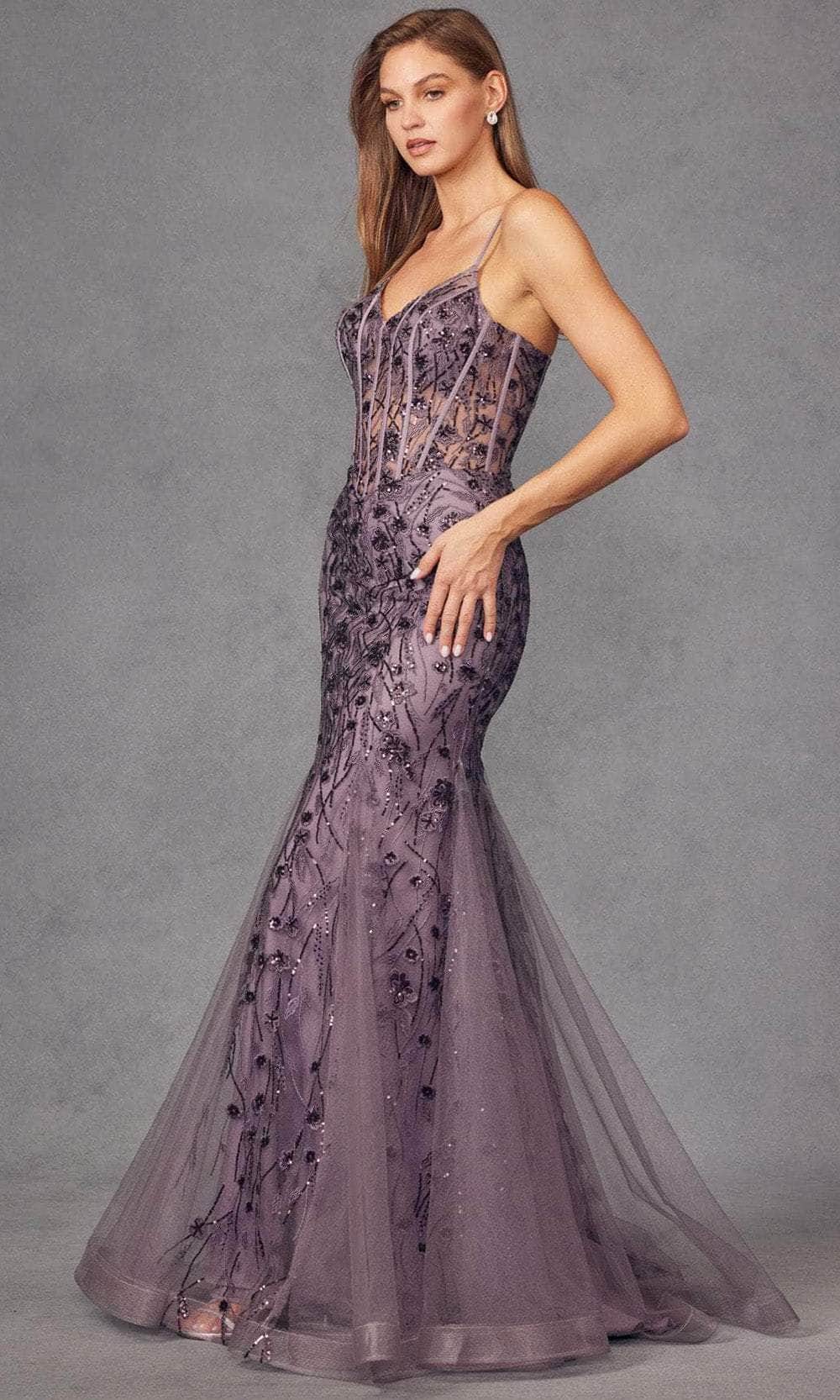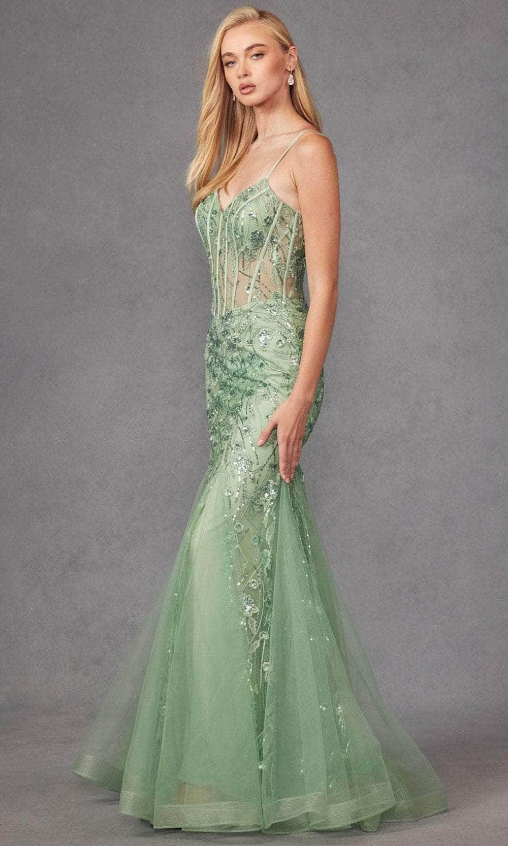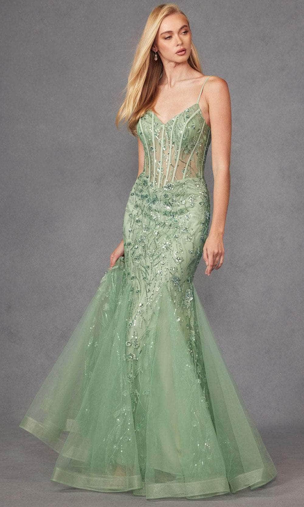 You will definitely turn heads in this Juliet Dresses JT2441S. The sleeveless design is glamorously ornamented with sequins and embroidery, giving it a beautiful sparkle all night. The see-through bodice with corset boning accentuates your curves, featuring a v-neckline and spaghetti straps that navigate to the midrise lace-up back. With a godets accent and horsehair hem to create beautiful movement, the skirt finishes in a dreamy mermaid silhouette that trickles to the floor length hemline. This Juliet Dresses JT2441S masterpiece is sure to make you feel like a star of the event. Models are wearing Grey Purple, and Sage Green colors.