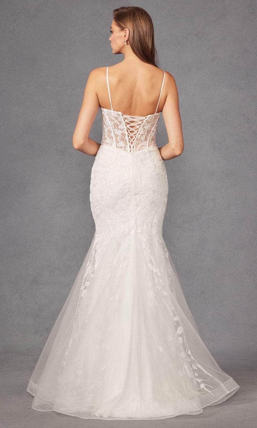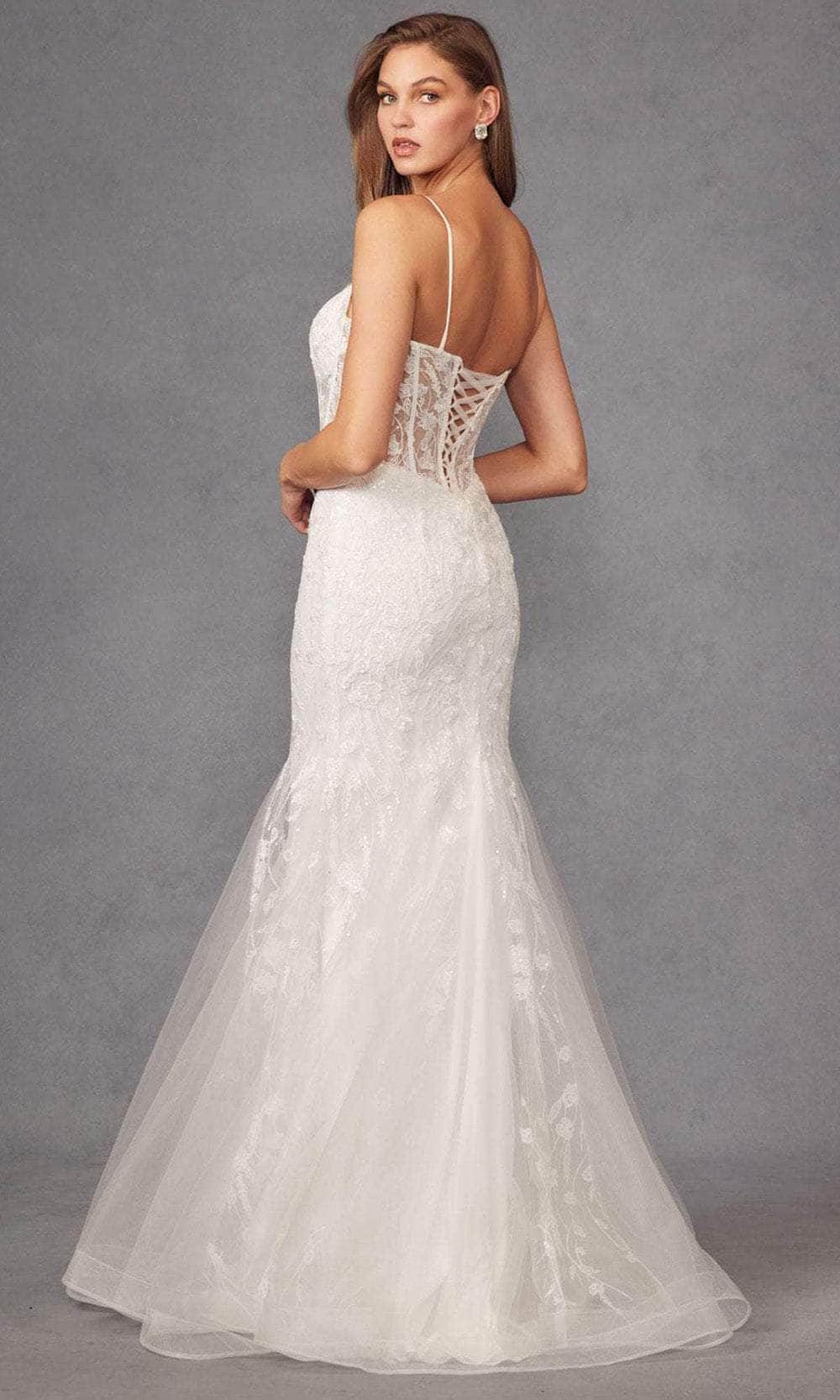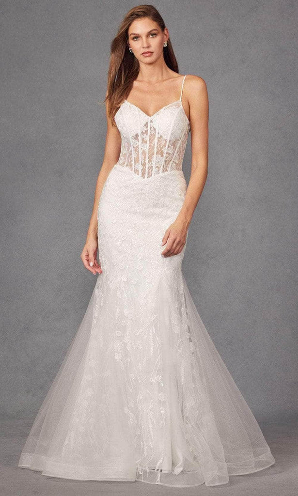 Captivate all eyes with this Juliet Dresses JT2441SW, a breathtaking mermaid bridal gown that exudes timeless elegance. The fitted sheer corset bodice is adorned with intricate lace appliques and delicate tulle, creating a mesmerizing effect. A sleeveless design and V-neckline enhance the allure of the gown, while a lace-up tie at the back ensures a perfect fit. The floor-length skirt cascades in a graceful mermaid silhouette, epitomizing the sophistication and romance of Juliet Dresses JT2441SW for your special day. Model is wearing Off-White color.