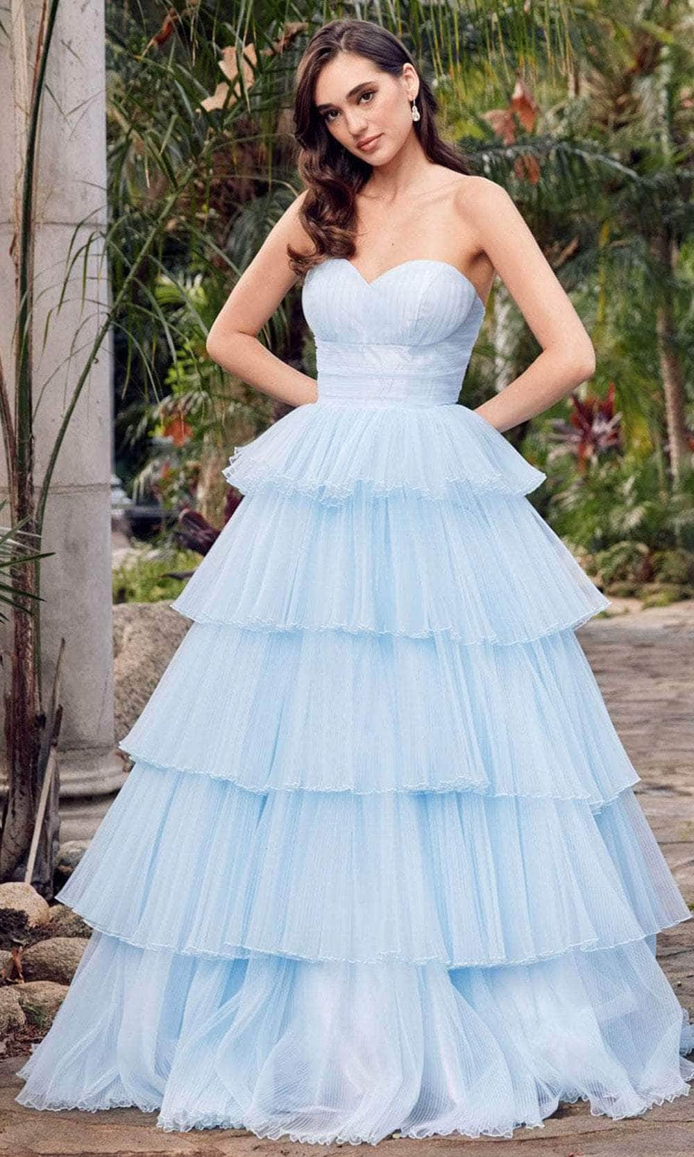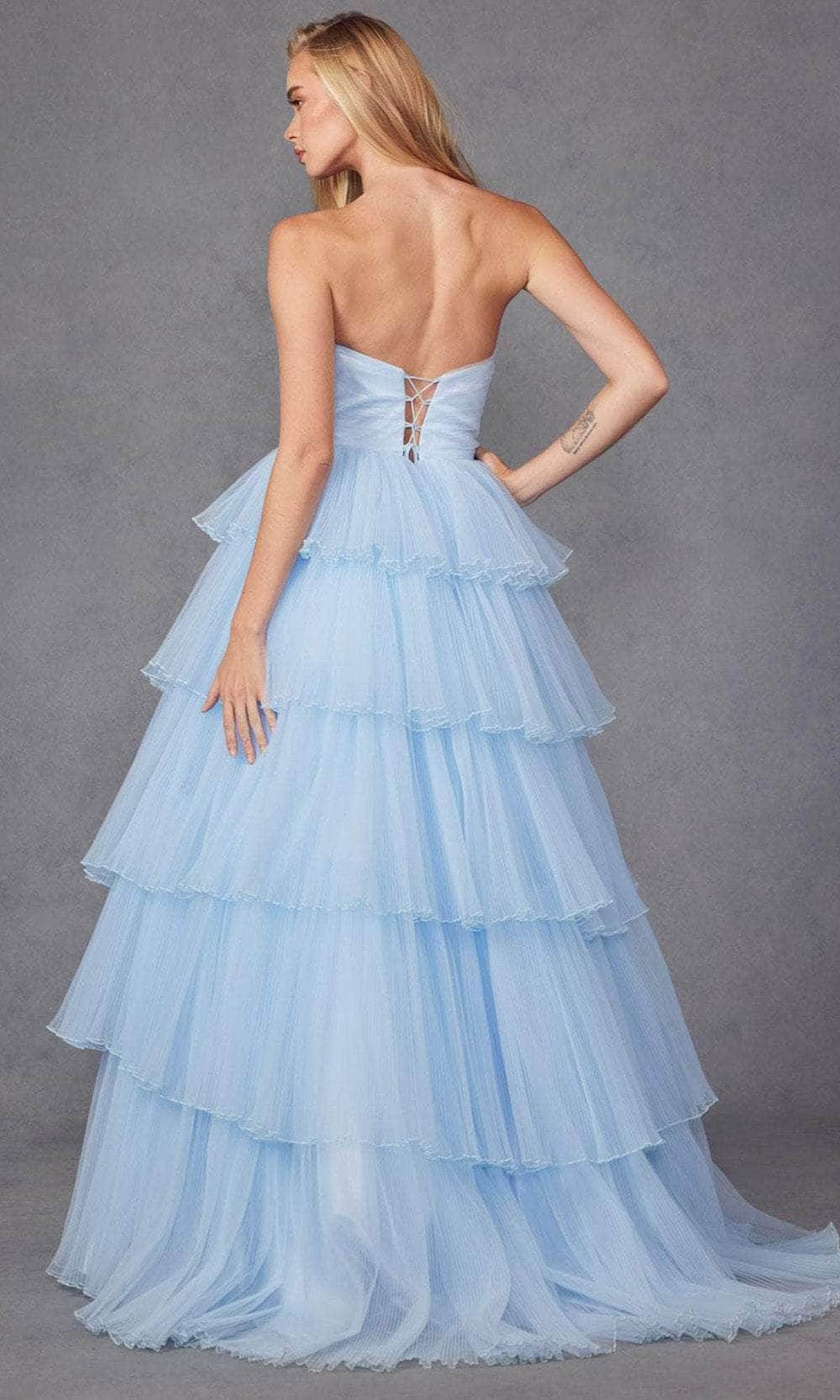 Embody classic sophistication with Juliet Dresses JT2452K, an enchanting prom gown crafted from ruffle tulle, featuring a strapless sweetheart neckline that exudes elegance and charm. The gown is adorned with a lace-up tie at the back, ensuring a perfect fit for any figure. The tiered floor-length skirt cascades gracefully in a ballgown silhouette, creating a captivating look that is sure to turn heads. Complete with a trailing train, Juliet Dresses JT2452K epitomizes sophistication and glamour for your special occasion. Model is wearing Ice Blue color.