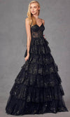 | Details: | Spaghetti Straps, Sleeveless, Sheer Corset Bodice, Lace, Sequin, Scalloped Detail, V-Back, Ruffled Tier Skirt, Sweep Train |