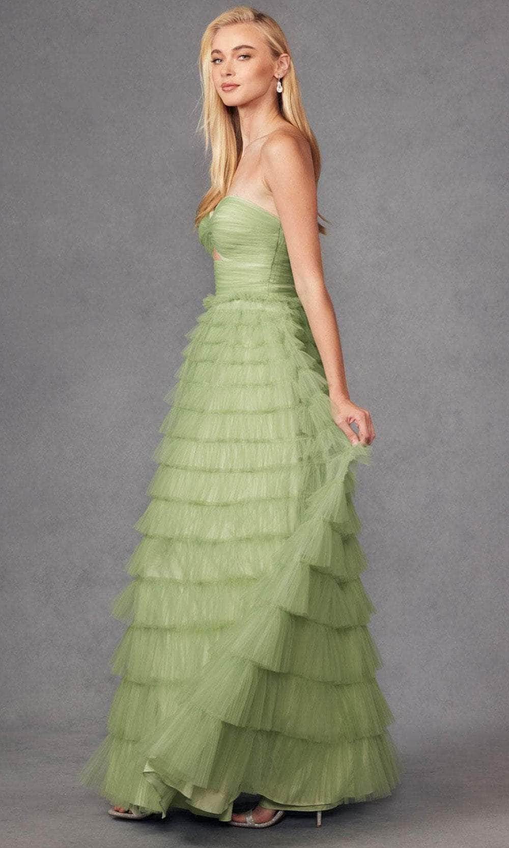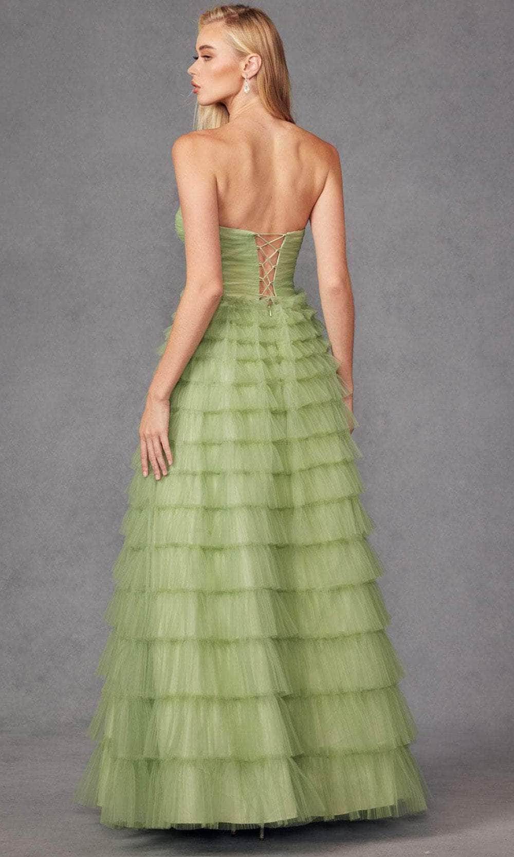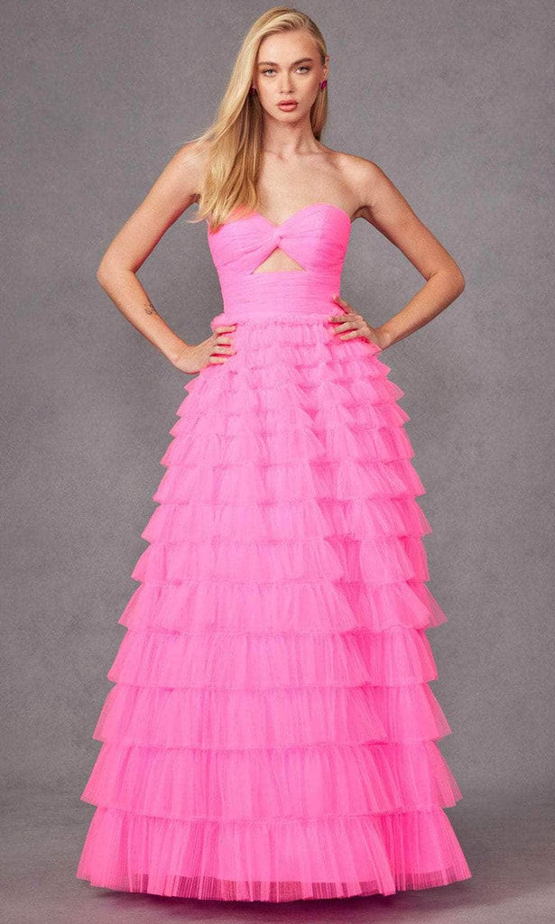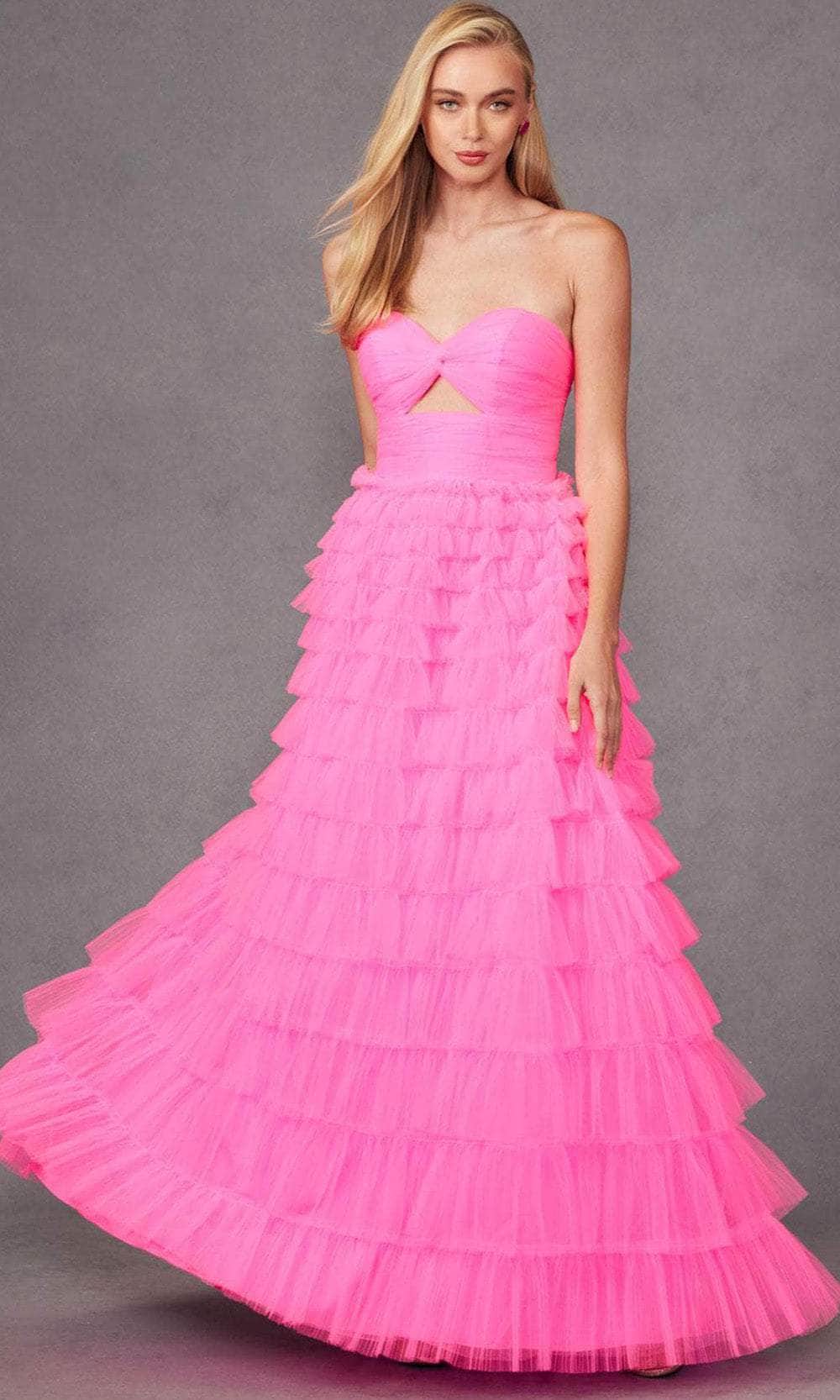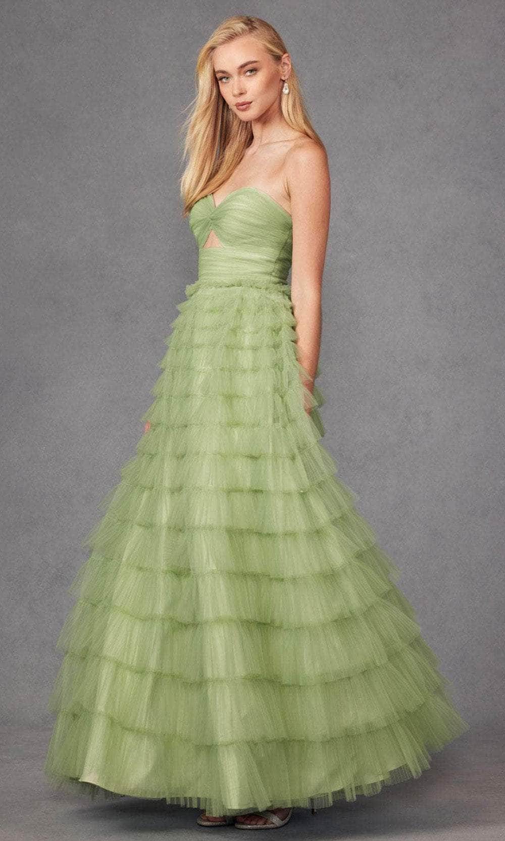 Be swept away by the loveliness of this Juliet Dresses JT2456H masterpiece. This show-stopping piece is designed in strapless, and featuring a ruched top bodice that adds timeless charm. It has a sweetheart neckline with knotted detail and a keyhole cutout at the bust. The mid-open back reveals a hint of your skin, accompanied by the strappy lace-up tie closure to customize the fit. Emphasized by a playful tiered ruffle, the skirt forms a dreamy ballgown silhouette and slides to the full length hemline. This Juliet Dresses JT2456H is picture-perfect for a magical evening. Models are wearing Neon Pink, and Sage Green colors.