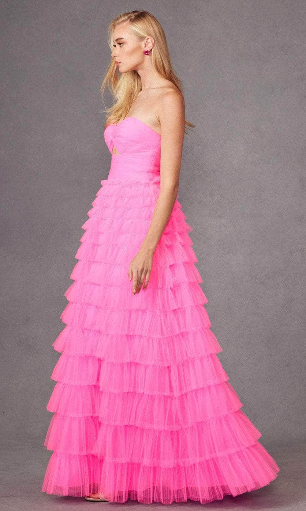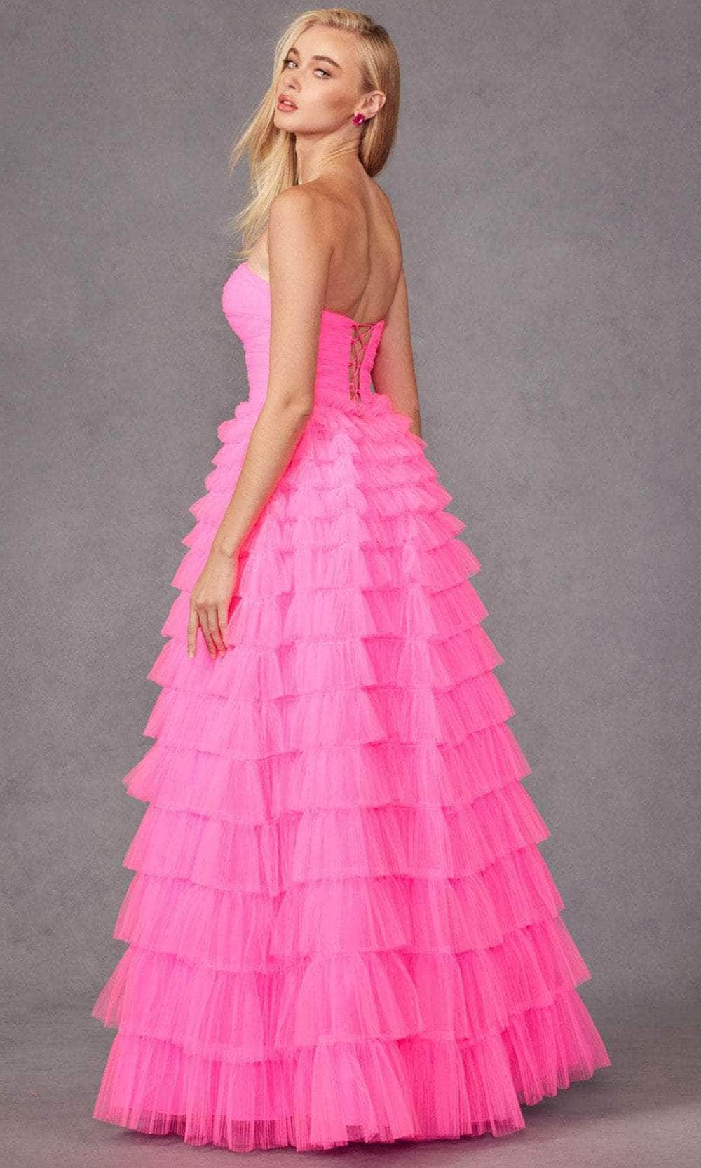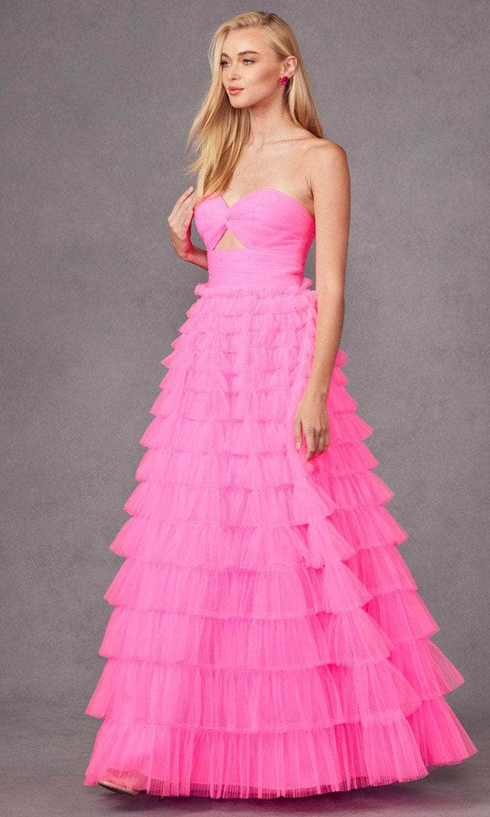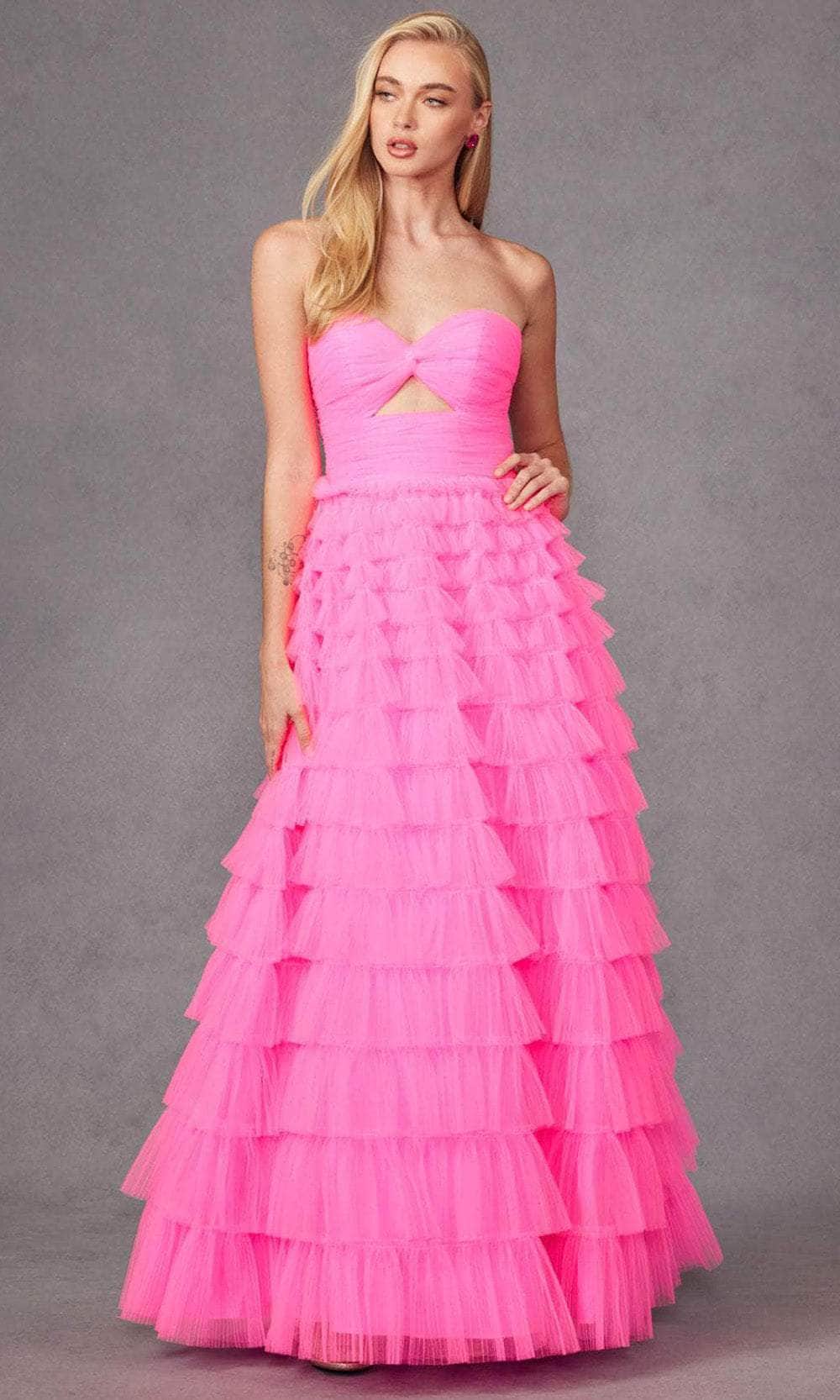 Be swept away by the loveliness of this Juliet Dresses JT2456H masterpiece. This show-stopping piece is designed in strapless, and featuring a ruched top bodice that adds timeless charm. It has a sweetheart neckline with knotted detail and a keyhole cutout at the bust. The mid-open back reveals a hint of your skin, accompanied by the strappy lace-up tie closure to customize the fit. Emphasized by a playful tiered ruffle, the skirt forms a dreamy ballgown silhouette and slides to the full length hemline. This Juliet Dresses JT2456H is picture-perfect for a magical evening. Models are wearing Neon Pink, and Sage Green colors.