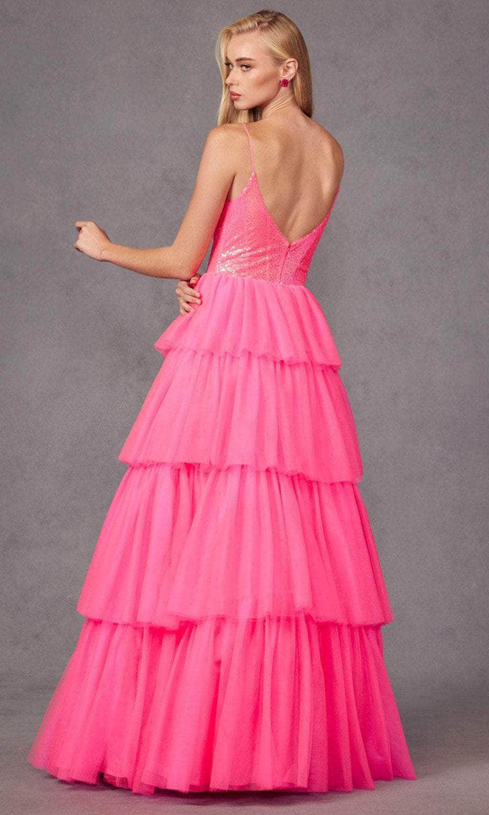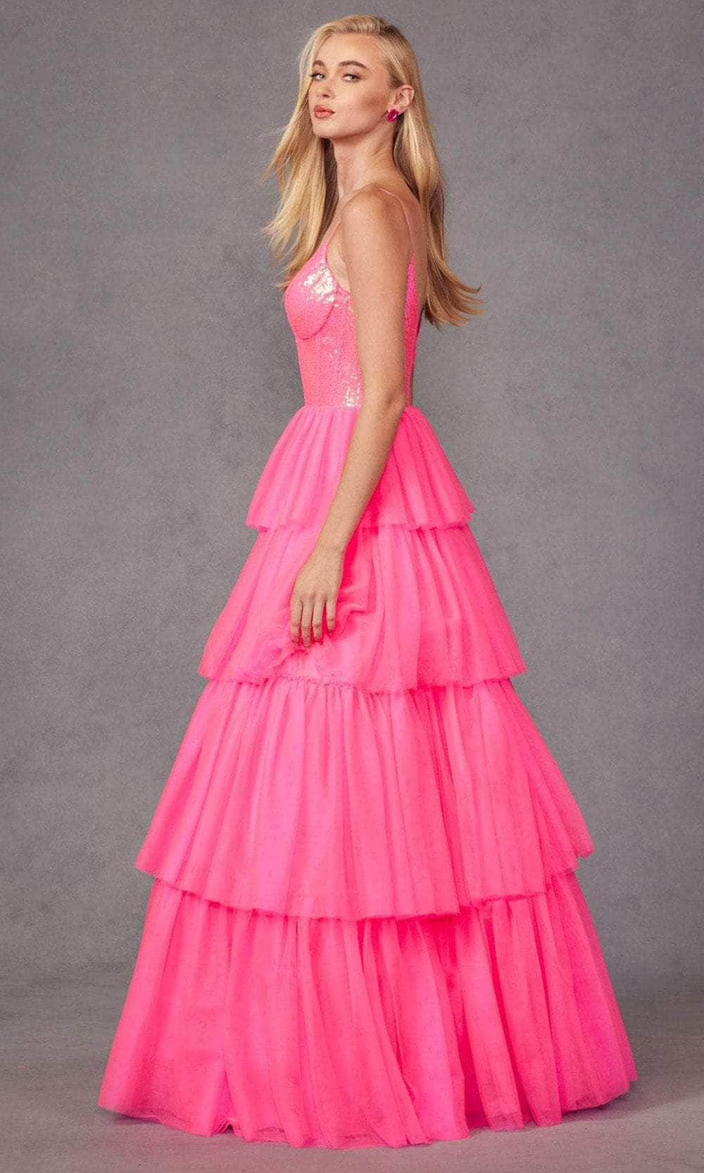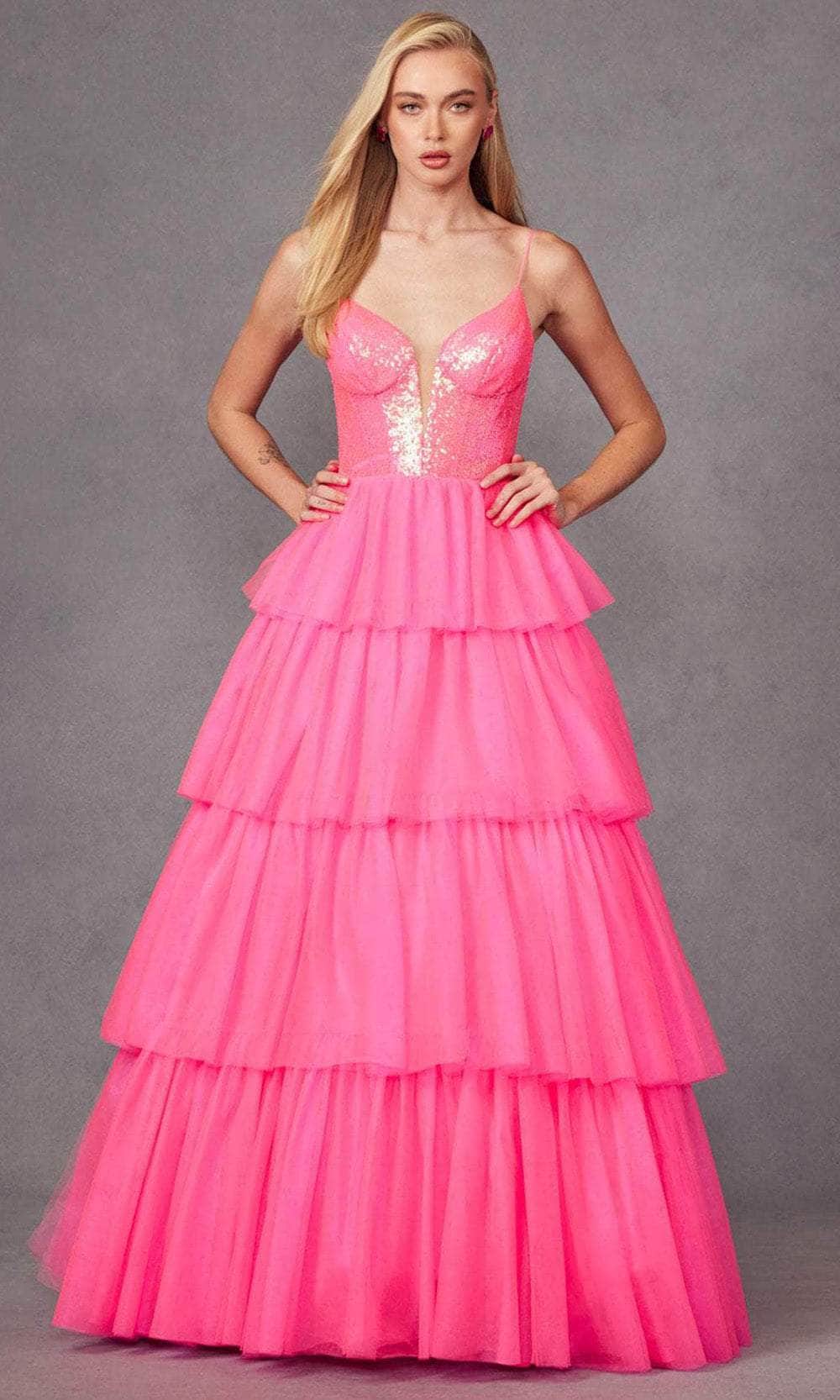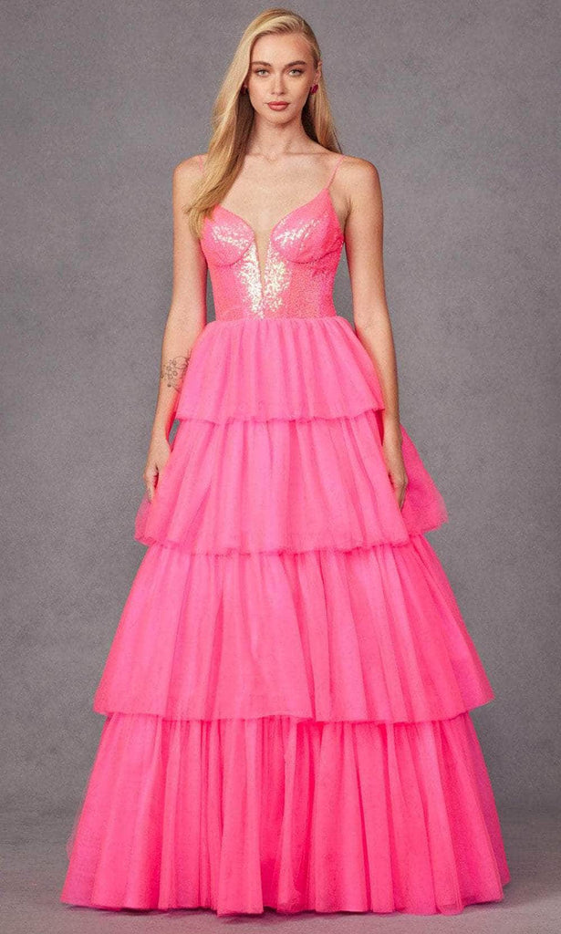 Be a vision of enchantment with Juliet Dresses JT2457H, a tulle ruffle ball gown. The sequin bodice, gracing a V-neckline, captures attention with its shimmering allure. The sleeveless corset bodice and open back add a touch of allure, while the center zipper closure ensures a secure fit. The tiered floor-length skirt cascades gracefully in a ballgown silhouette, completing the look with ethereal elegance. With Juliet Dresses JT2457H, you will captivate hearts at any prom or special occasion. Model is wearing Bright Fuchsia color.