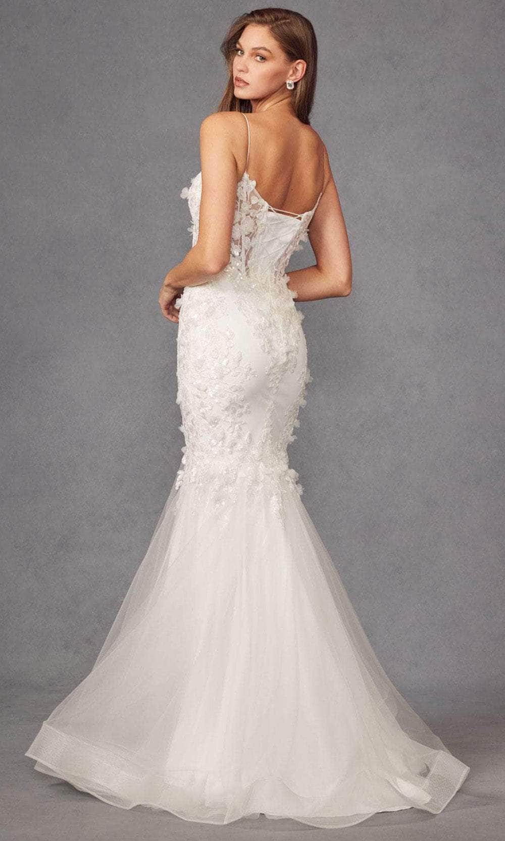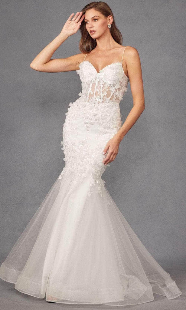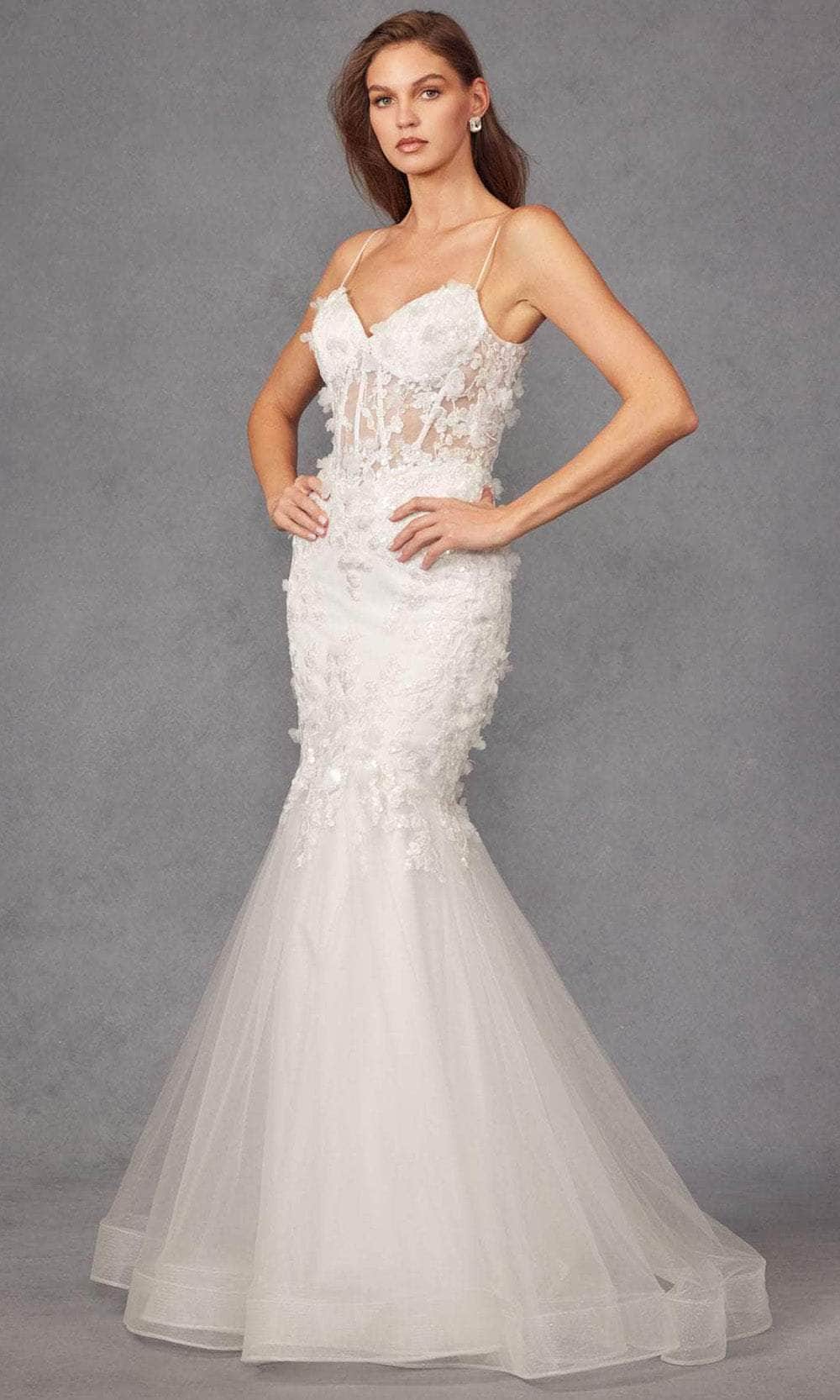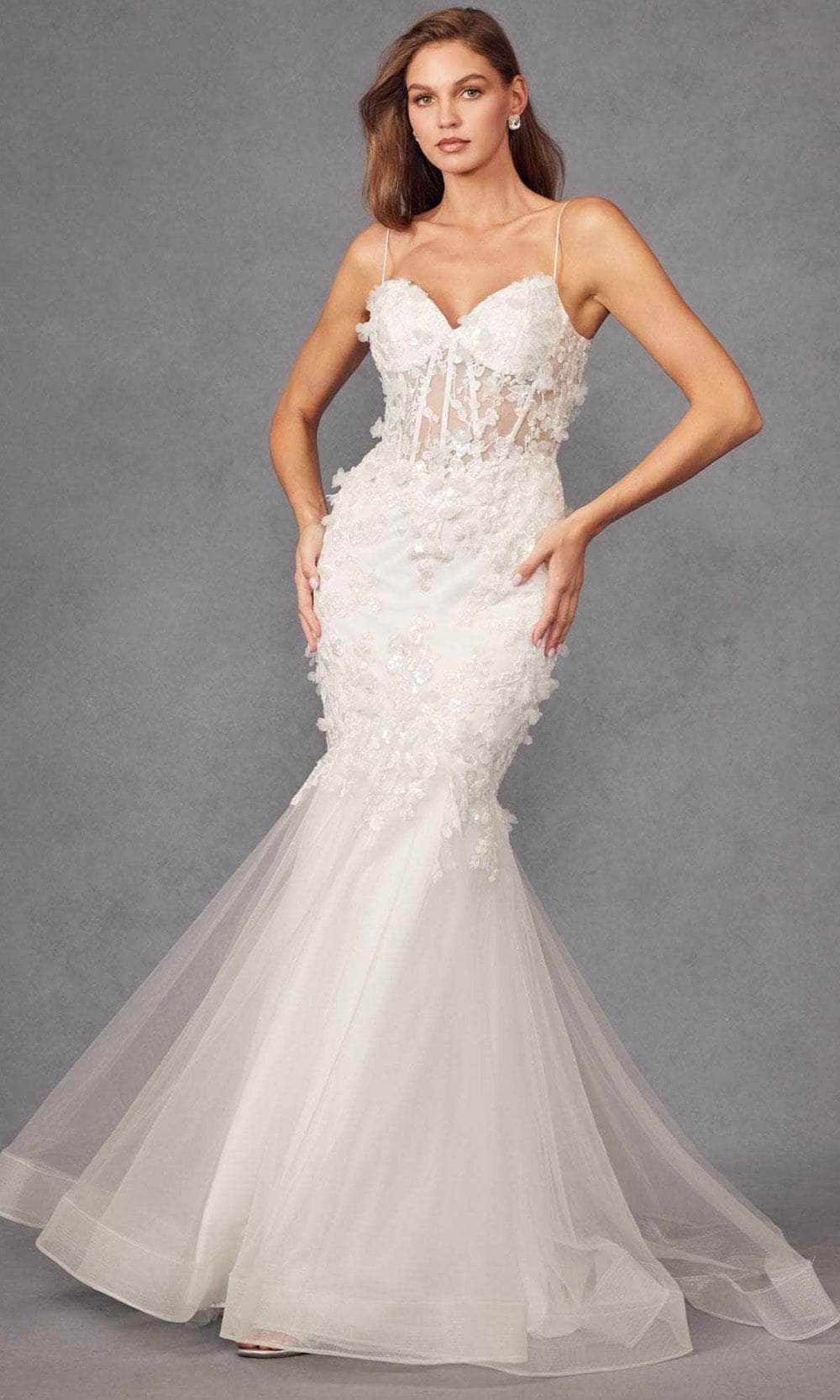 Indulge in romance with Juliet Dresses JT2469KW, a stunning lace mermaid corset wedding gown that epitomizes elegance. Delicate 3D floral embellishments, intricate embroideries, and sparkling sequins adorn this exquisite piece, adding a touch of enchantment. The sleeveless bodice boasts a regal sweetheart neckline, complemented by a lace-up tie at the back for a perfect fit. With a horsehair hemline and a graceful train, Juliet Dresses JT2469KW captures the essence of timeless beauty and sophistication for your special day. Model is wearing Off-White color.