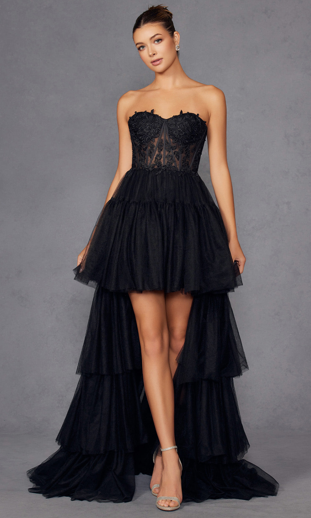 All eyes will follow the dramatic profile of Juliet Dresses JT2488S style. From its intricately embroidered bodice to the layered high low hemline, this design makes a bold entrance. The strapless silhouette features a sweetheart neckline and illusion corset structure that enhances the waist while maintaining a modern edge. Its removable overskirt offers sweeping dimension and soft movement throughout. Make a fearless yet graceful appearance with Juliet Dresses JT2488S, a gown that turns heads in the most sophisticated way. Models are wearing Black, and Red colors.