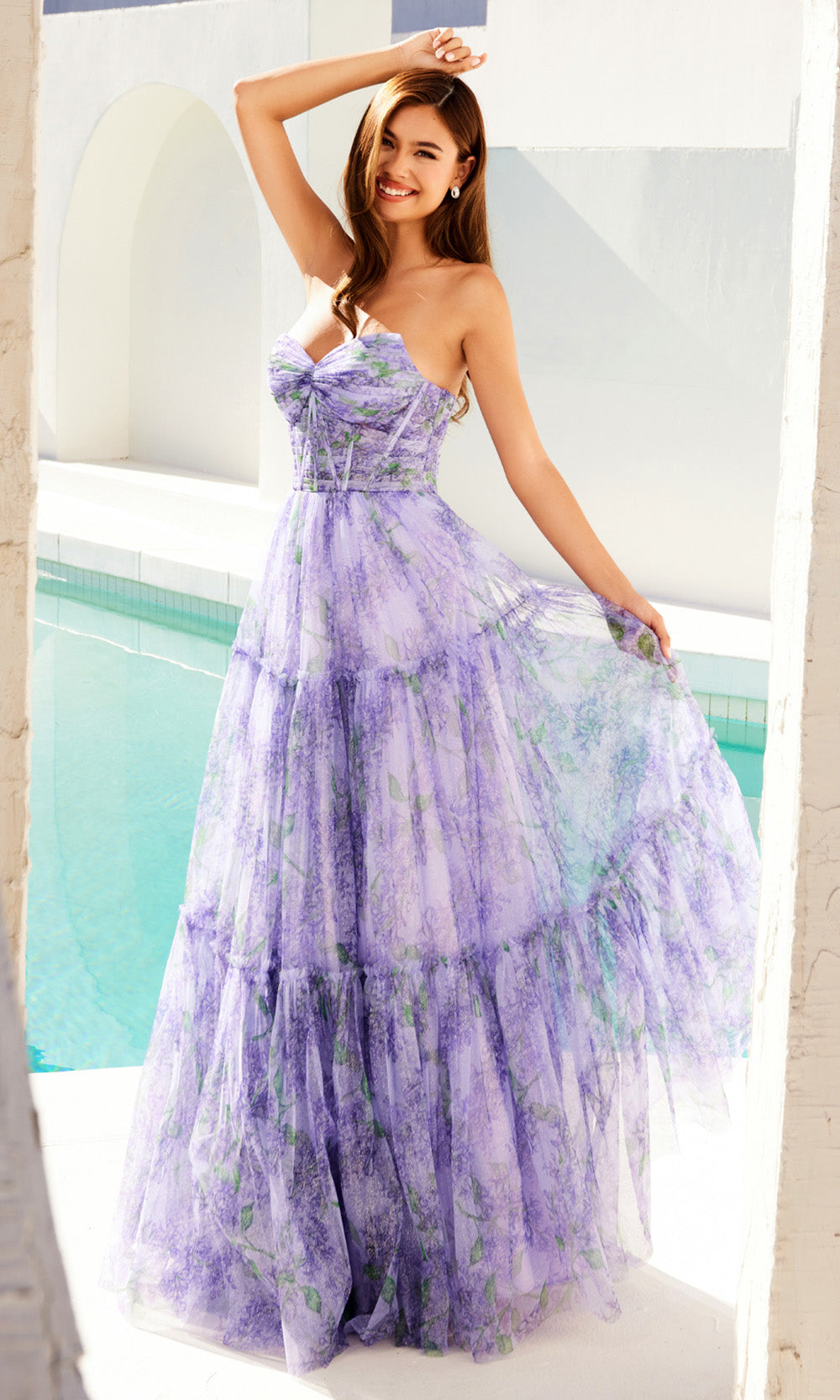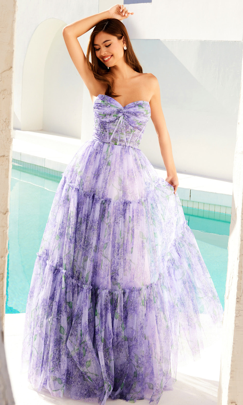 Romantic and whimsical, Juliet Dresses JT2507A enchants with every detail. The strapless bodice is shaped with a soft sweetheart neckline and features sheer boning for a structured yet delicate finish. The skirt flows into multiple tiers, creating a layered A-line silhouette that adds volume and charm. This floral print gown balances softness with structure for a standout look. Choose Juliet Dresses JT2507A for dreamy moments that require feminine flair and graceful movement. Models are wearing Lilac, and White / Pink colors.