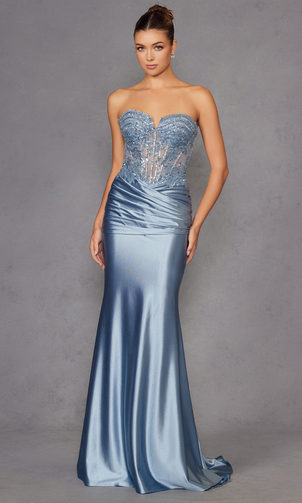 Step into elegance with Juliet Dresses JT2530K. This strapless gown commands attention with a structured sweetheart neckline and a beaded corset bodice that contours the torso beautifully. Pleated detailing along the hips adds a touch of texture and enhances the figure, while the sheath silhouette gracefully flares into a dramatic floor-length hem. A subtle sweep train completes the design, lending a majestic finish to each movement. Juliet Dresses JT2530K is the go-to gown for evening affairs where timeless allure meets modern edge. Models are wearing Antique Blue, and Navy Blue colors.