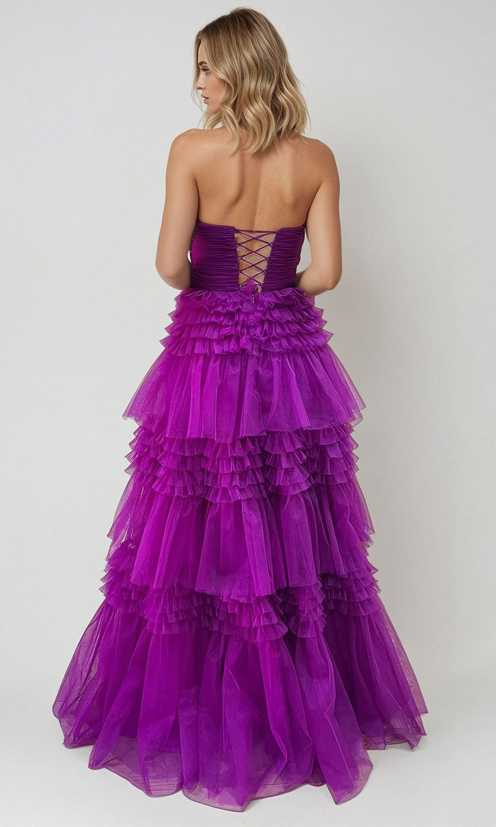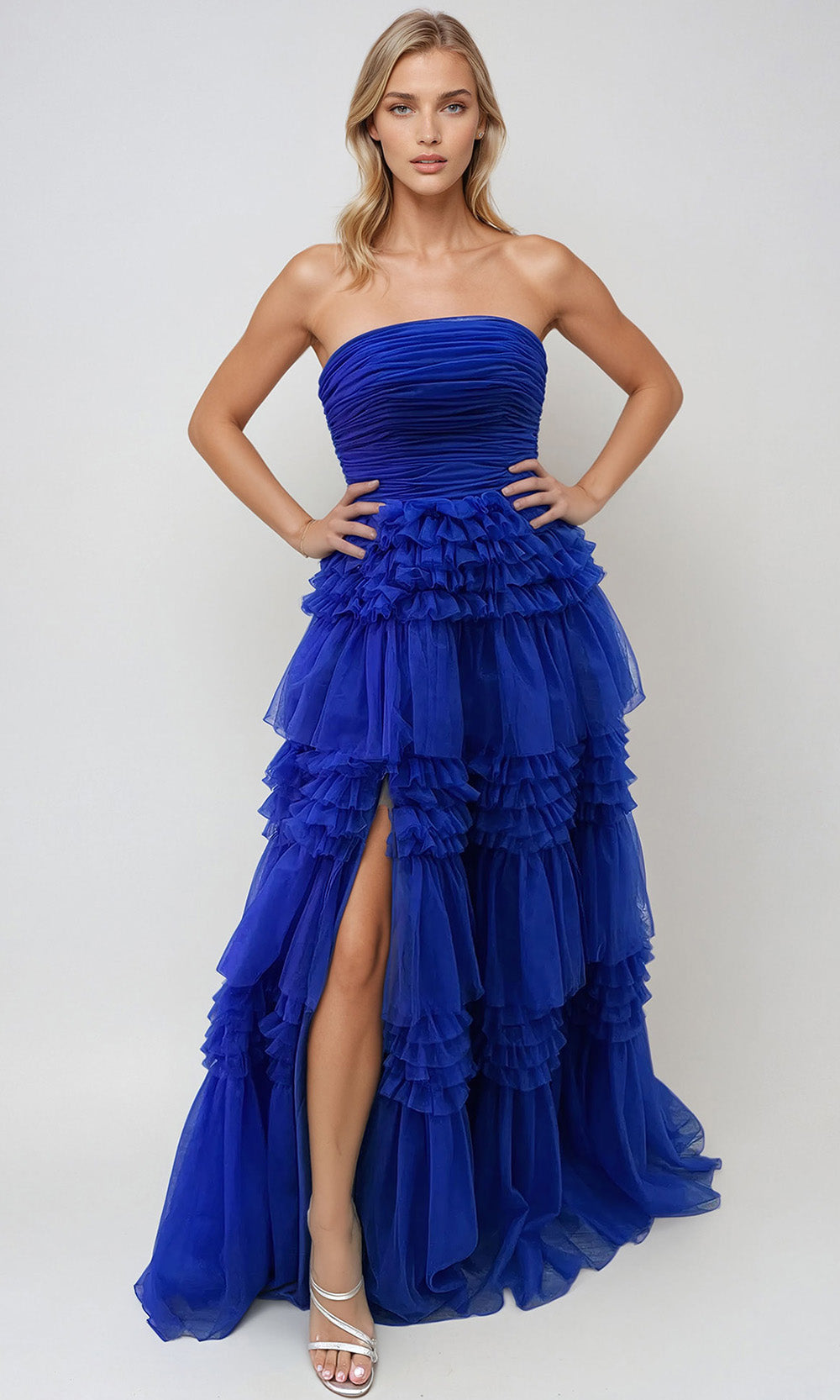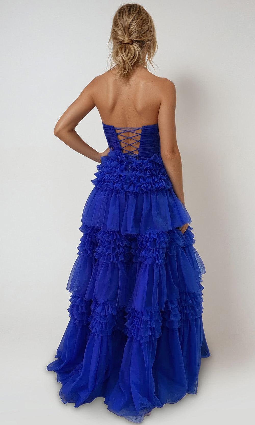 | Details: | Ruched Bodice, Tiered Ruffle Skirt, High Slit, Lace-Up Back, Strapless |
