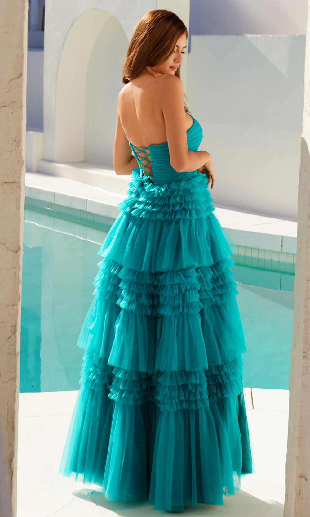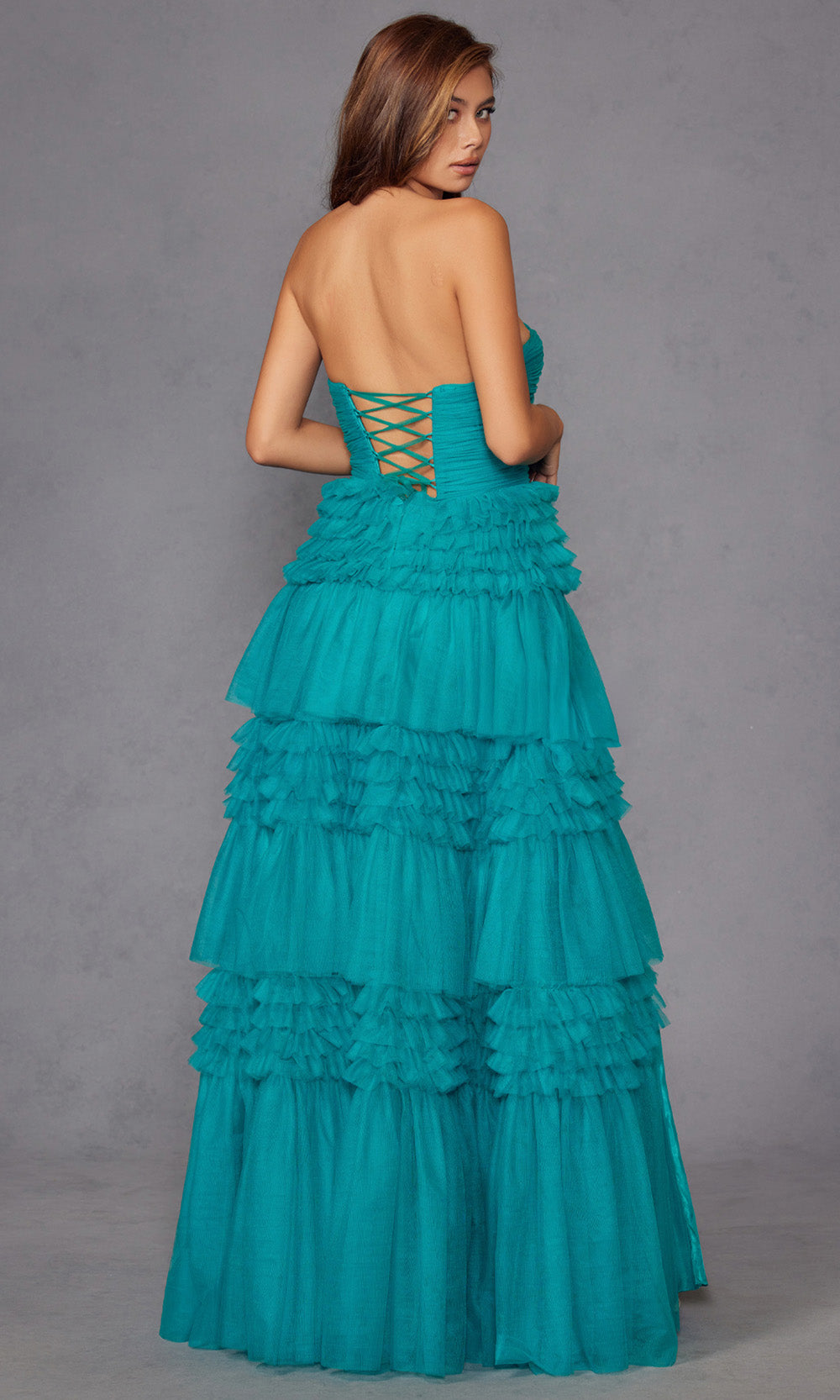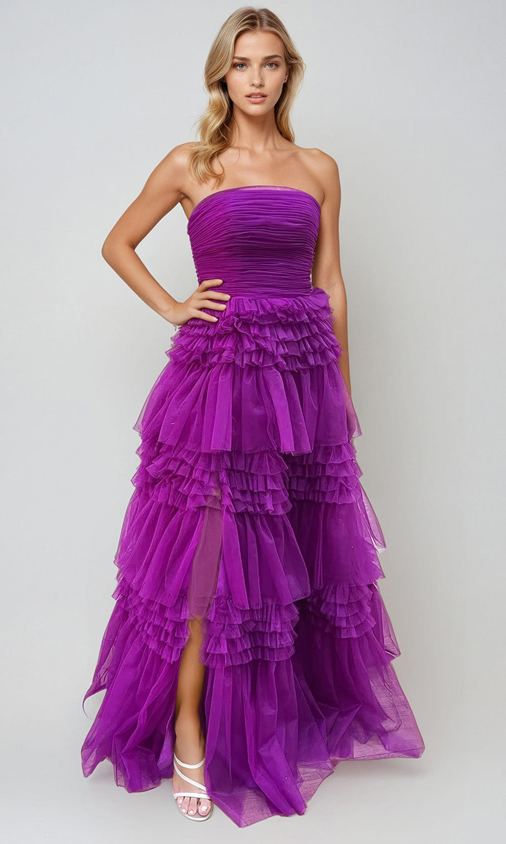 | Details: | Ruched Bodice, Tiered Ruffle Skirt, High Slit, Lace-Up Back, Strapless |