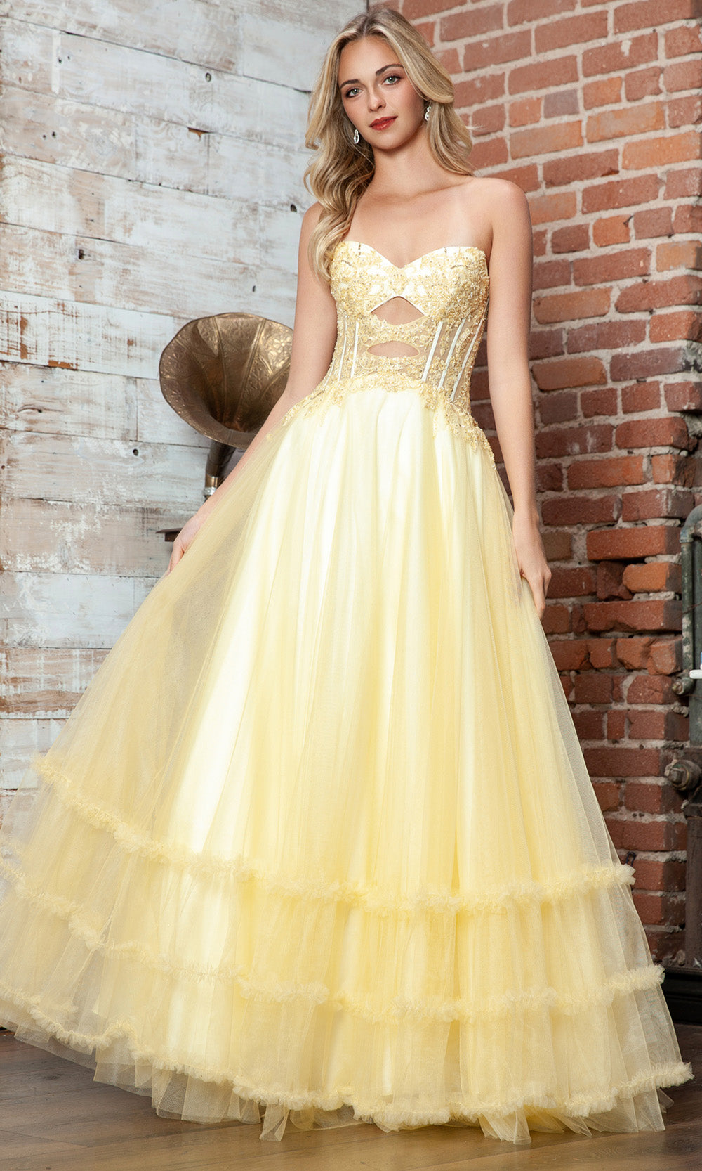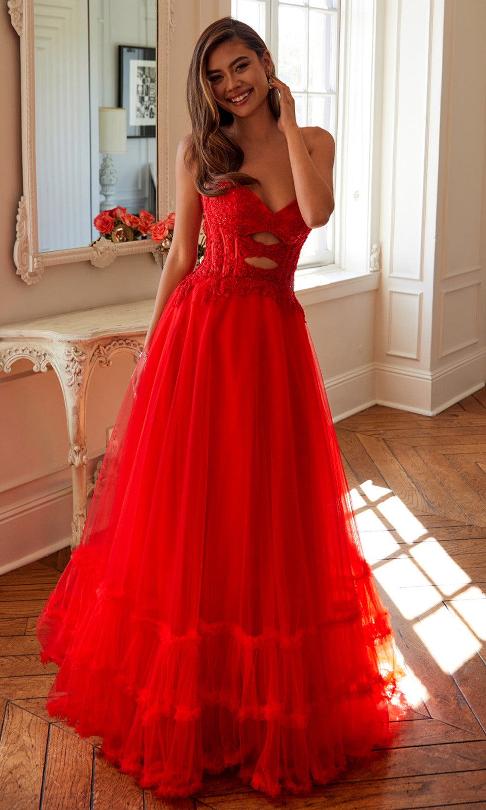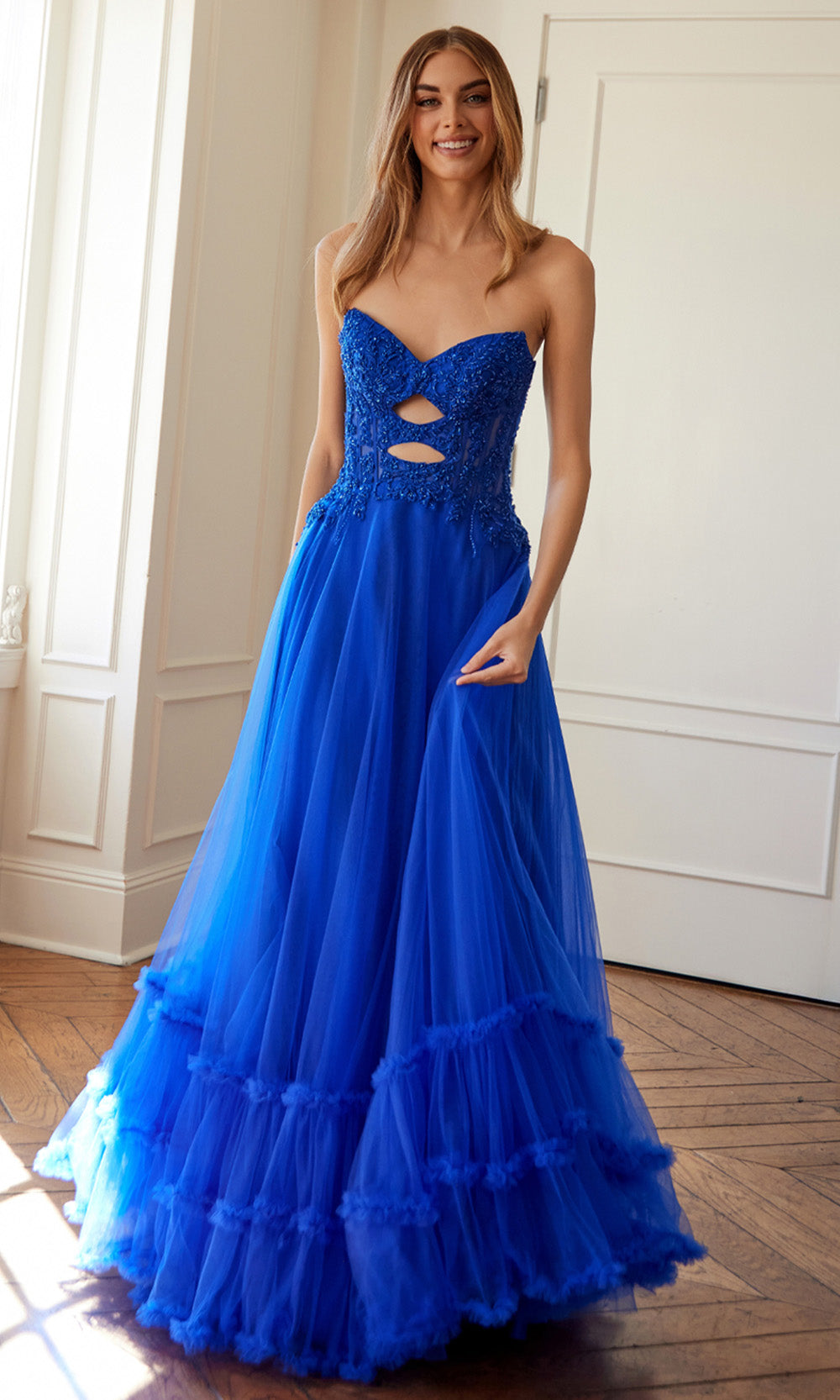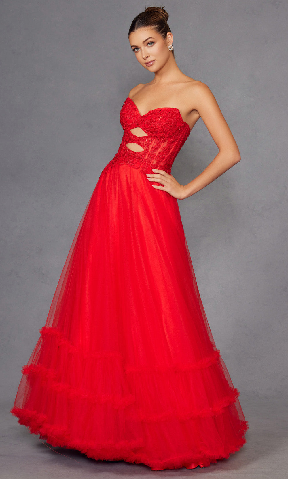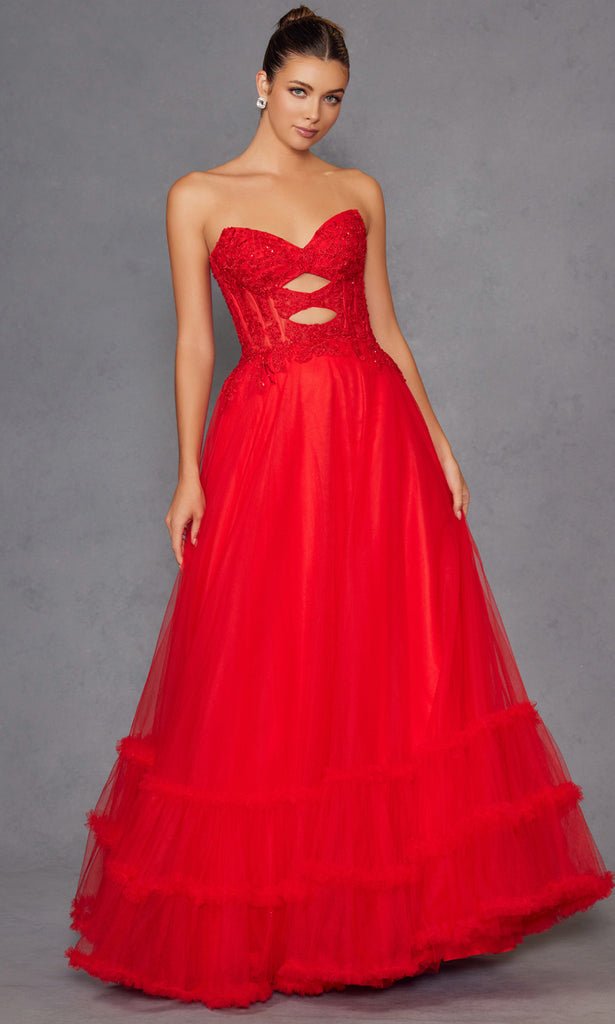 A fairytale unfolds in this enchanting Juliet Dresses JT2561S style made for moments that deserve lasting impressions. It features a strapless sweetheart neckline with an illusion corset bodice enhanced by elegant cutouts and embroidery that add intrigue. The natural waistline blossoms into a voluminous layered A-line skirt finished with a graceful ruffled hem. The combination of structure and softness makes this style ideal for formal celebrations. Create memories in timeless beauty wearing Juliet Dresses JT2561S and embrace its refined allure. Models are wearing Red, Royal Blue, and Yellow colors.