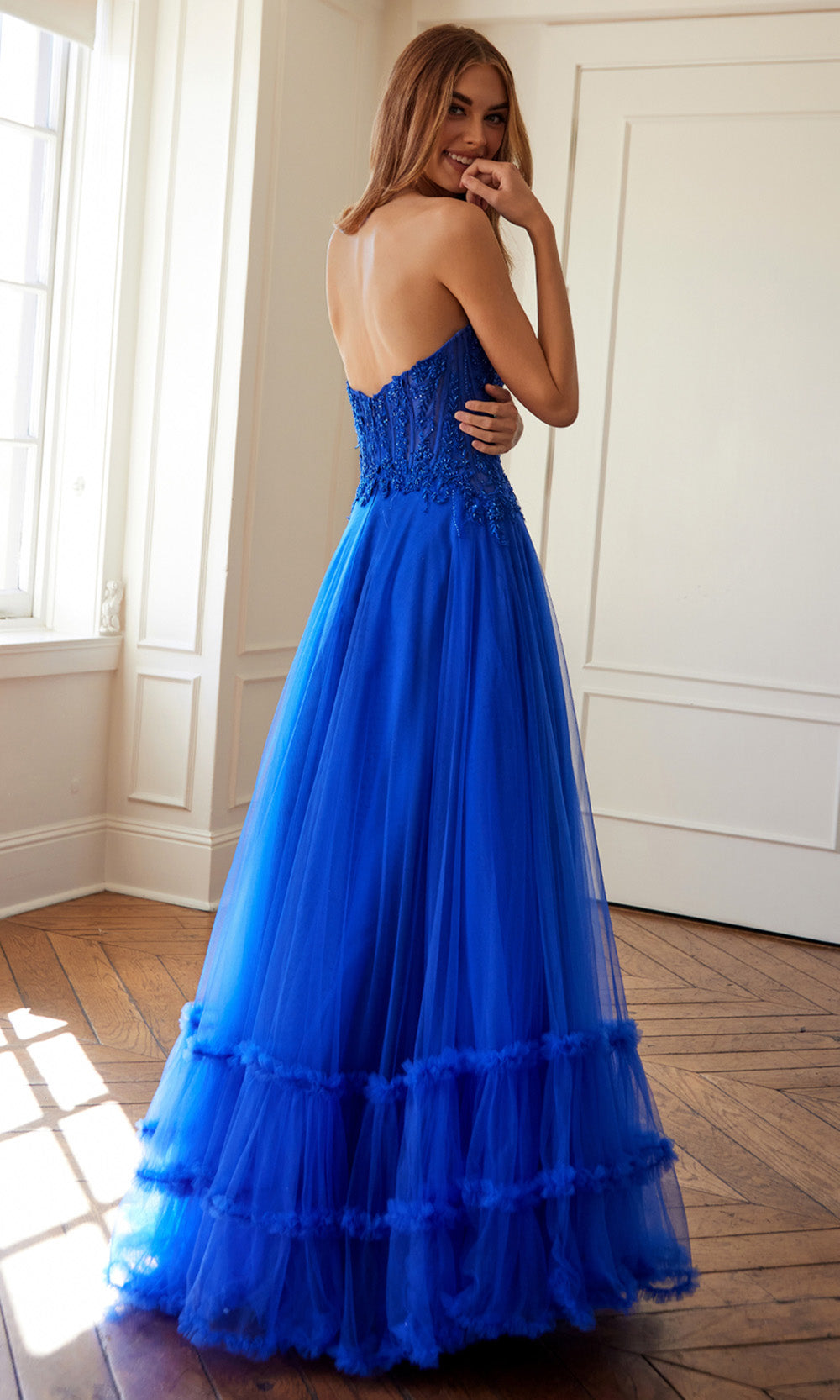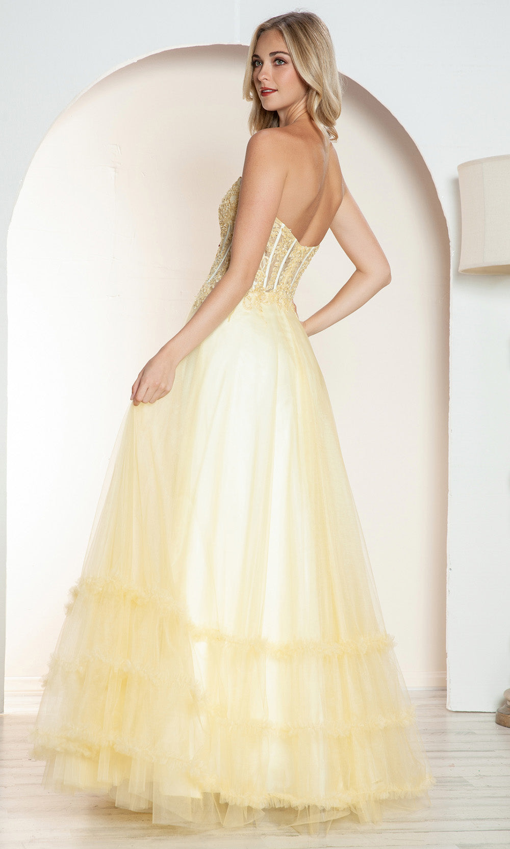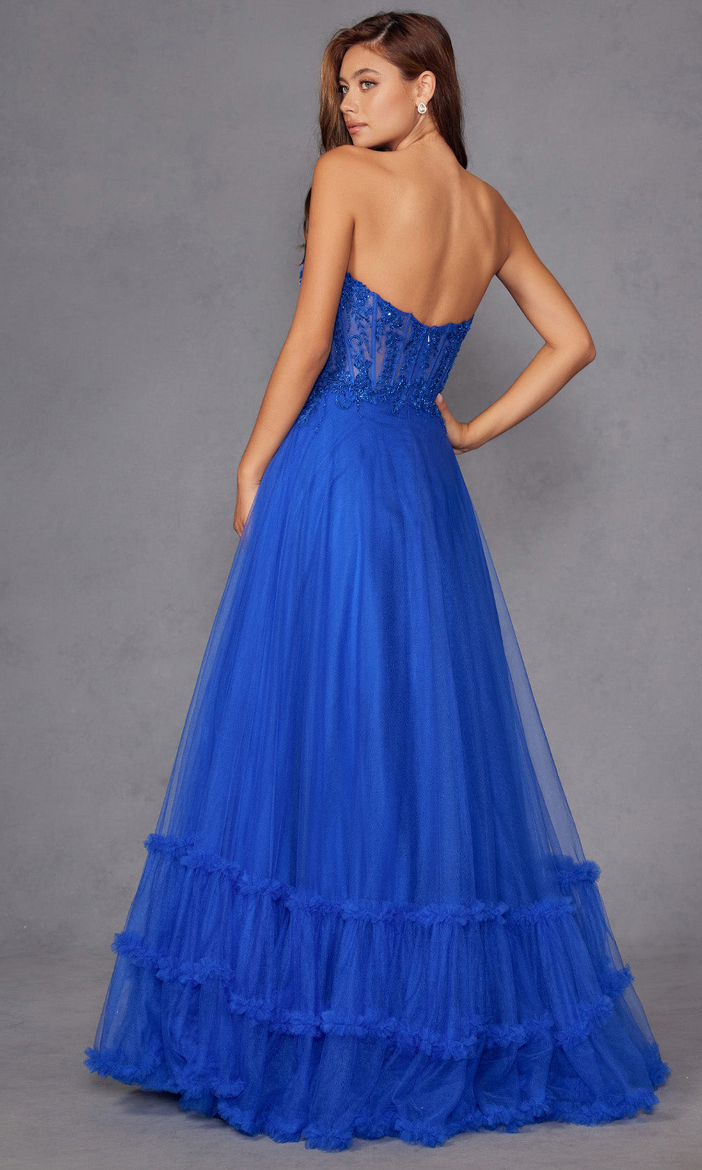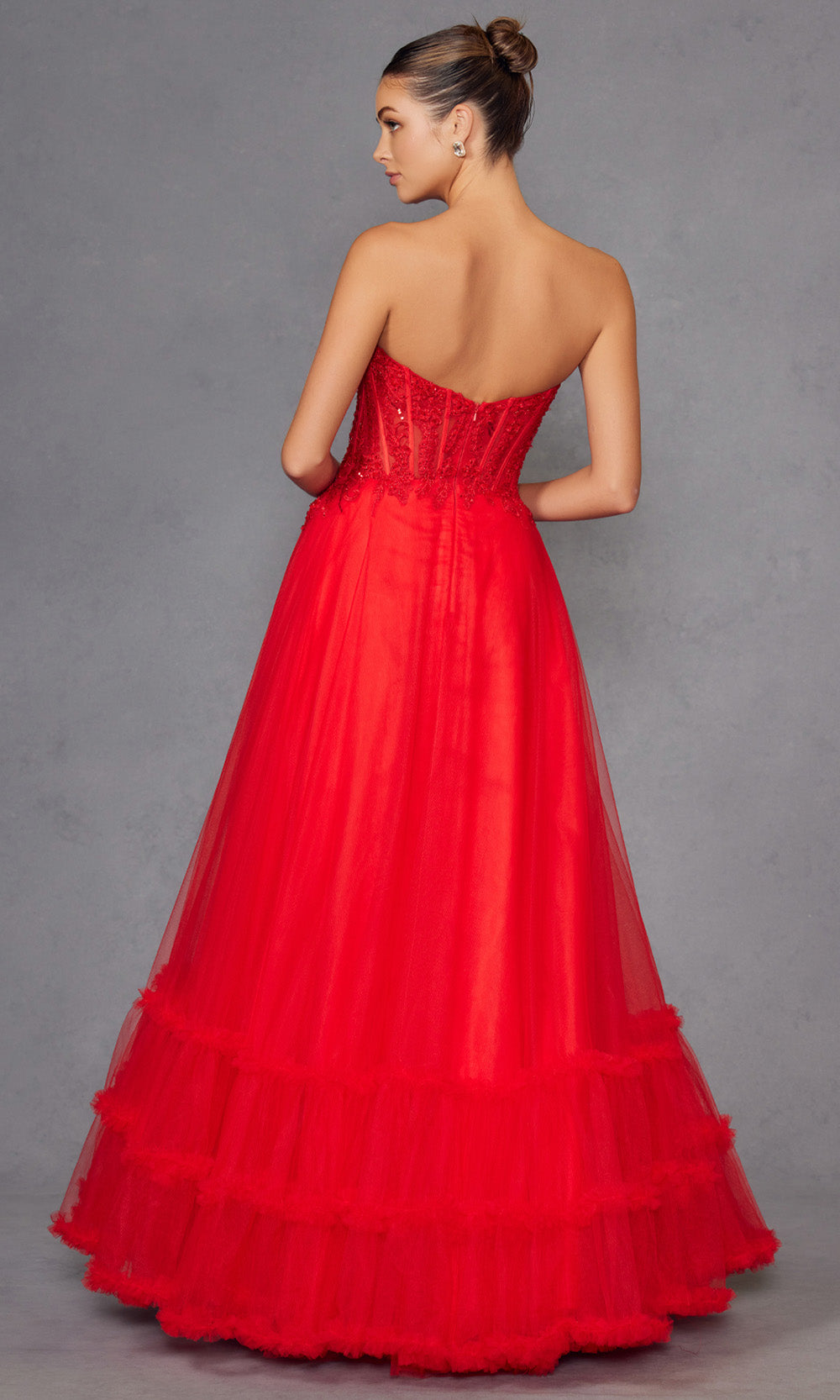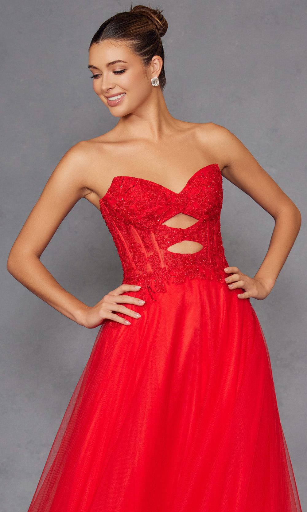 A fairytale unfolds in this enchanting Juliet Dresses JT2561S style made for moments that deserve lasting impressions. It features a strapless sweetheart neckline with an illusion corset bodice enhanced by elegant cutouts and embroidery that add intrigue. The natural waistline blossoms into a voluminous layered A-line skirt finished with a graceful ruffled hem. The combination of structure and softness makes this style ideal for formal celebrations. Create memories in timeless beauty wearing Juliet Dresses JT2561S and embrace its refined allure. Models are wearing Red, Royal Blue, and Yellow colors.