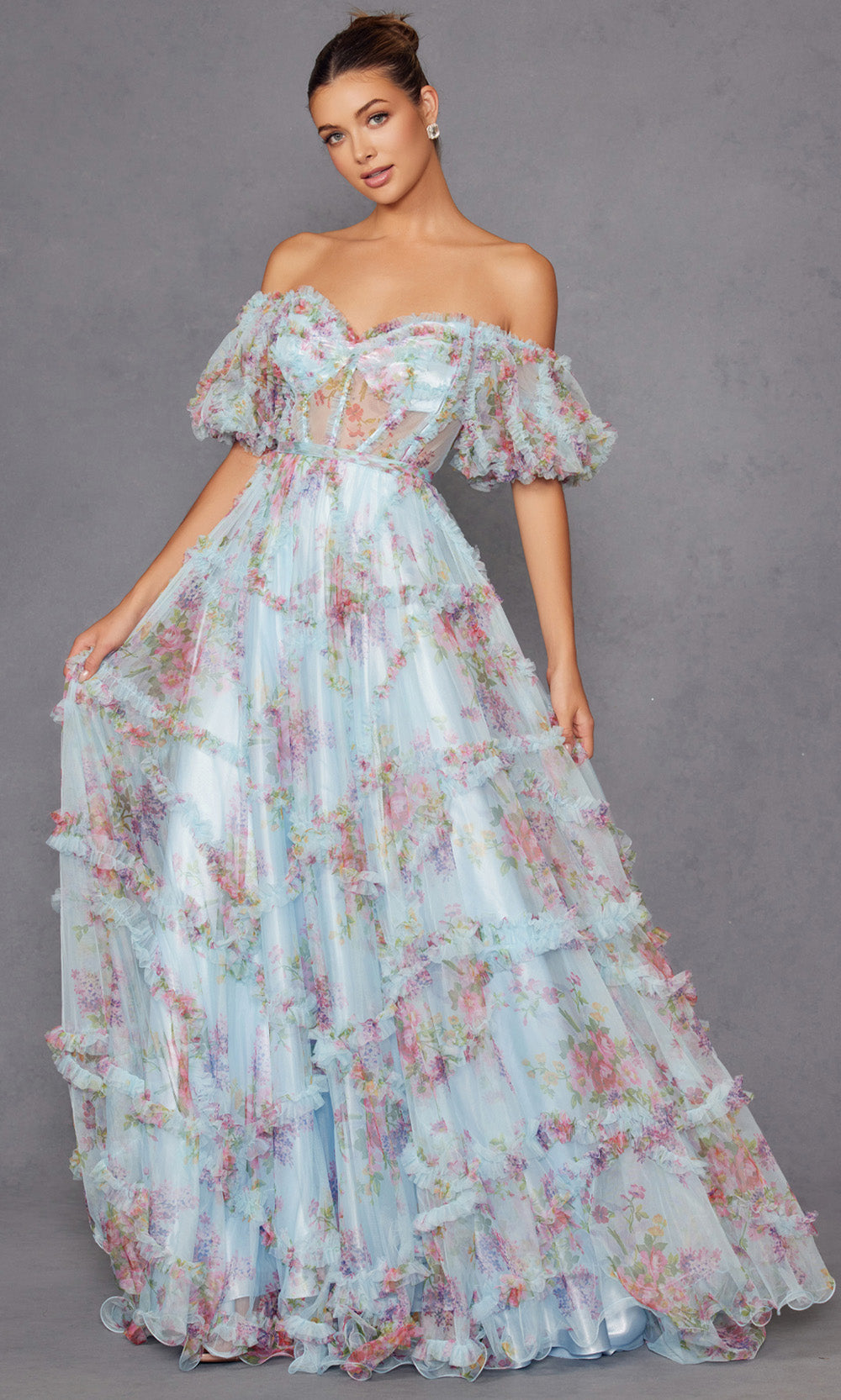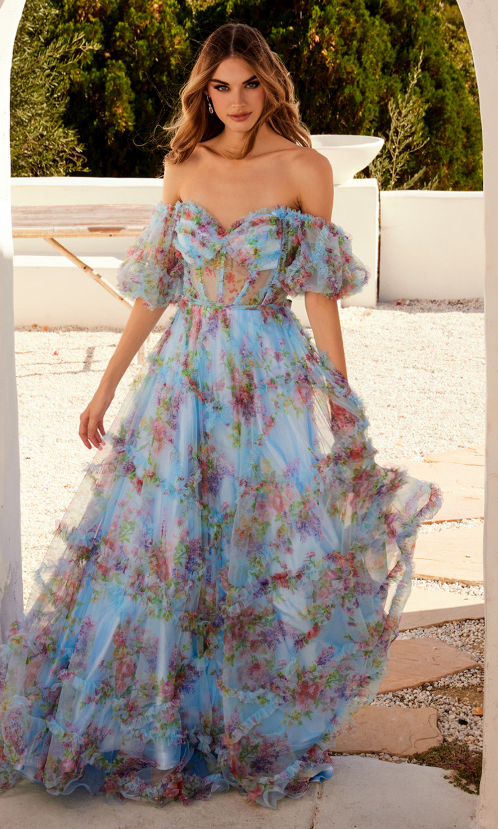 Graceful charm meets dimensional beauty in the fluid silhouette of Juliet Dresses JT2887C. Off-shoulder puff sleeves and sweetheart neckline frame the sheer corset bodice, adding a soft romantic touch to the structured foundation. The full A-line skirt flows in layered tiers, decorated with detailed floral print and ruffled textures. From upscale galas to special celebrations, this look radiates whimsical energy with modern appeal. Choose Juliet Dresses JT2887C when you want a gown that captures elegance in motion. Models are wearing Blue, and White colors.