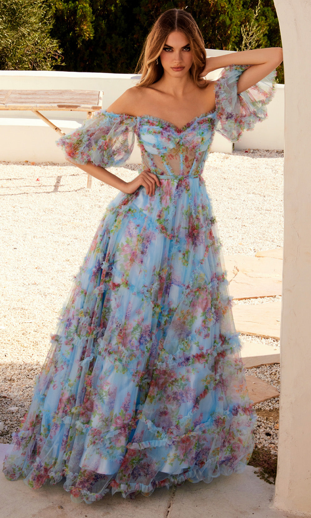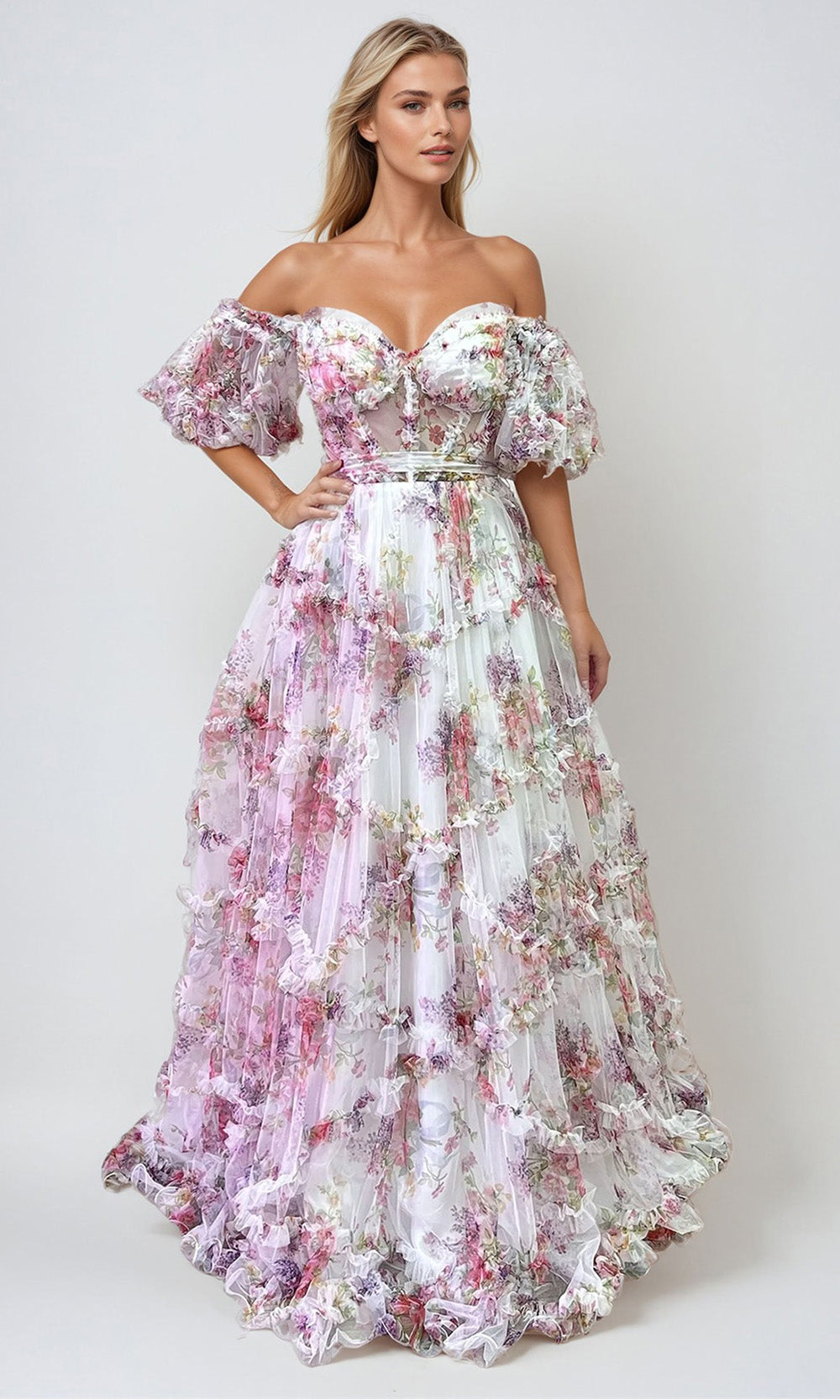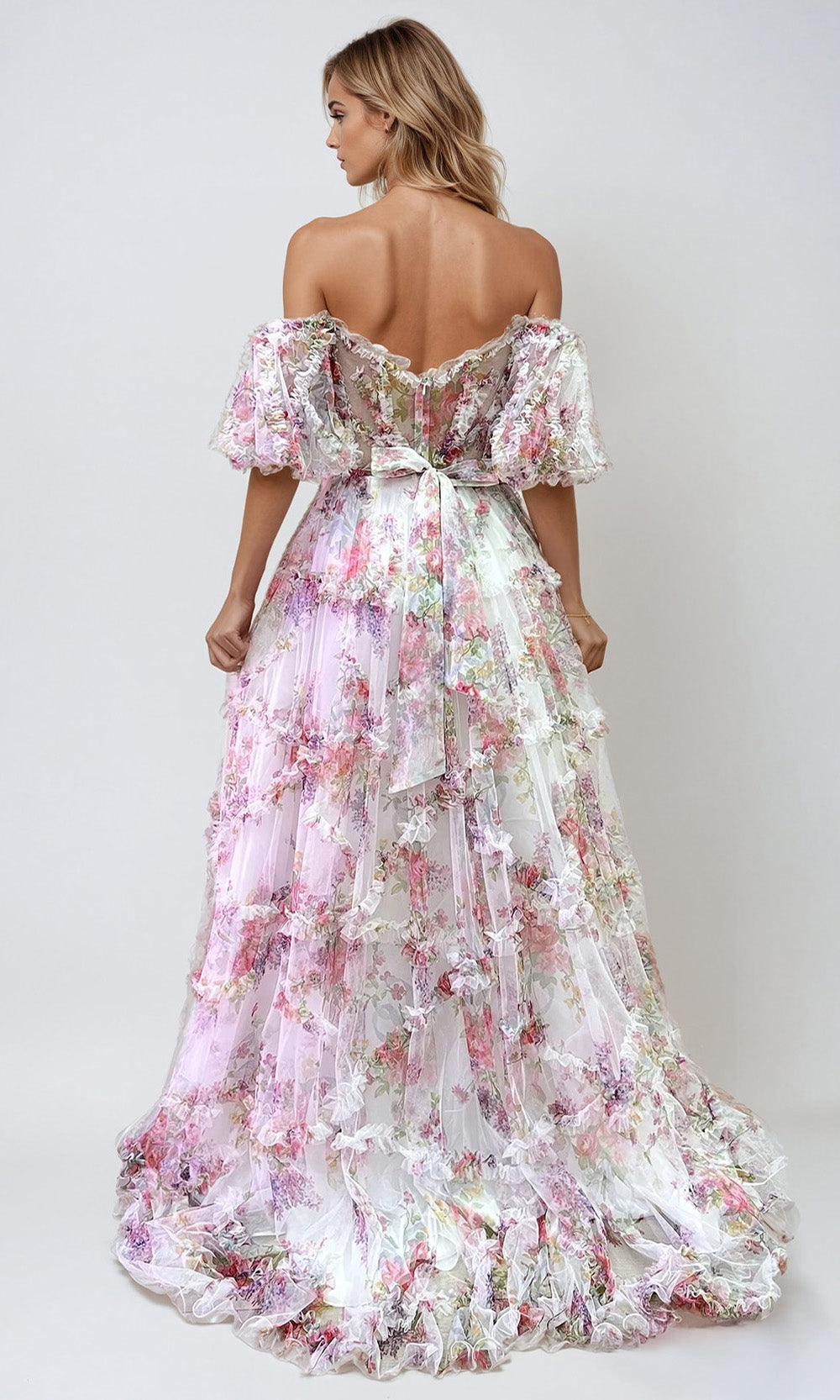 | Details: | Off-Shoulder Puff Sleeves, Sheer Corset Bodice, Floral Print, Ruffle Trim, V-Open Back |