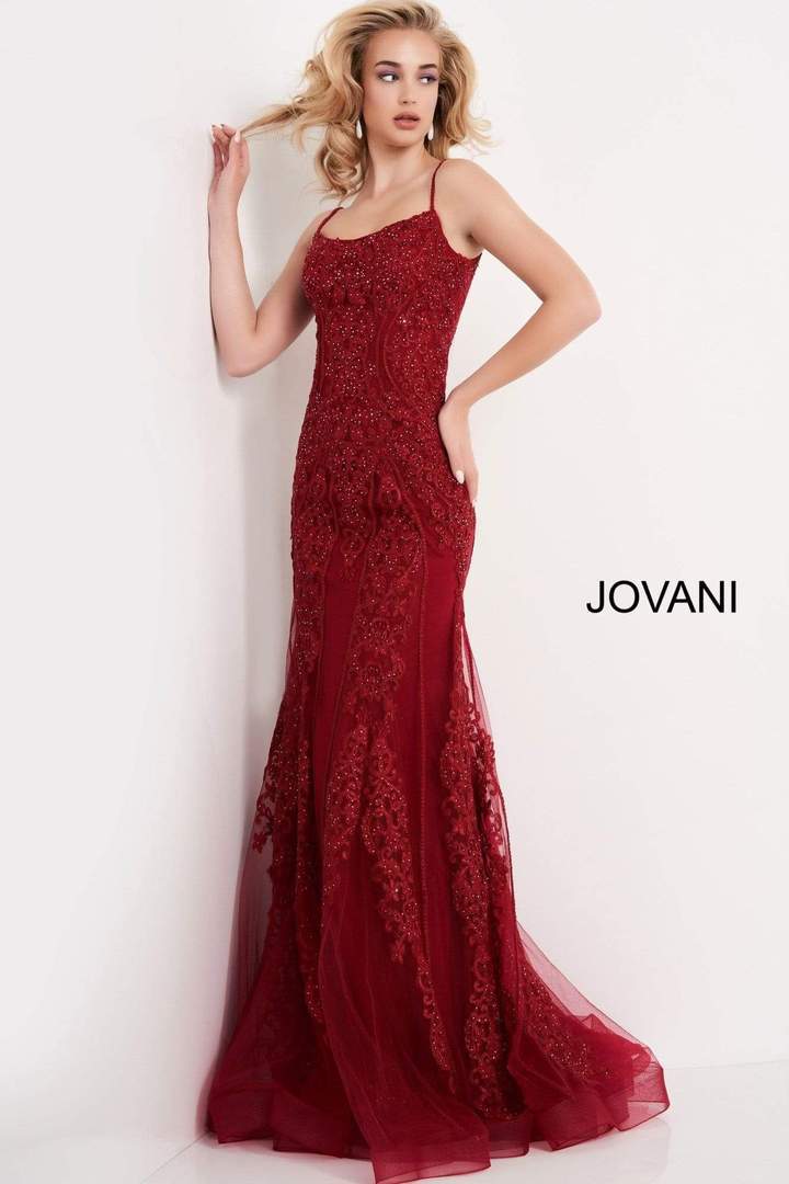 Ornamented with classy embroidered appliques and beadwork trailing down its length, this gown shows a scoop neckline with spaghetti straps. Crafted with a scoop design on a corset cinched back, tonal lining and bedecked sheer tulle create a mermaid silhouette with a gossamer train.Â