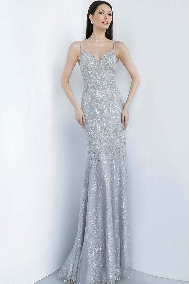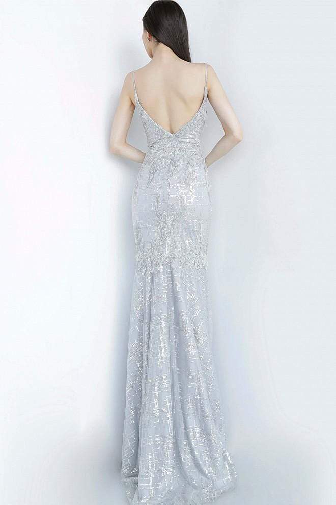 Graces a sleeveless, V-neckline with spaghetti straps and a low V-back. It's fitted bodice is designed with gorgeous embroidery and flourishes a full length trumpet skirt. Model is wearing Silver color.