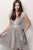 Features a sleeveless, plunging V-neckline with fitted bodice adorned with embellishments and sheer panels. The back shows a low V-cut and a zipper closure. From the waist begins a mid-thigh A-line skirt. Model is wearing the Silver/Nude color.