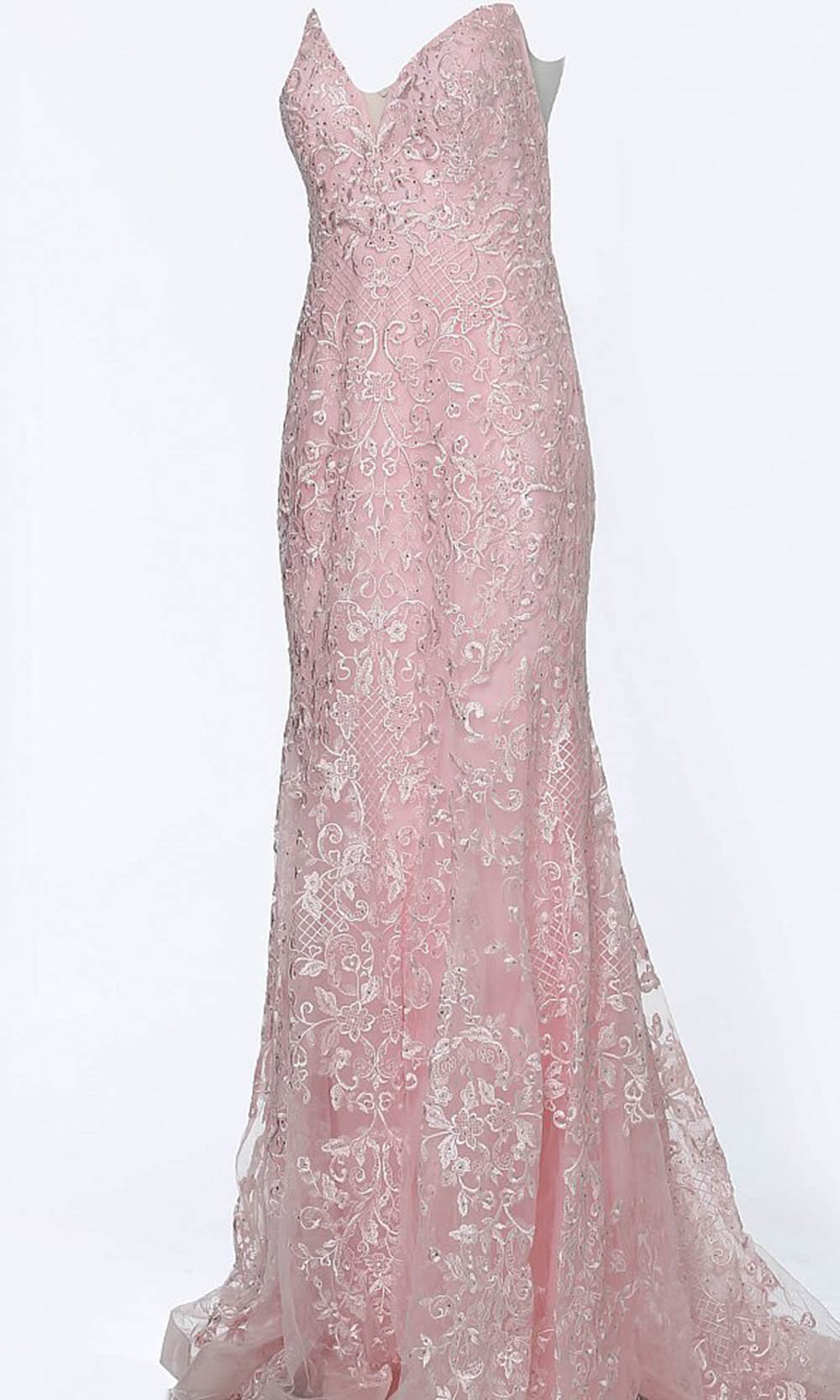 | Details: | Sleeveless, Plunging neckline, Straps, Fitted bodice, Embroidery, Trumpet skirt, Open back, Sweep train |