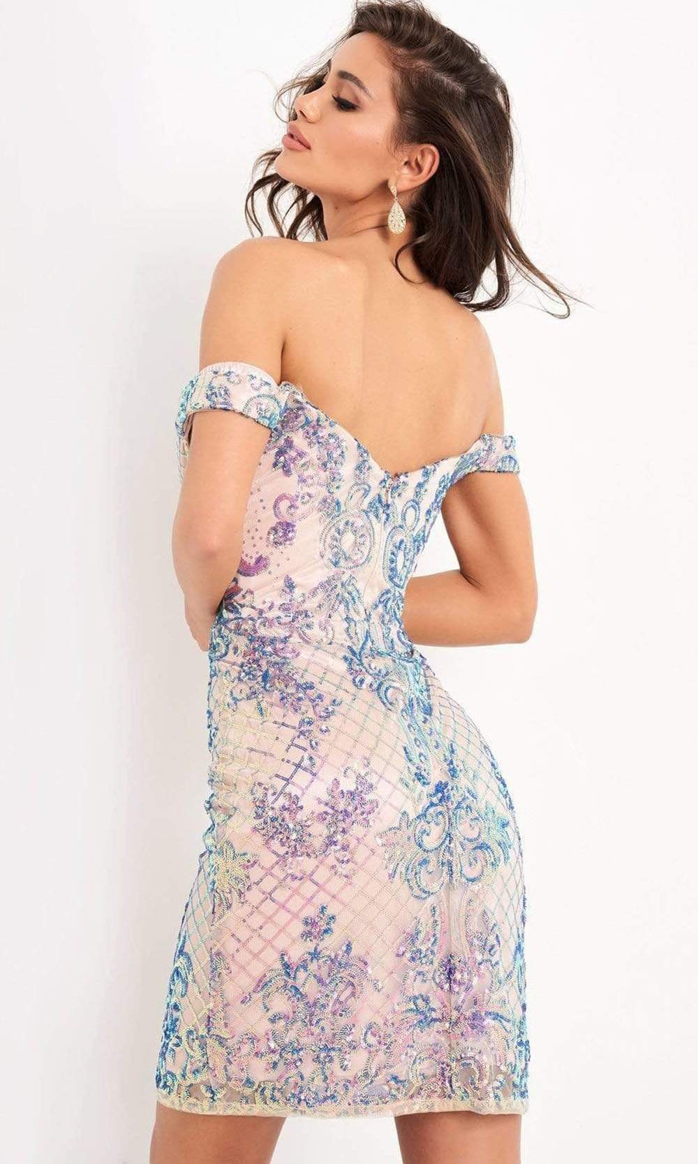 You are set to star struck in this homecoming cocktail dress by JVN by Jovani JVN05251. This sheath silhouette mini-length dress is adorned with lattice and patterned sequins, that perfectly complement the alluring off-shoulder plunging neckline. The dress features a sheer inset support between the bust, and a hidden back zipper closure. Be naturally amazing as you strut your stuff in Jovani. Models are wearing Nude and Lilac colors.