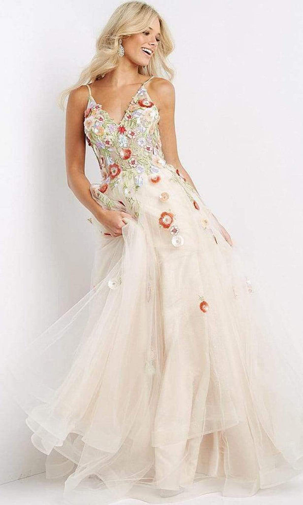 Fashionable and fun, this vintage-inspired prom dress in JVN by Jovani JVN08082 will turn heads all night long. This full length gown features a spaghetti strap bodice with a plunging v-neckline, form-fitting and fully adorned with retro floral appliques. The lavish A-line skirt is made with layers and layers of sheer fabric, while minimal floral appliques are scattered around to complement the bodice. This Jovani creation is sure to make you the darling of the party!