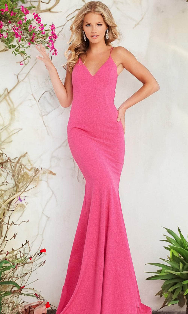 Aspire to exude dominance among the upscale crowd in this JVN by Jovani JVN08467 creation. Stylishly designed with tailoring lines on a stretch glitter design, this stunner crafts a plunging v-neckline with spaghetti straps. The back has a lace up bandeau with a low open cutout and an invisible zipper closure. Complete with a mermaid silhouette with a sweep train, this gown is a true showstopper. Embrace your inner star and leave a lasting impression in this mesmerizing JVN by Jovani JVN08467 masterpiece. Models are wearing the Light Blue and Fuchsia colors.
