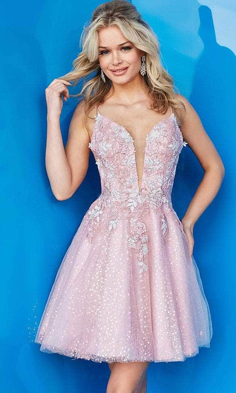 Surround yourself with a sparkle of glamour when you walk in this dazzling JVN by Jovani JVN23301. This masterpiece will make you look gorgeous as it showcases an elegant sleeveless bodice that is held with spaghetti straps designed perfectly with floral appliques. This ensemble has a sheer in that you will see in the plunging v-neckline. The back is mid-open and a back zipper closure is provided for a comfortable feeling. A natural waistline flows gracefully into an A-line silhouette that gleams perfectly. JVN by Jovani's masterpiece will let you celebrate that divine feminine beauty! Models are wearing Periwinkle and Blush colors.