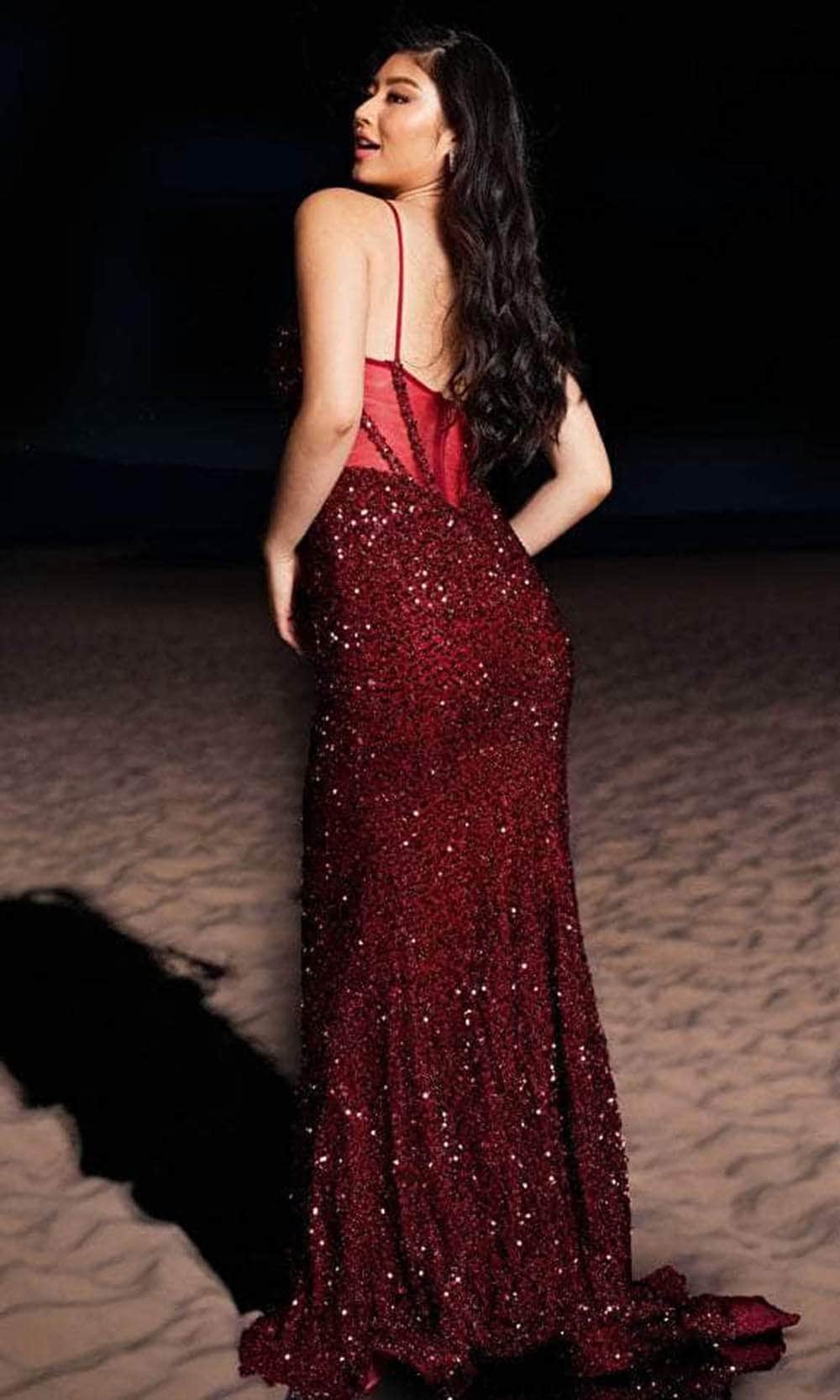 Effortlessly blending classic elegance with contemporary allure, the Jovani 25908 is a vision of sophistication. The fitted dress, crafted from shimmering sequin material, glimmers with every move. Its sheer back and stylish slit infuse a hint of drama and sophistication, elevating your overall look. With a floor-length design, it ensures a commanding presence, while the open-back style adds a modern and daring twist to the ensemble. The spaghetti strap illusion V-neckline and sleeveless cut embody a timeless and graceful allure. Jovani 25908 ensures an unforgettable statement. Model is wearing Burgundy color.