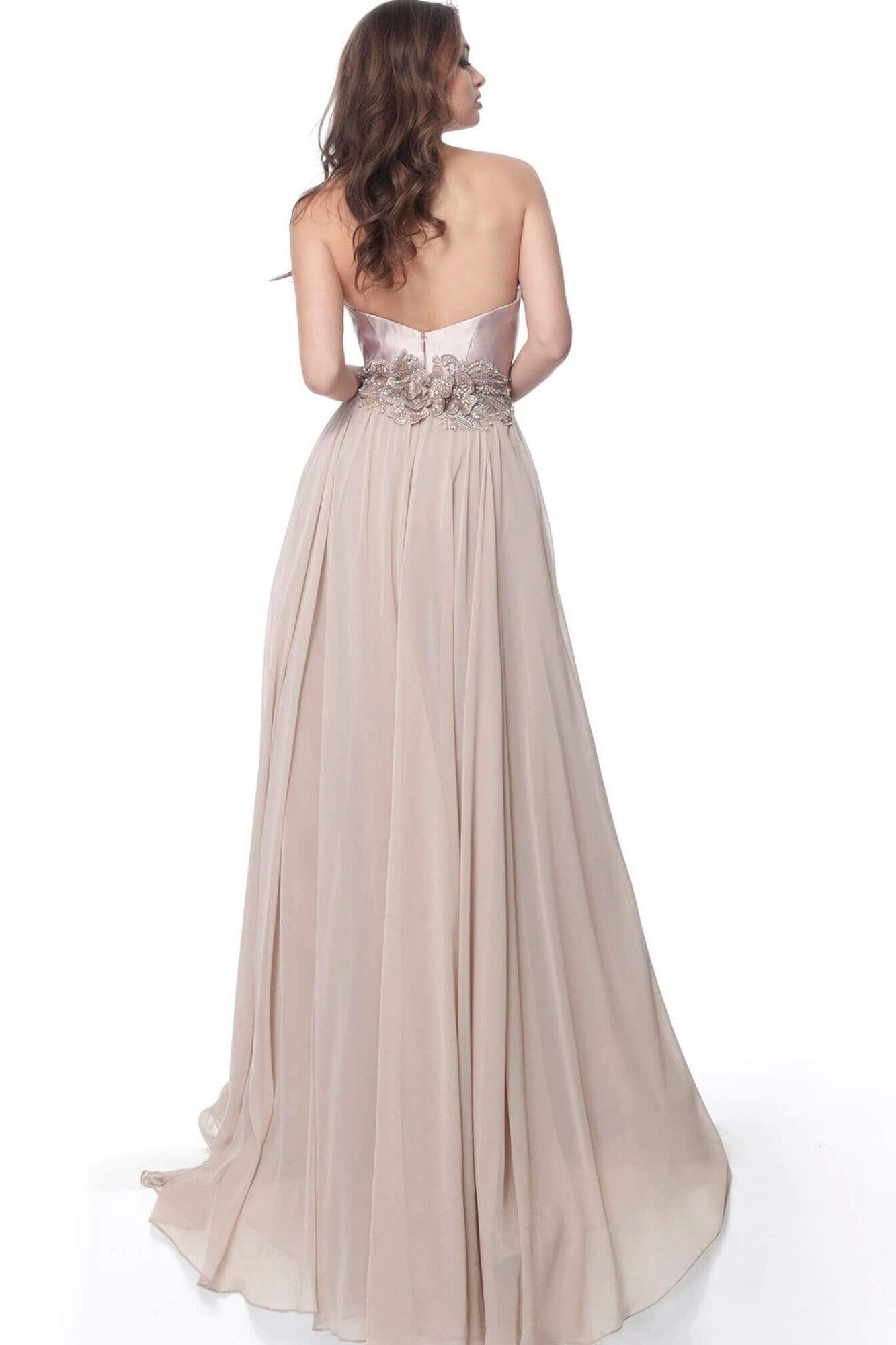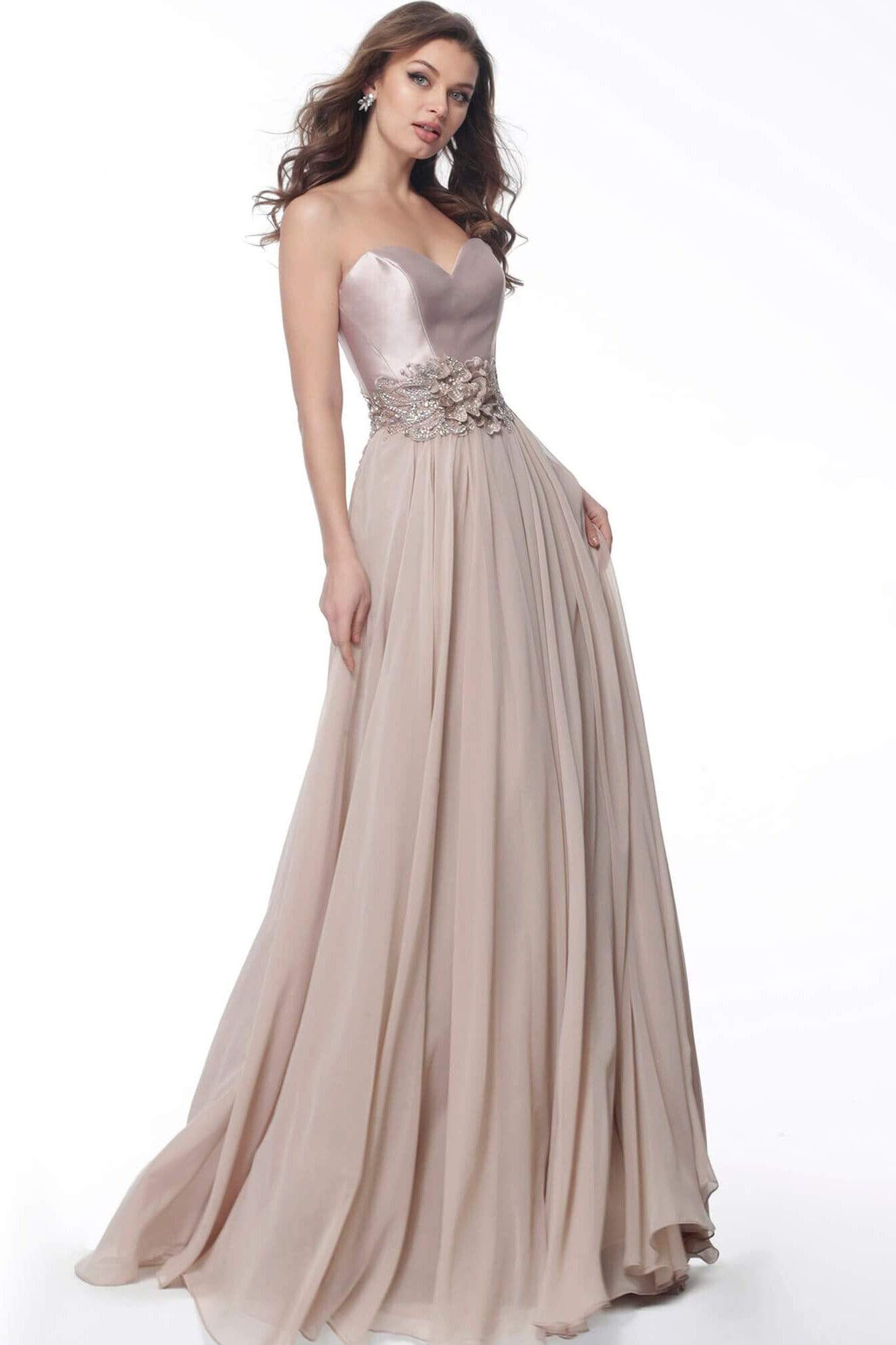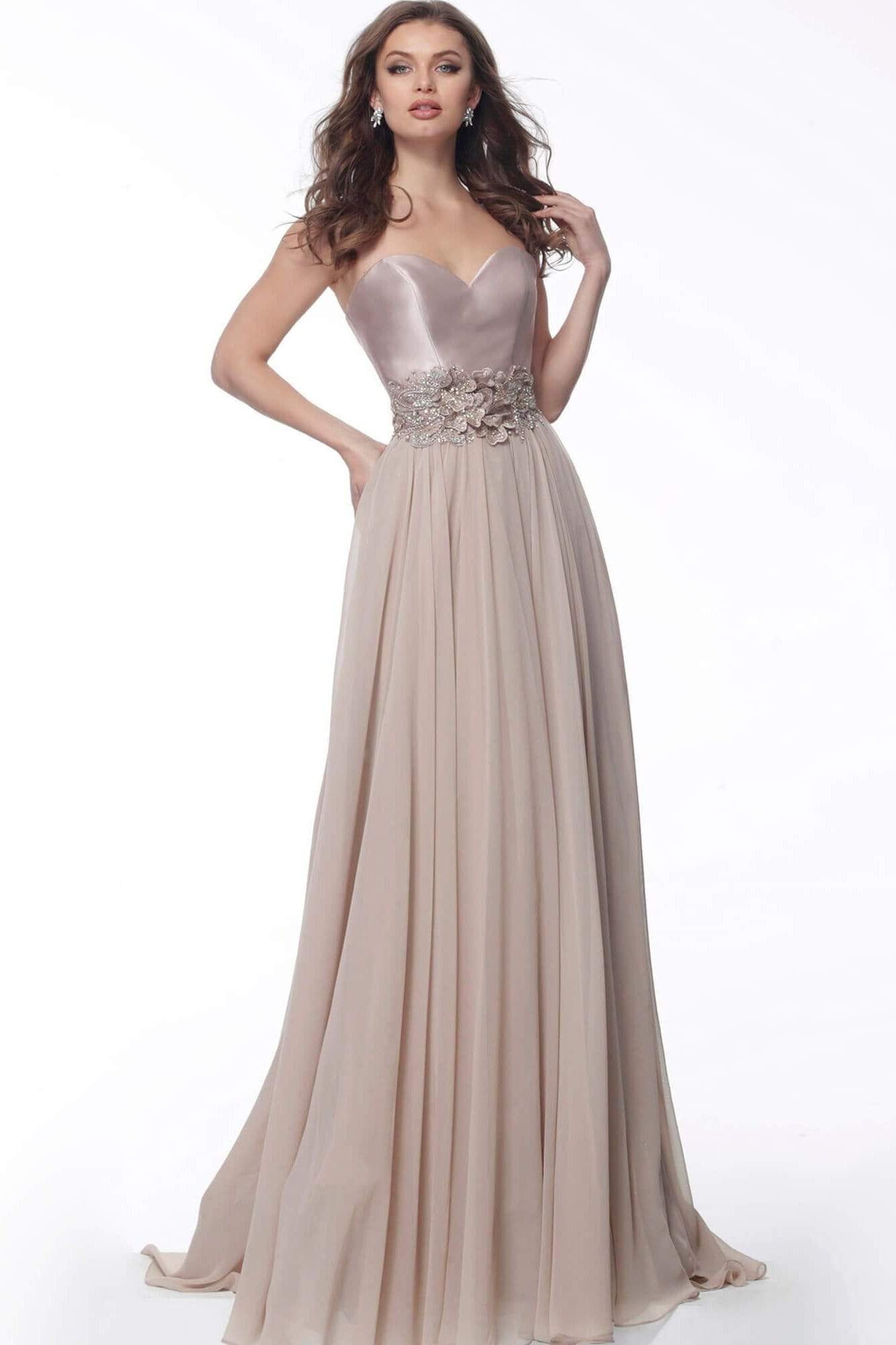 Be dressed up gorgeously in this beautiful JVN by Jovani JVN62406 evening dress. Contoured with princess seams, the fitted bodice features a pronounced strapless sweetheart neckline, complemented with mid-open zipped up back. The natural waist is prettily designed with floral appliques as it gives way to the pleated a-line skirt that elegantly cascades to the floor length hemline. Charmingly catch attention wearing this JVN by Jovani JVN62406piece. Model is wearing Nude color.