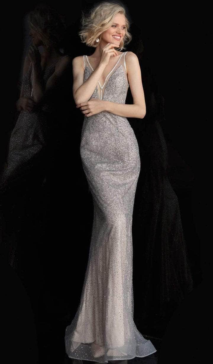 This evening gown is styled in beaded net with a nude underlay with a sleeveless bodice topped with an illusion V neckline and illusion V back. From the metallic band that cinches the natural waistline reveals a sheath skirt that tapers to full length finished with a sweep train. Model is wearing Silver/Nude color.