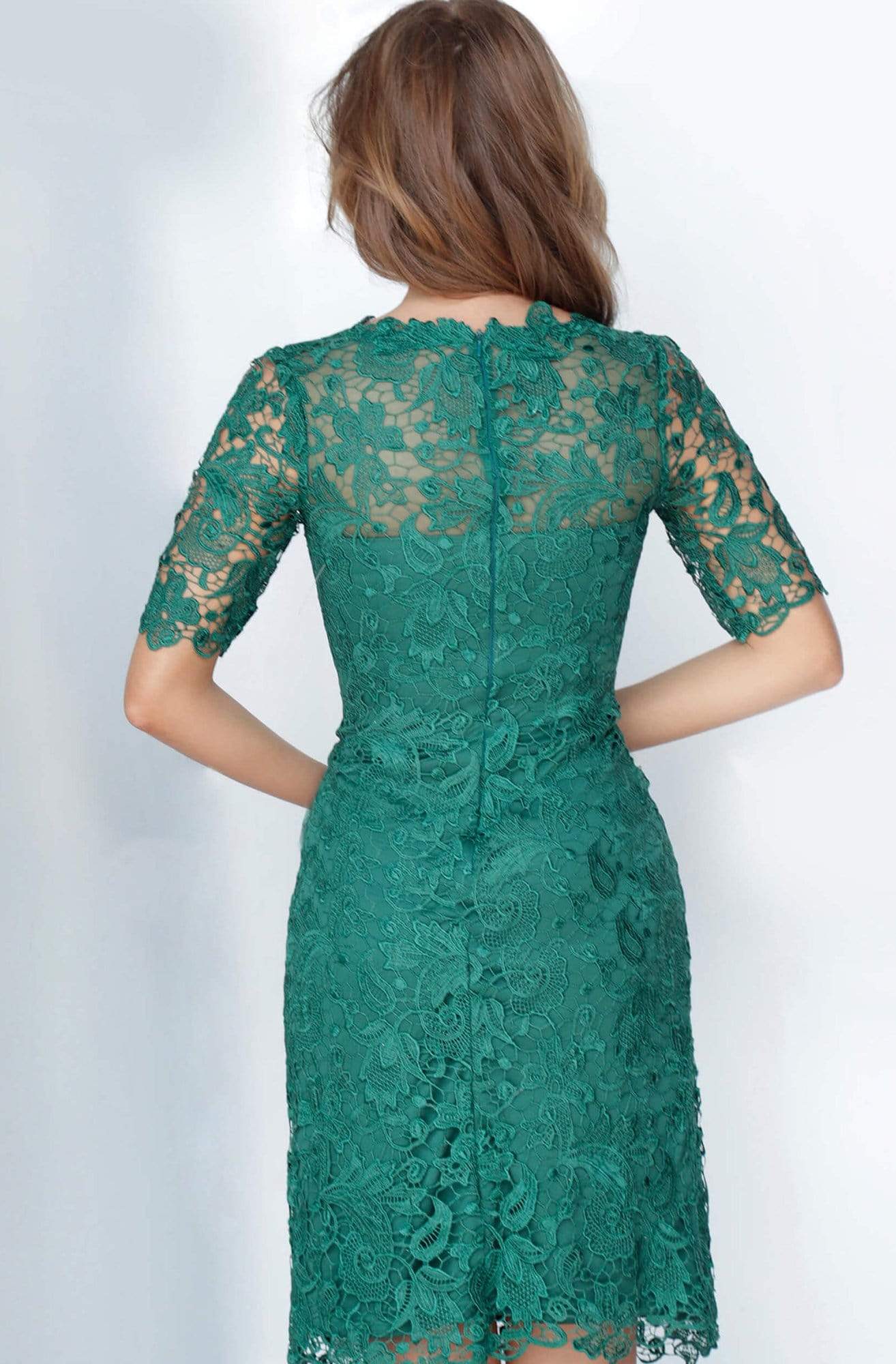 This lace cocktail dress captivates in a jewel neckline with short sleeves. The fitted bodice has a back zipper closure and features a mid-thigh fitted skirt. Model is wearing Dark Green color.