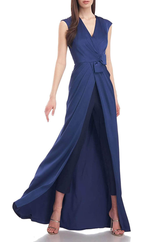 Make your presence known while glowing with sophistication Kay Unger 5545927 creation. Designed with tailoring lines and designed with ruching that gathers at the natural waist, this stunner features a v-neckline with a cap sleeve bodice. Accented with a ribbon accent, this stunner is designed with slim cropped jumpsuit pants. A split overskirt bestows a dramatic flair to the ensemble. Standout with sophistication in this Kay Unger 5545927 masterpiece, ensuring you stand out in the crowd. Models are wearing the Midnight and Soft Blush colors.