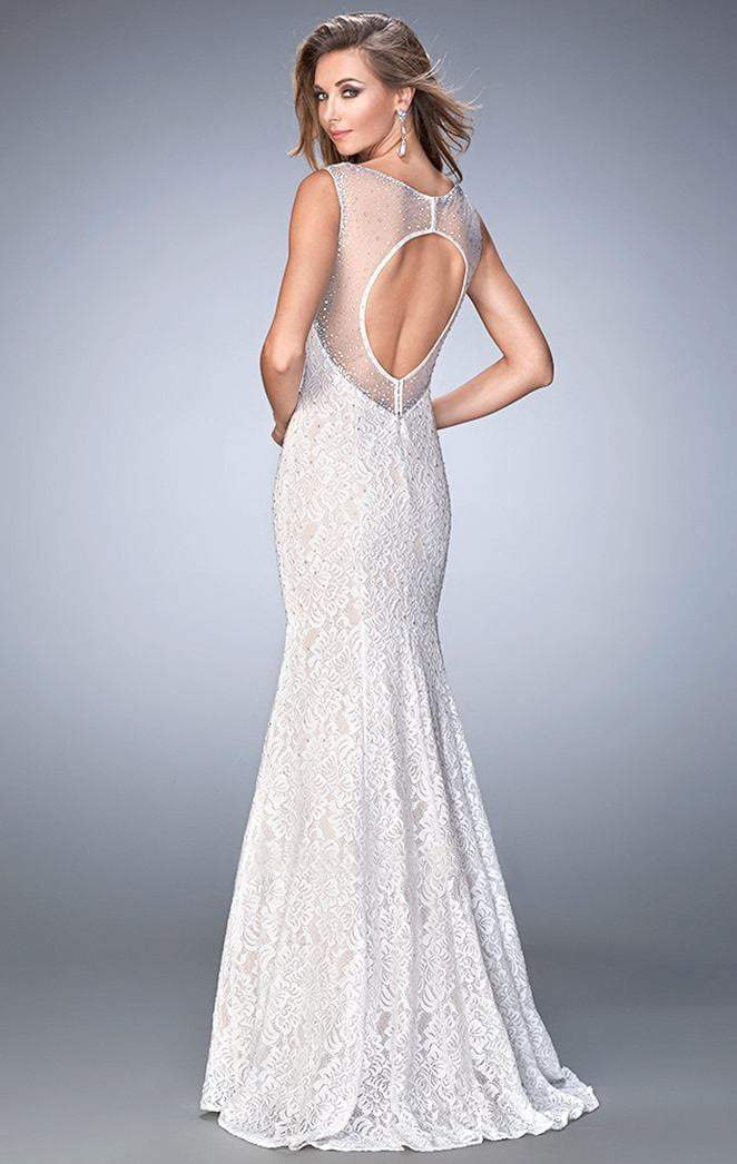 Get ready for everyone to stop and stare when you show up in this La Femme 22314. The illusion jewel neckline has a dazzling sweetheart lining and shines with glittering rhinestone embellishments for a captivating and chic look. This heavenly ensemble glides to the classy full-length mermaid silhouette hem in layers of romantic lace. Experience the outstanding effect in this creation by La Femme. Model is wearing a White/Nude color.