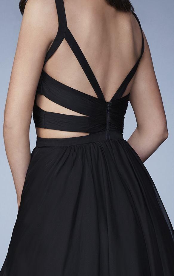 Beam with pride when you wear this ensemble by La Femme 23469. An alluring chiffon dress with a ruched bodice and an A-line skirt. The back is linked, while the front is open creating the illusion of a two-piece style. This dress is also designed with a back zipper closure. This dress by La Femme creates a fun and exciting look.