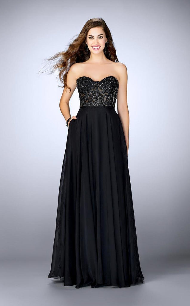 Walk in beauty in this lovely strapless prom dress by La Femme 24318. A beautiful floor length gown of A-Line silhouette, sheer lace top and chiffon skirt with pockets. Features corset boning on the bodice and back. Back zipper closure. This La Femme dress is sure is perfect for that special night event! Model is wearing the Black, Ivory and Garnet colors. Find more Corset Dresses.