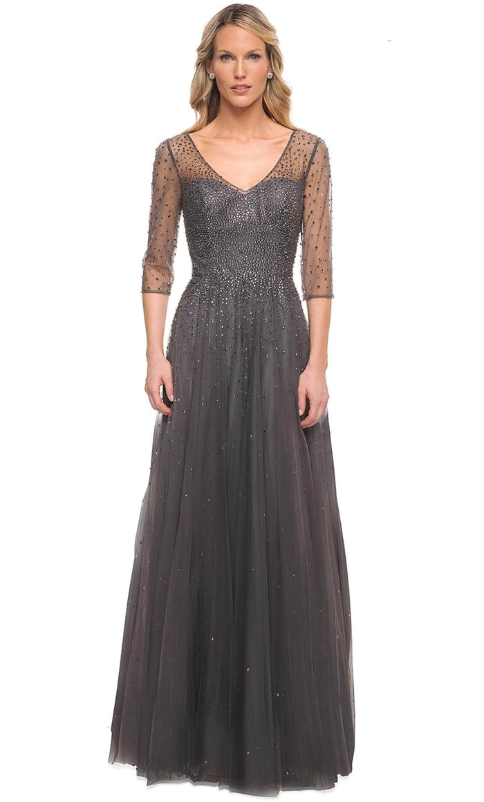 Show your sophisticated sense of style in this evening gown by La Femme 24894. This dress has sheer quarter-length sleeves and a v-neckline. Well textured detail works all over the gown. The bodice is form-fitting with a nipped waist. A dash of stones and sequins adds sparkle. A slim A-line tulle skirt will swing and sway with your every step. Including pockets, this dazzling studded gown will show off your figure! This La Femme design is a simple, chic look for any special occasion. Model is wearing a Gunmetal and Navy color.