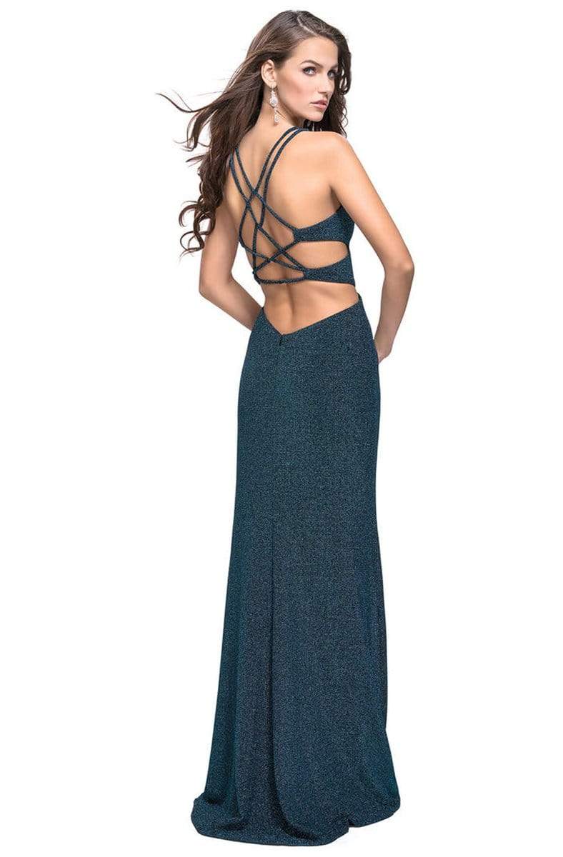 Alluringly designed on a glitter jersey fabric that is accented with seams, this elegant piece flaunts a plunging sweetheart neckline framed with slender straps and sexy angular side cutouts. Crafted with a spectacle of crisscrossed straps on a low plunging back, the sheath skirt breaks with a high slit as it fluidly streams down to a rich sweep train.