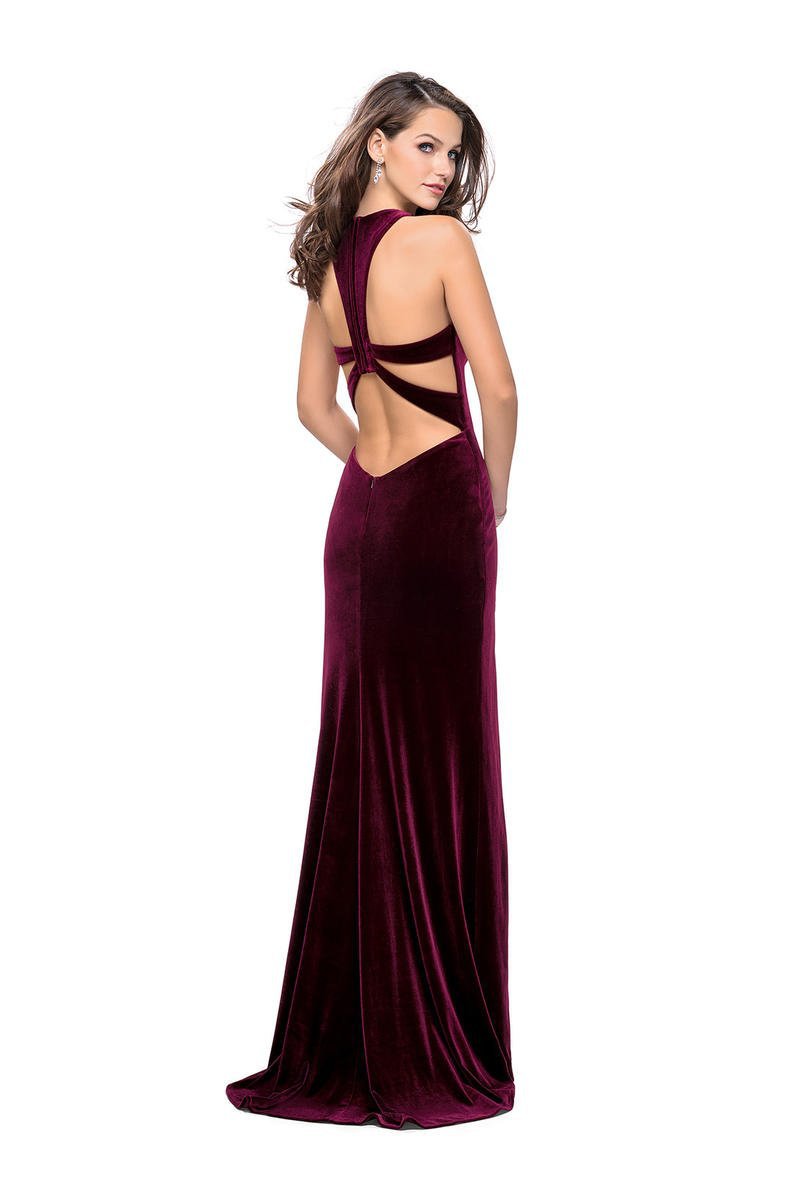 Project stunning magnetism as you get into the spirit of the celebration in this gorgeous La Femme 25363 creation. Wrapped in a rich velvet fabric accented with sculpting seams, this posh piece presents a plunging sweetheart neckline shrouded with an illusion inset. Designed with a sexy racerback as straps splay towards the sides, a deep diamond cutout accents the small of the back. The sheath skirt breaks away with a high slit as it cascades fluidly down to create a subtle train. Go out and paint the town red in this timeless La Femme masterpiece.