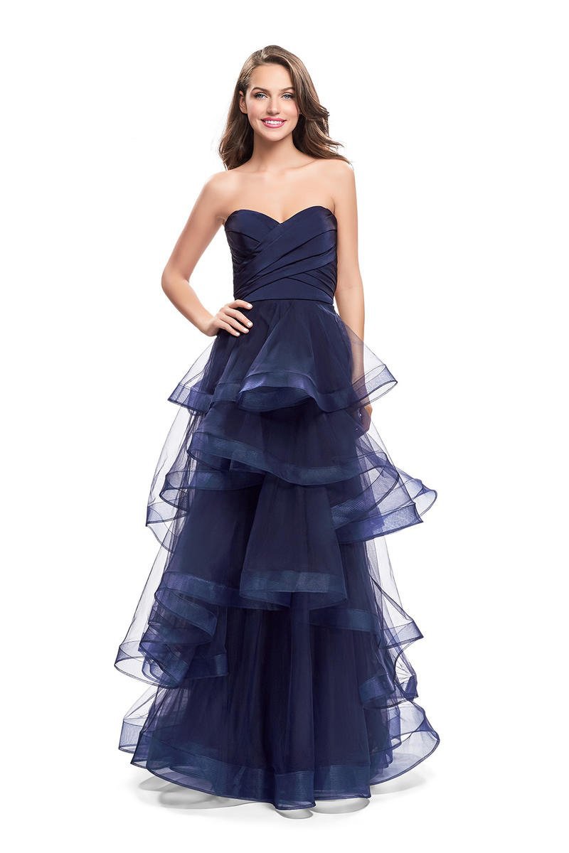Get ready for everyone to stop and stare when you show up in this beautiful La Femme 25430 evening dress. A strapless bodice tops this stunner with a sweetheart neckline and ruched criss cross bodice while the open back has double criss cross straps. The exquisite tulle skirt cascades in ethereal of layers to a floor length hem. A back zipper closure secures this ensemble. This La Femme style definitely flatters from every angle.